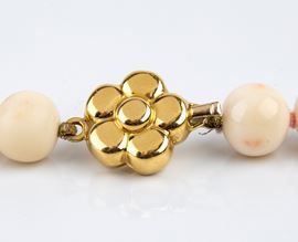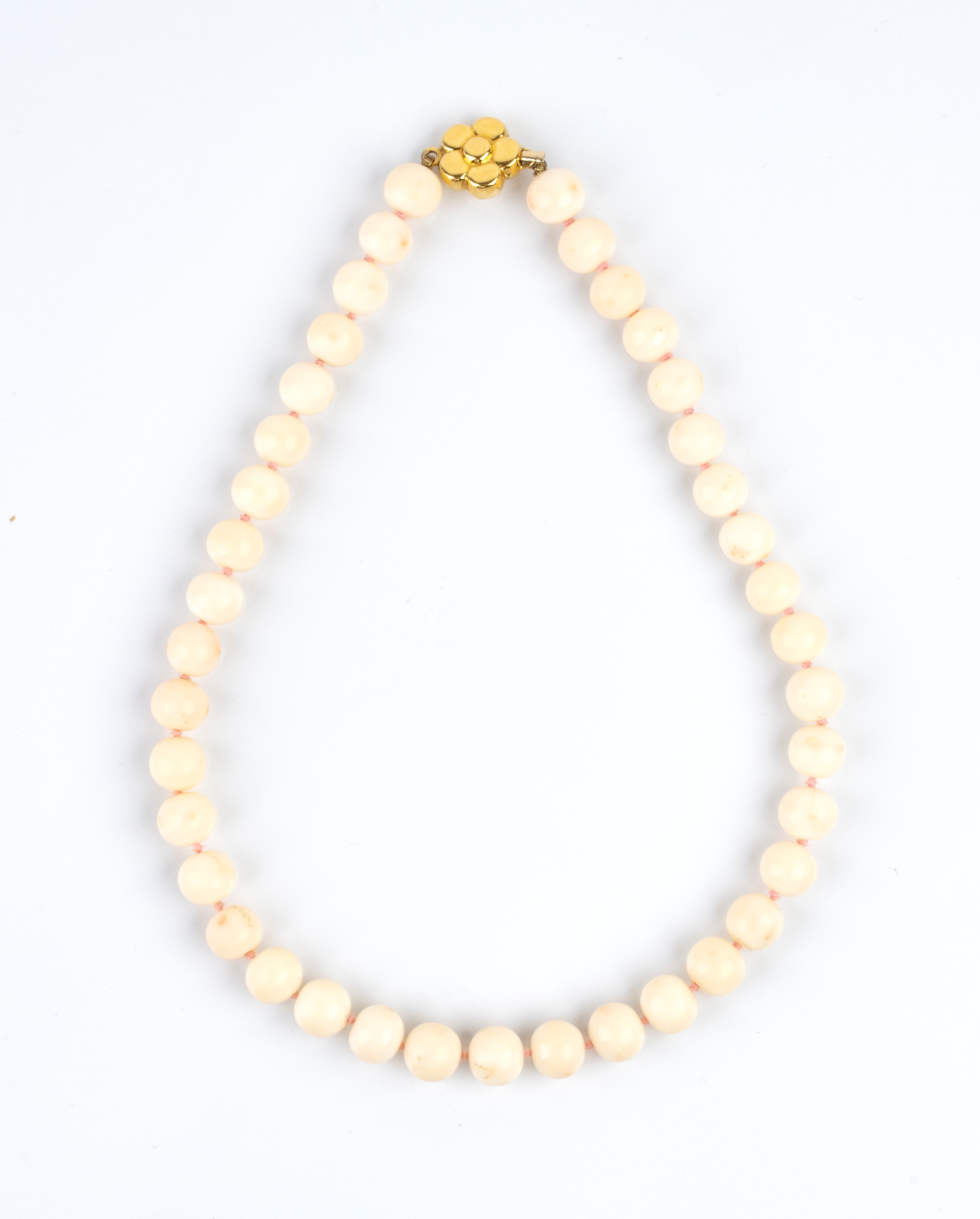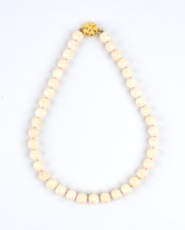 ad un filo di perle coltivate d'acqua salata disposte in gradazione, fermezza in oro giallo ed argento incastonata con pavé di diamanti taglio a rosa.