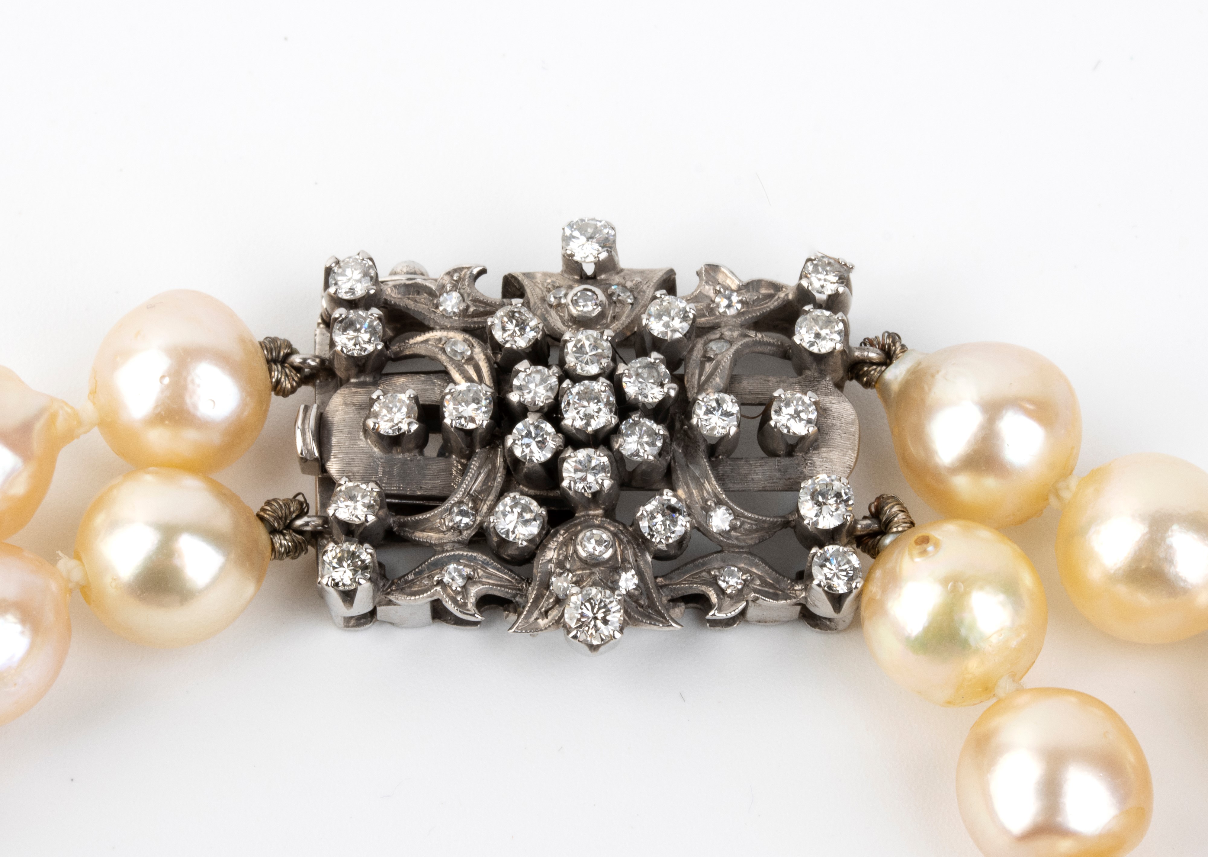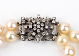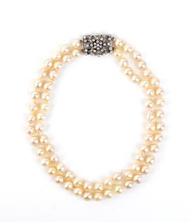 a due fili di perle coltivate d'acqua salata con fermezza in oro bianco 18k, punteggiata da diamanti rotondi taglio brillante e taglio huit-huit, stimati per un peso totale di circa 2,00 ct, colore G- H, purezza VS-SI.