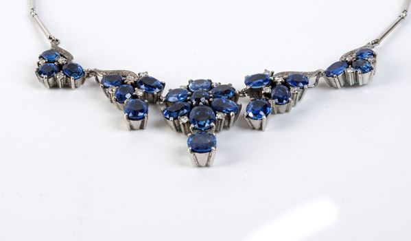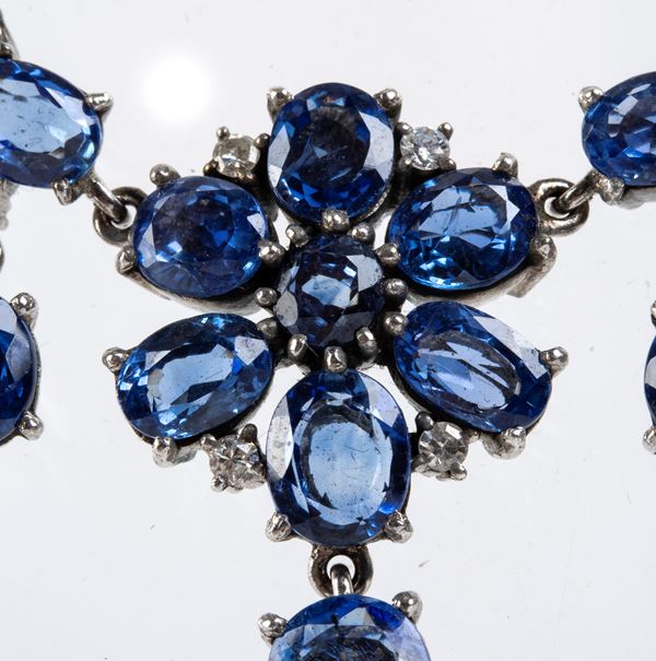 catena in elementi a barretta in oro bianco, sezione centrale in argento con motivo floreale centrale in zaffiri e diamanti.