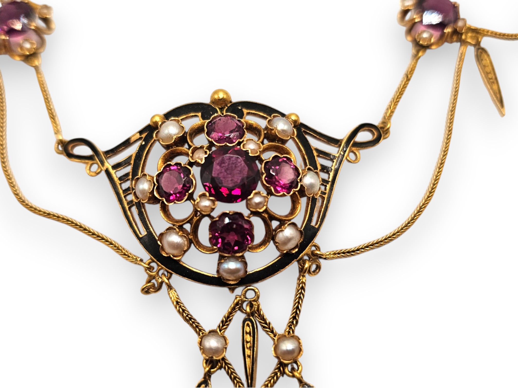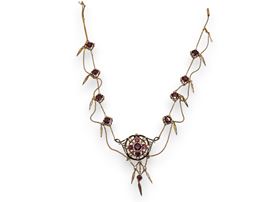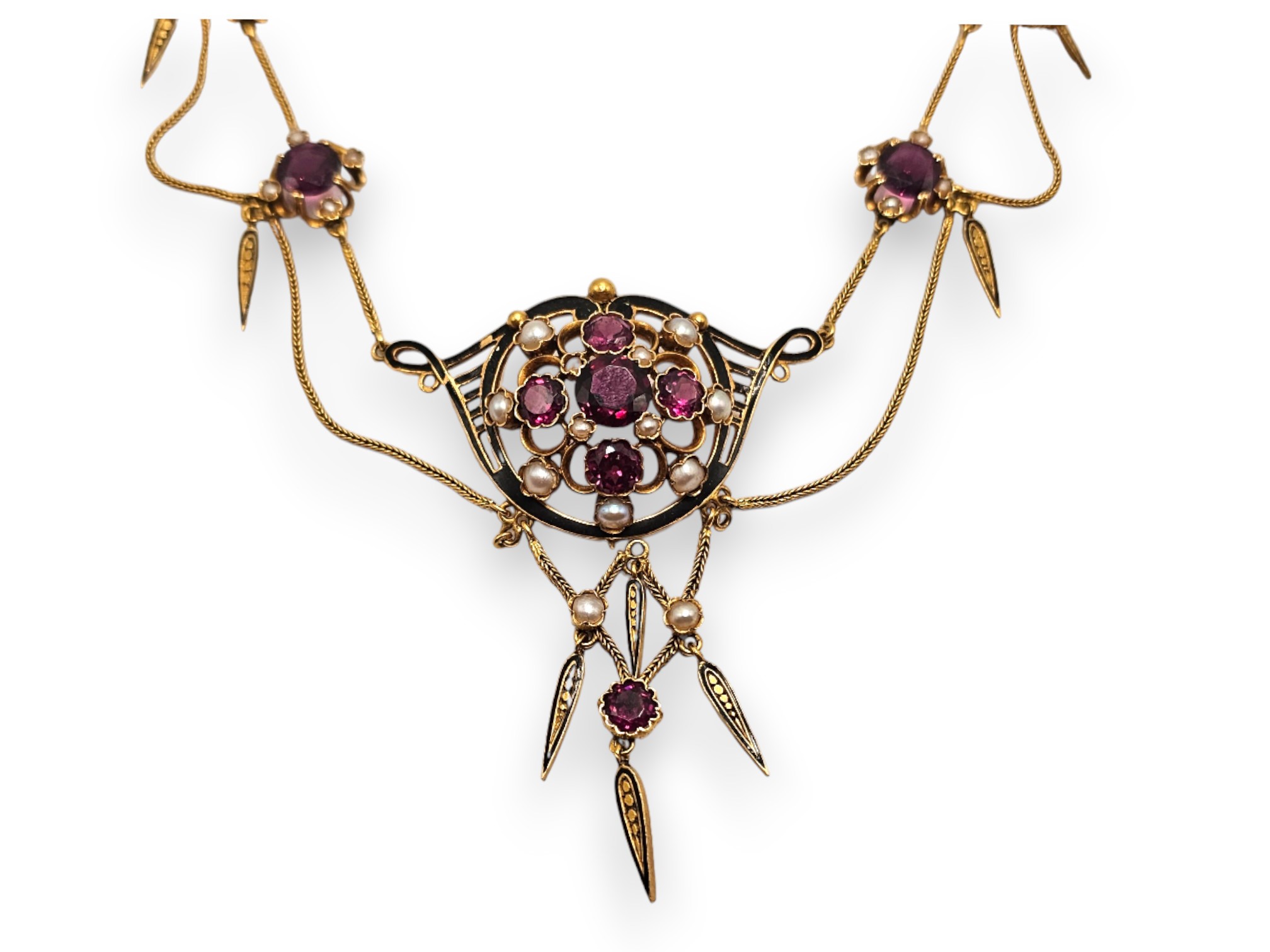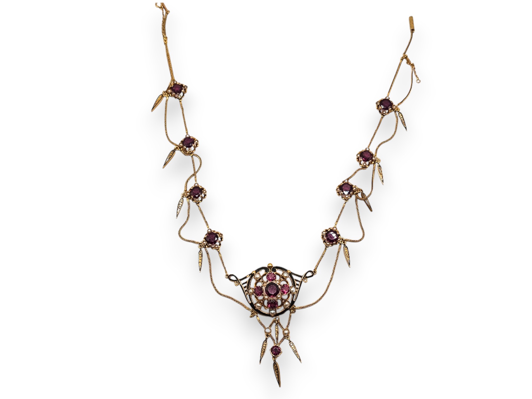 collana antica in stile vittoriano o edoardiano, decorata con granati e perle, caratterizzata da un design a festone o "lavalier", popolare tra la fine del XIX e l'inizio del XX secolo.