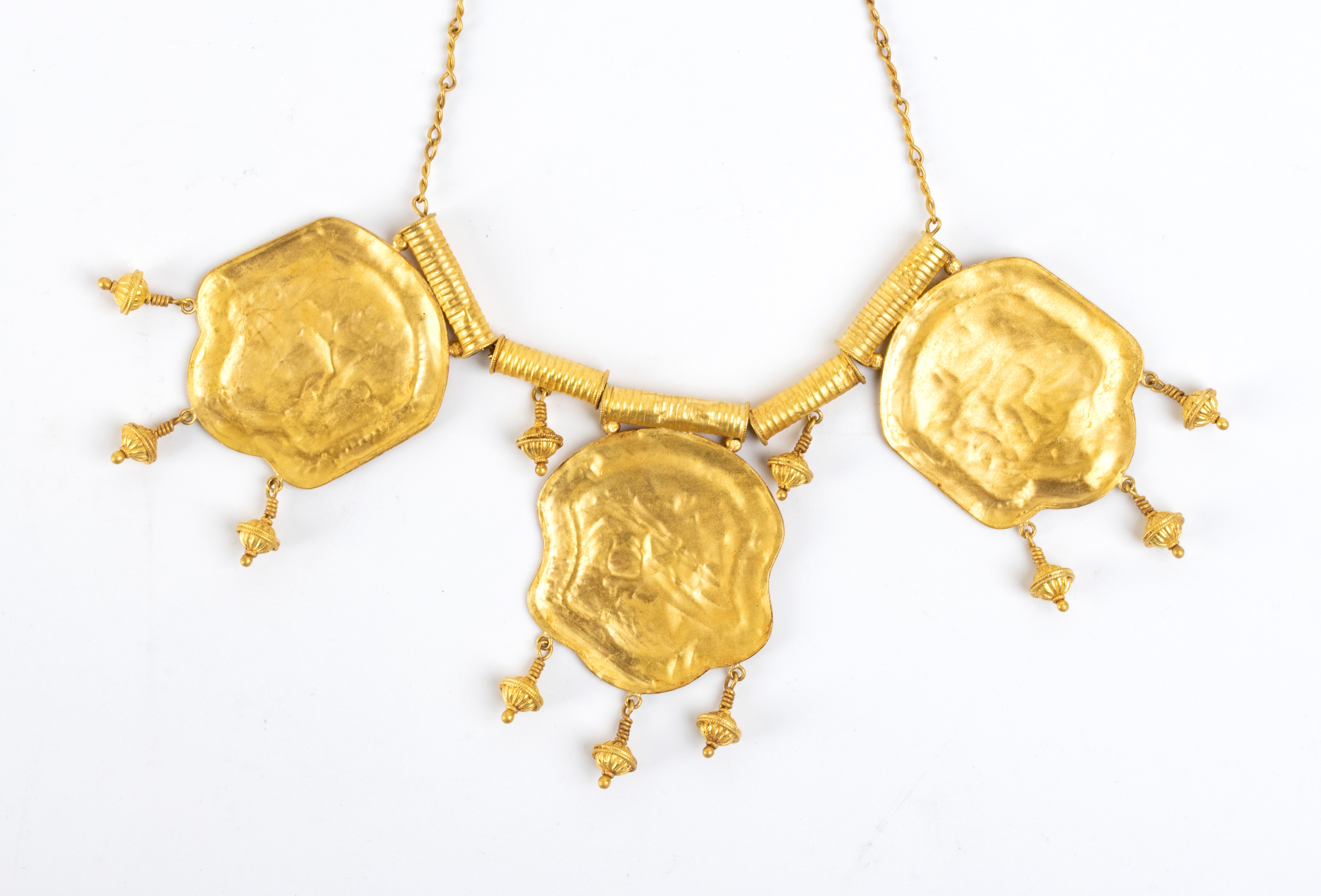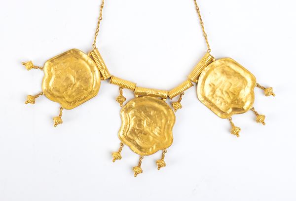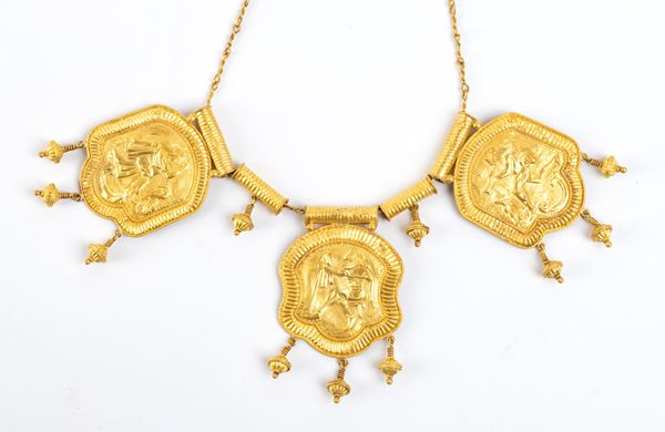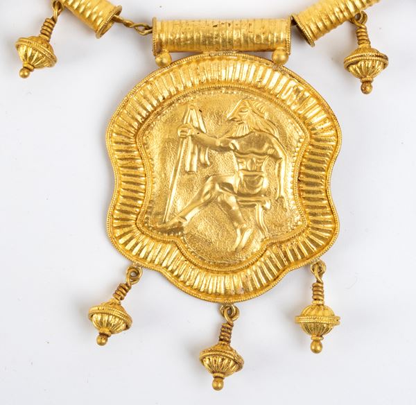Tre medaglioni pendenti raffiguranti scene mitologiche, alternate da barilotti in oro inciso.
