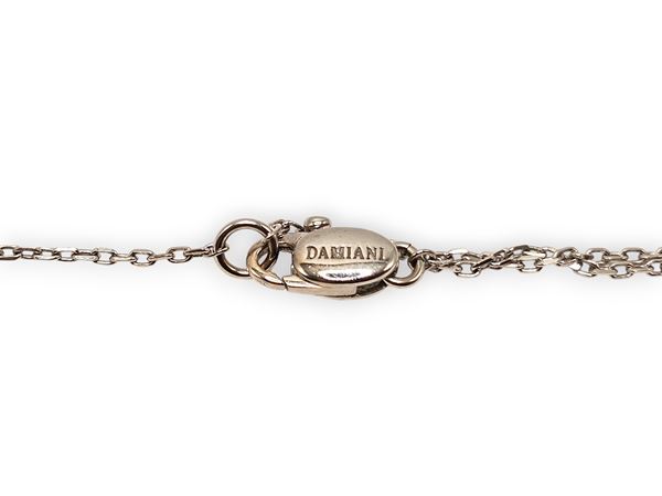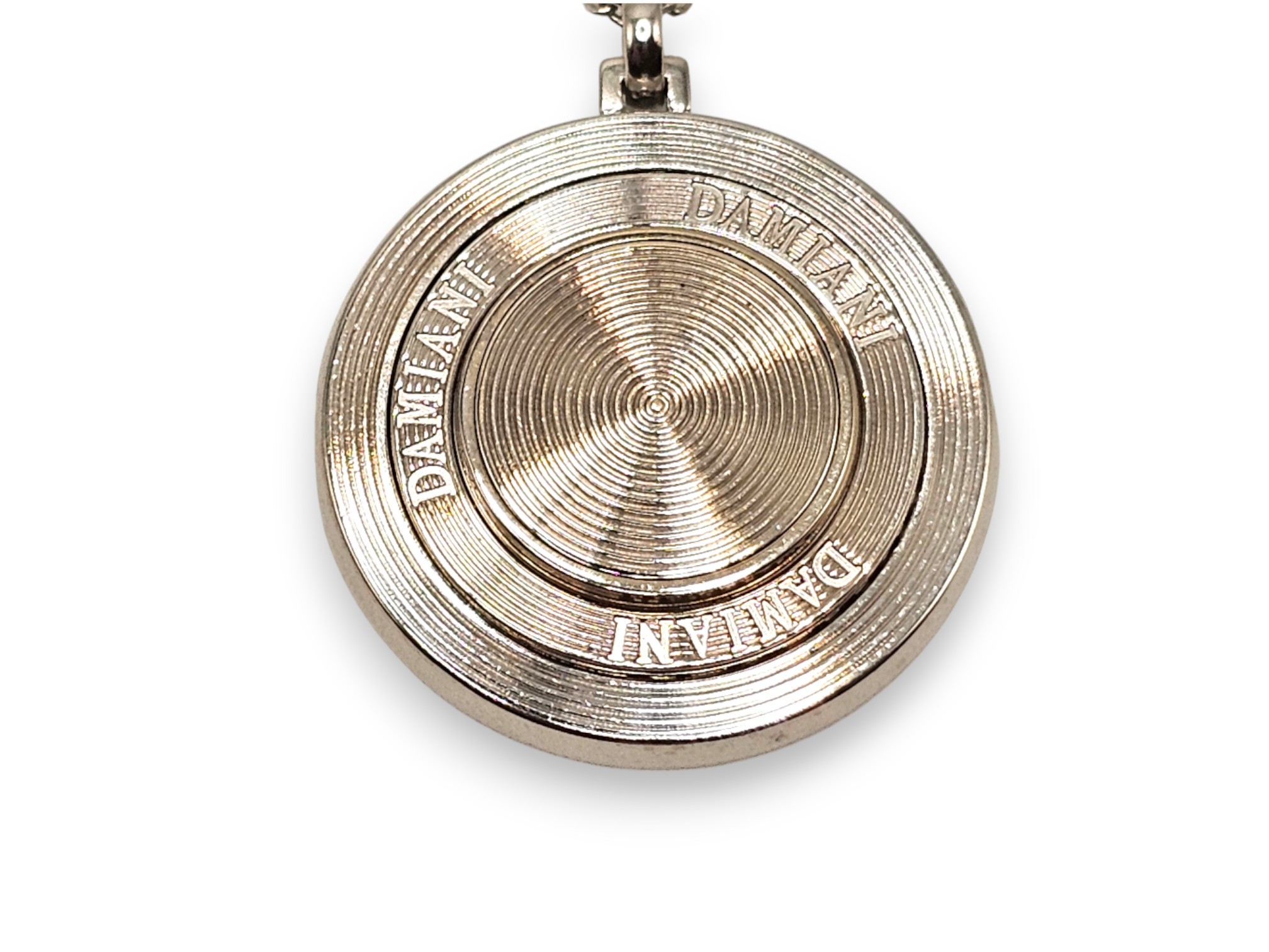 in oro bianco 18k, pendente rotondo con cornice di diamanti con al centro c'è un disco rotante con piccolo pavè di diamanti ed iscrizione DAMIANI. Il disco è sospeso ad una sottile catena a maglia forzatina. Firmato: "DAMIANI".