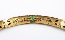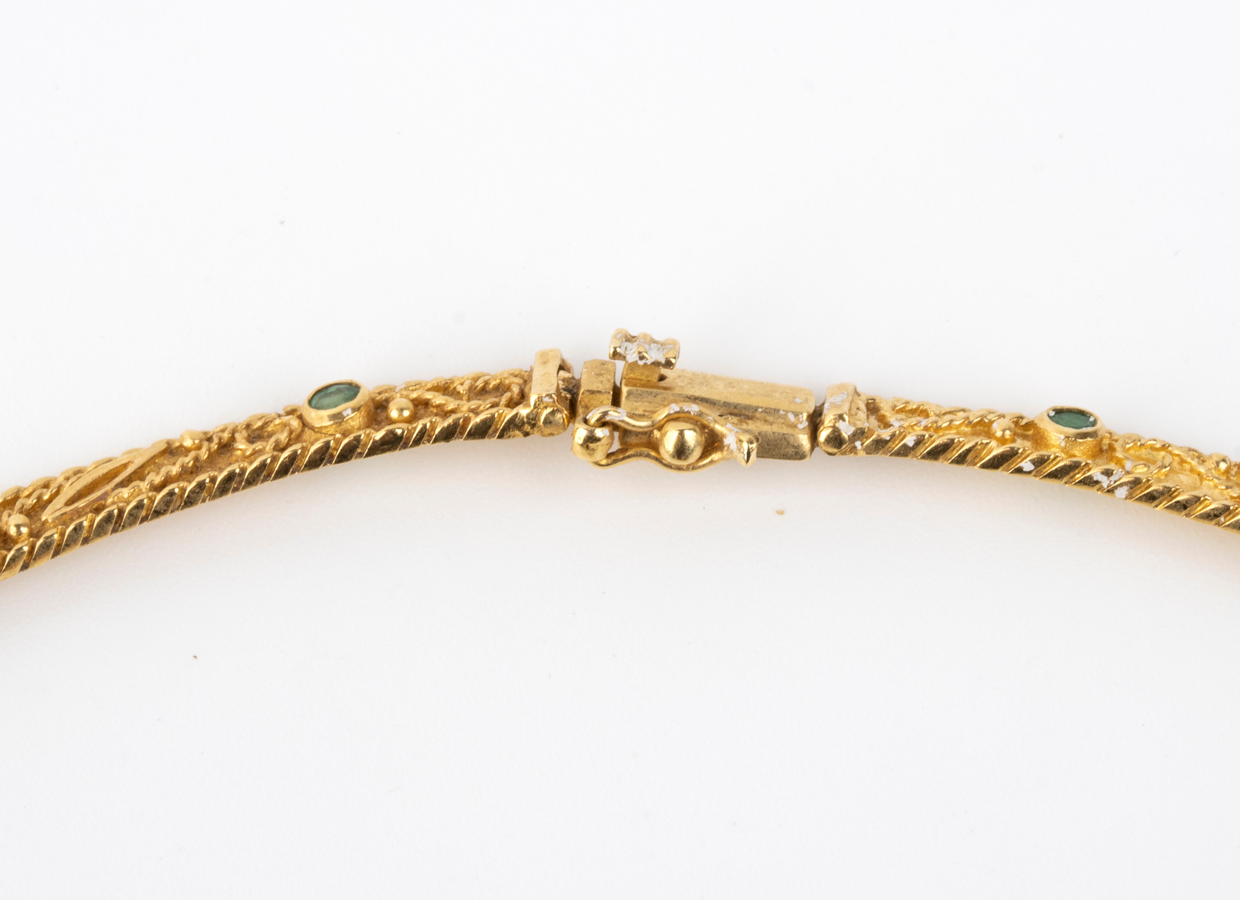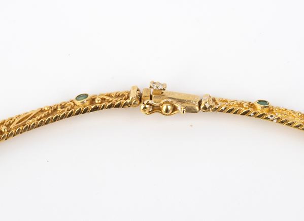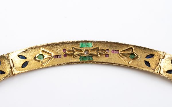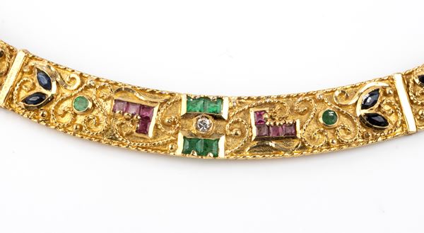 in oro giallo 18k, il girocollo i linea di elementi geometrici piatti, decorati con motivi a cordonetto ed impreziositi da navette di zaffiro, rubini, smeraldi, diamanti e navette di rubini.