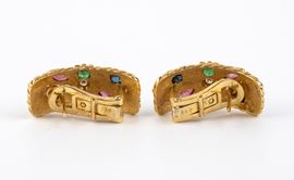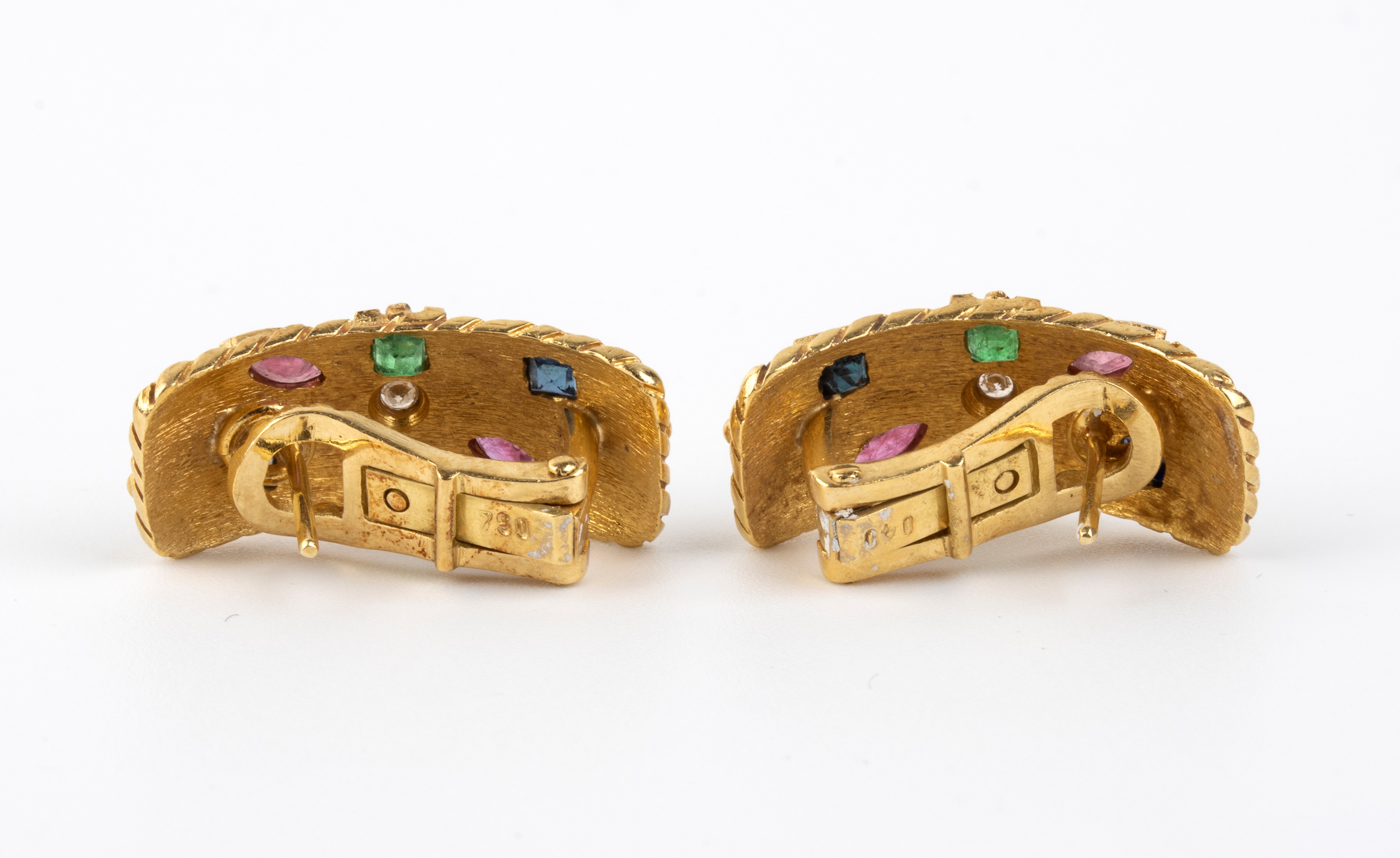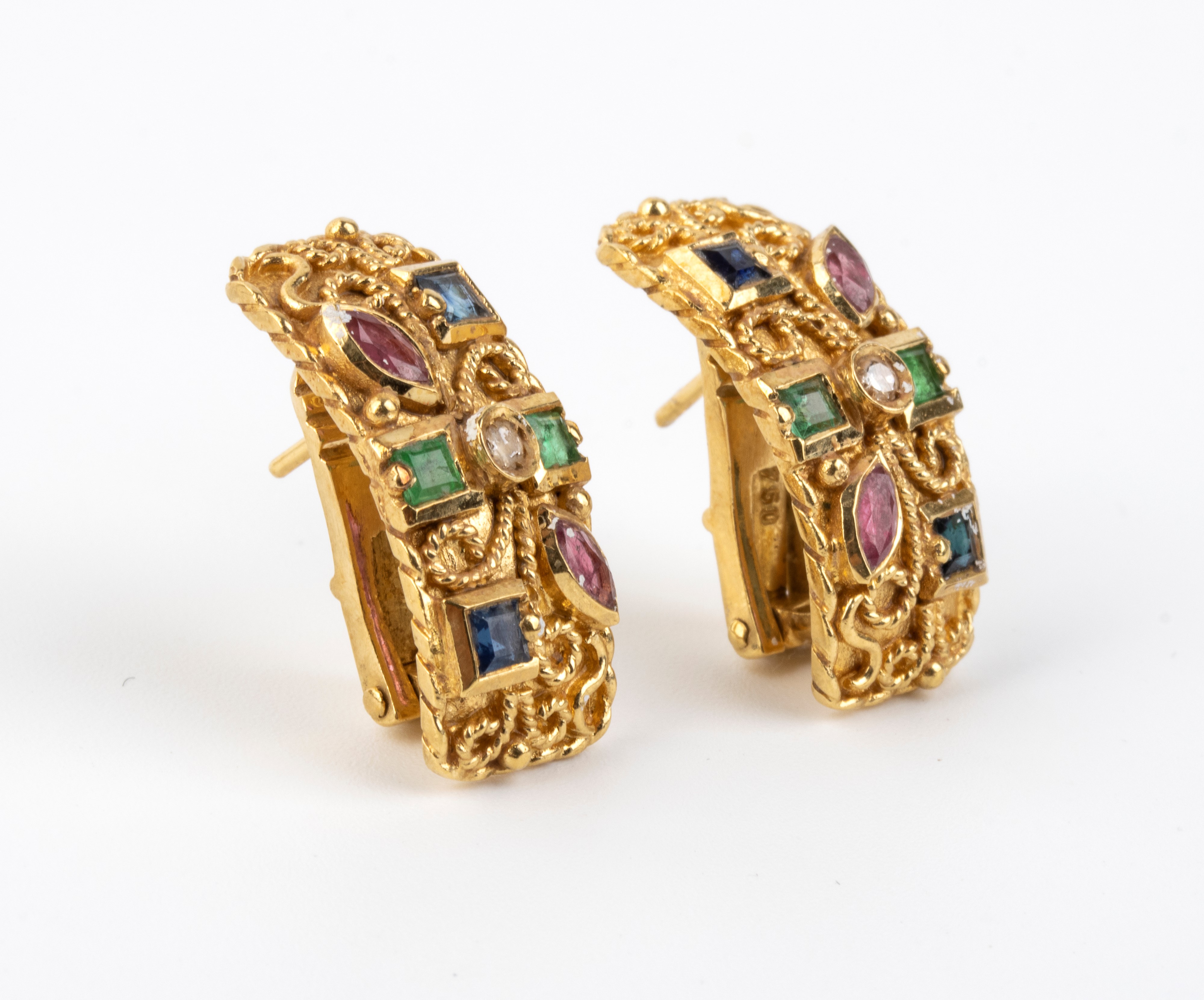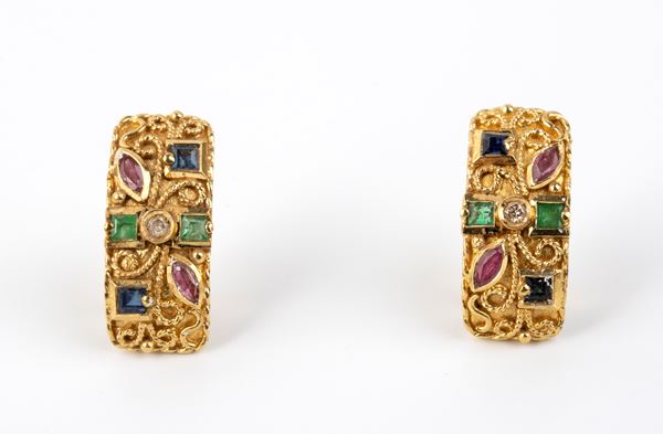 Demi-parure composta da un girocollo ed un paio di orecchini in oro con diamanti, zaffiri, rubini e smeraldi