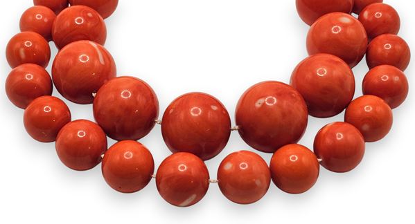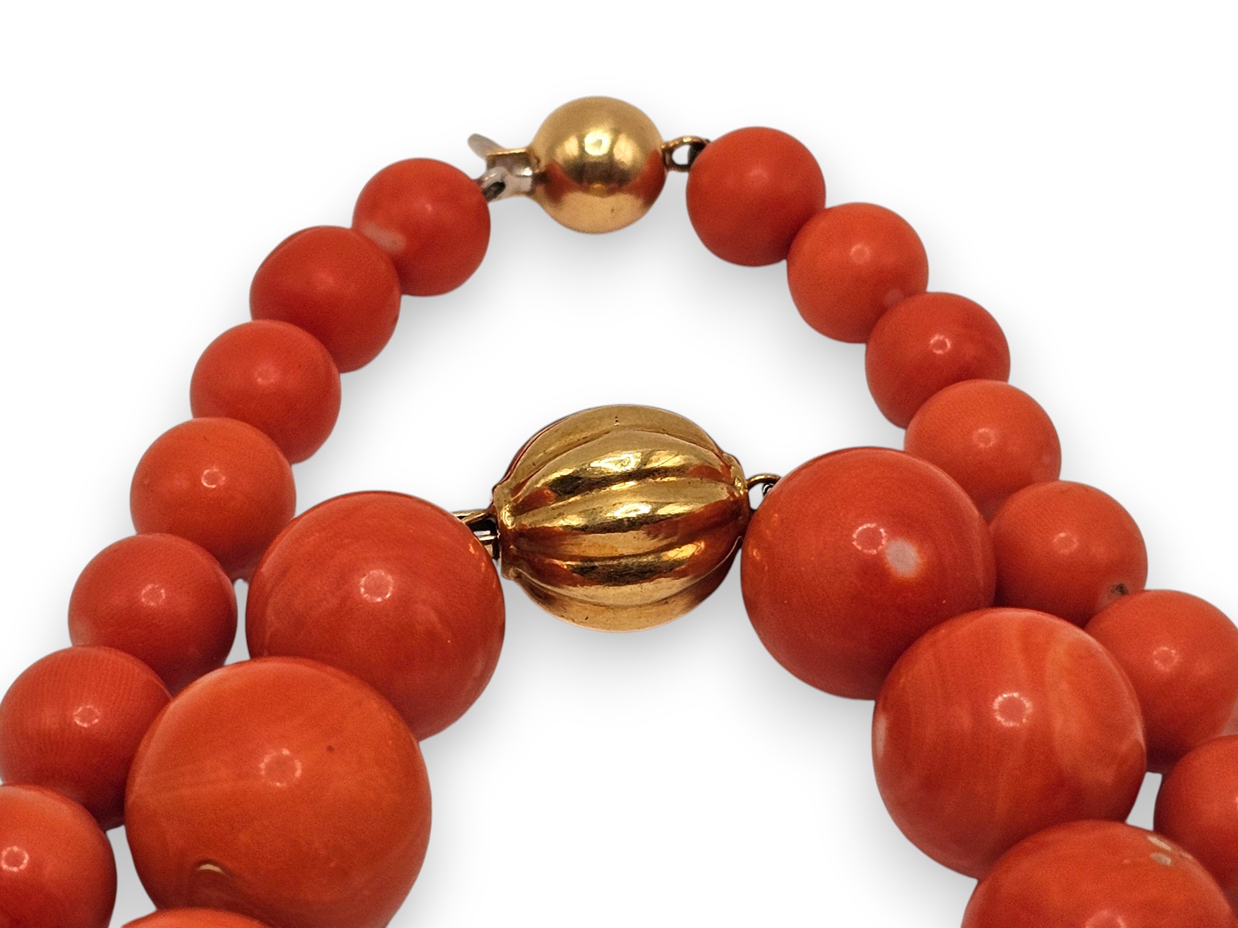 ciascuna ad un filo di sfere di corallo Cerasuolo (Corallium Elatius), disposte in gradazione con chiusura on oro giallo e chiusura con gancio a cassetto.