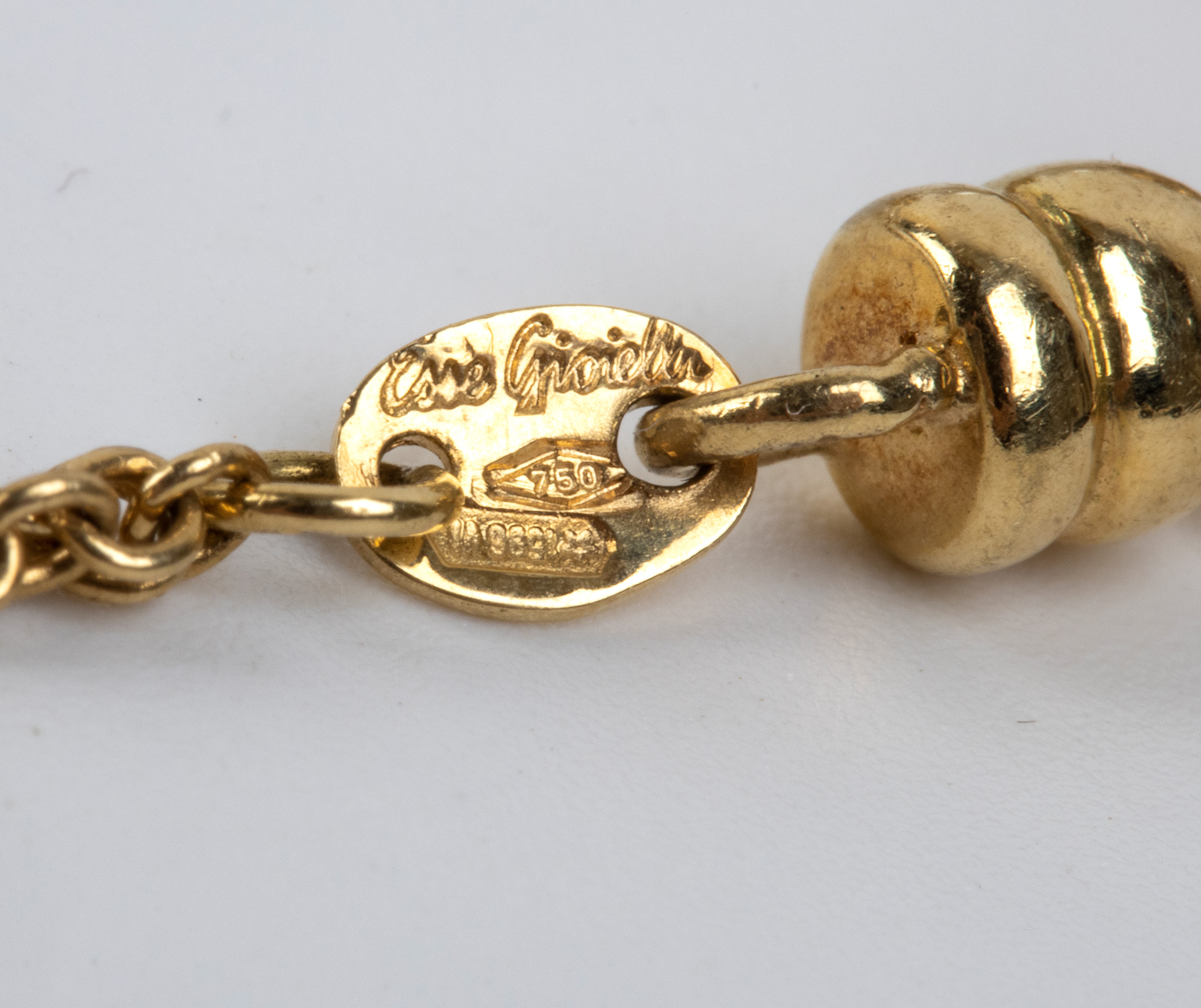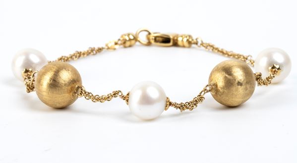 doppia catena a maglia forzatina in oro giallo 18k, interrotta da sfere in oro e perle d'acqua dolce. Firmato "ESSE GIOIELLI".