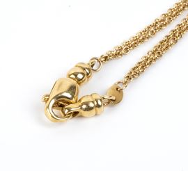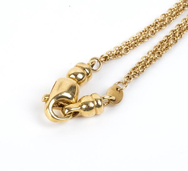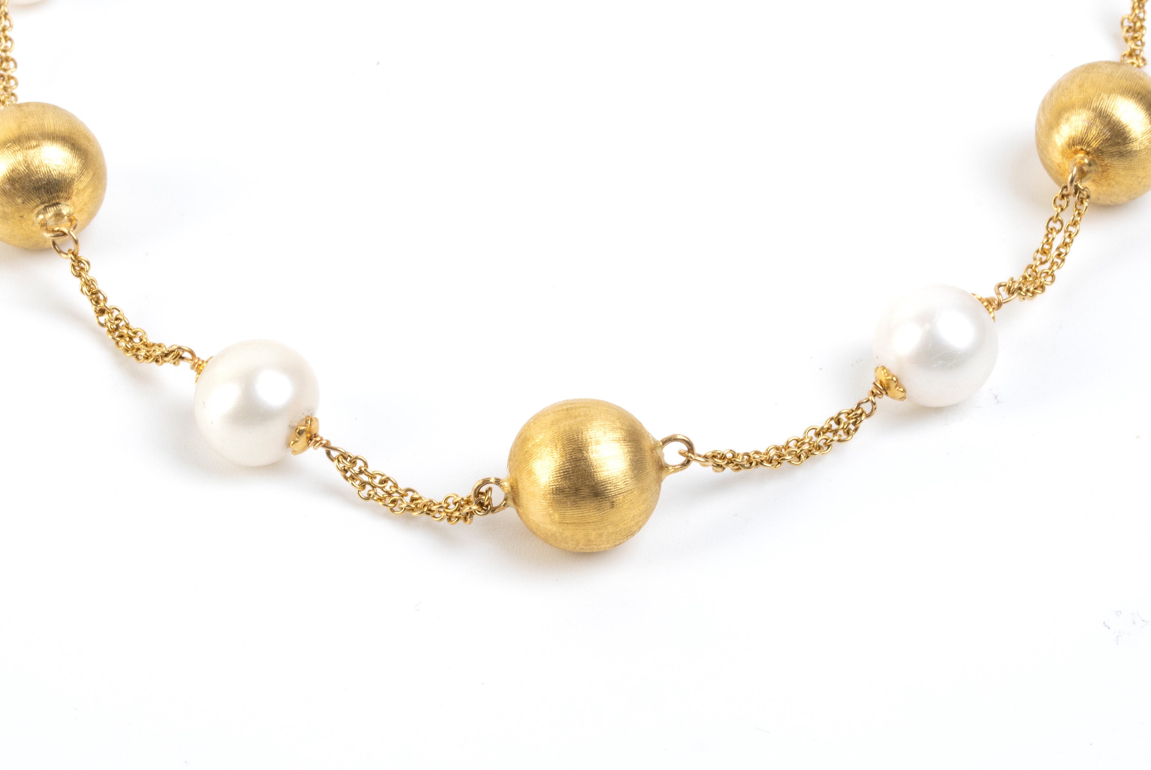 doppia catena a maglia forzatina in oro giallo 18k, interrotta da sfere in oro e perle d'acqua dolce. Firmato "ESSE GIOIELLI".