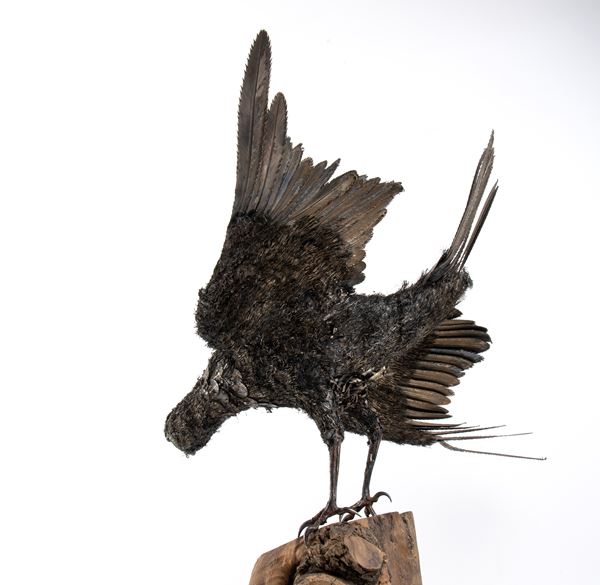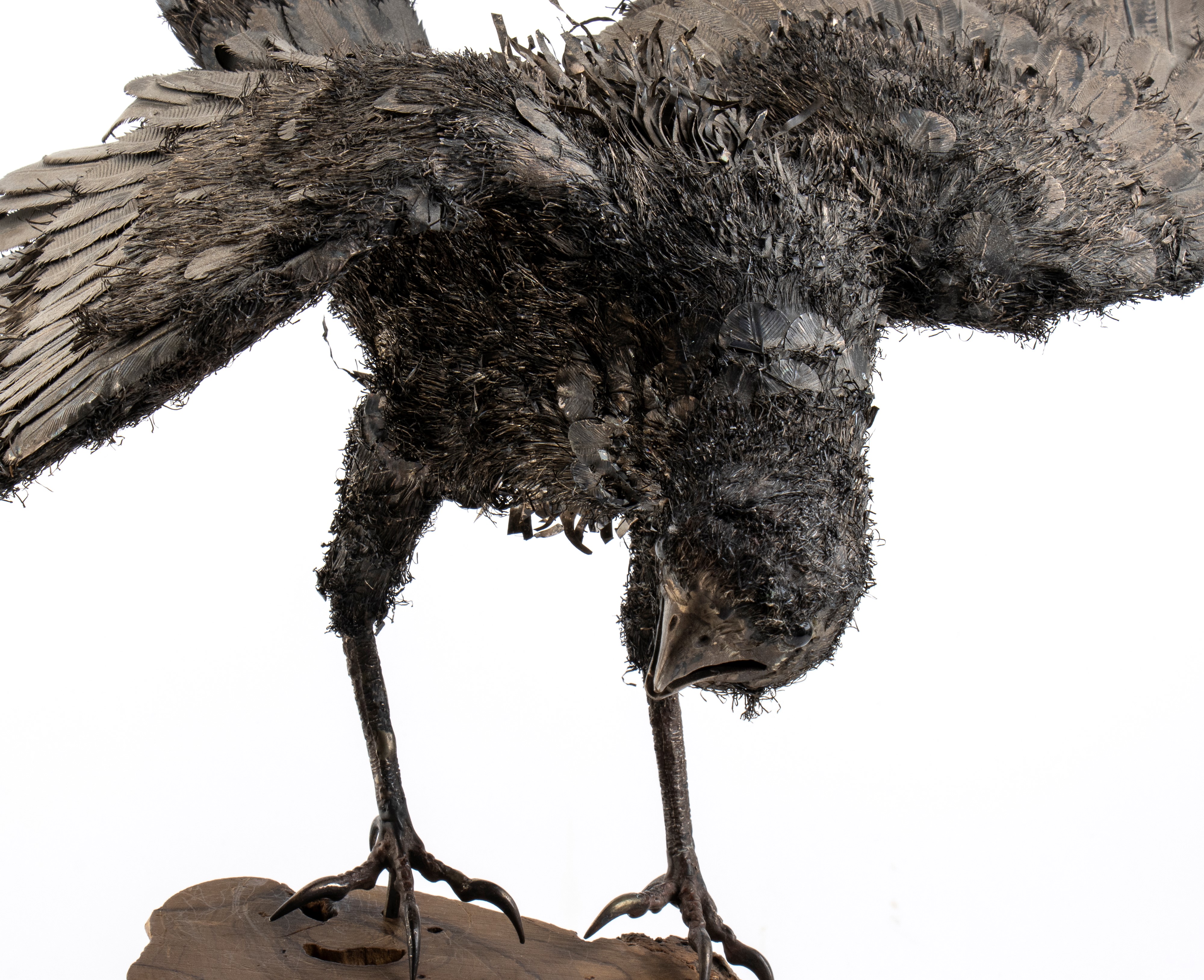 reso in maniera espressionistica e dettagliata: il corpo è formato da fitti filamenti o fibre metalliche, che simulano un piumaggio denso e scuro. Le grandi ali sono aperte e realizzate con lamine in argento lisce che imitano le penne remiganti, creando un notevole contrasto tattile e visivo. La figura poggia con gli artigli su un tronco in legno.