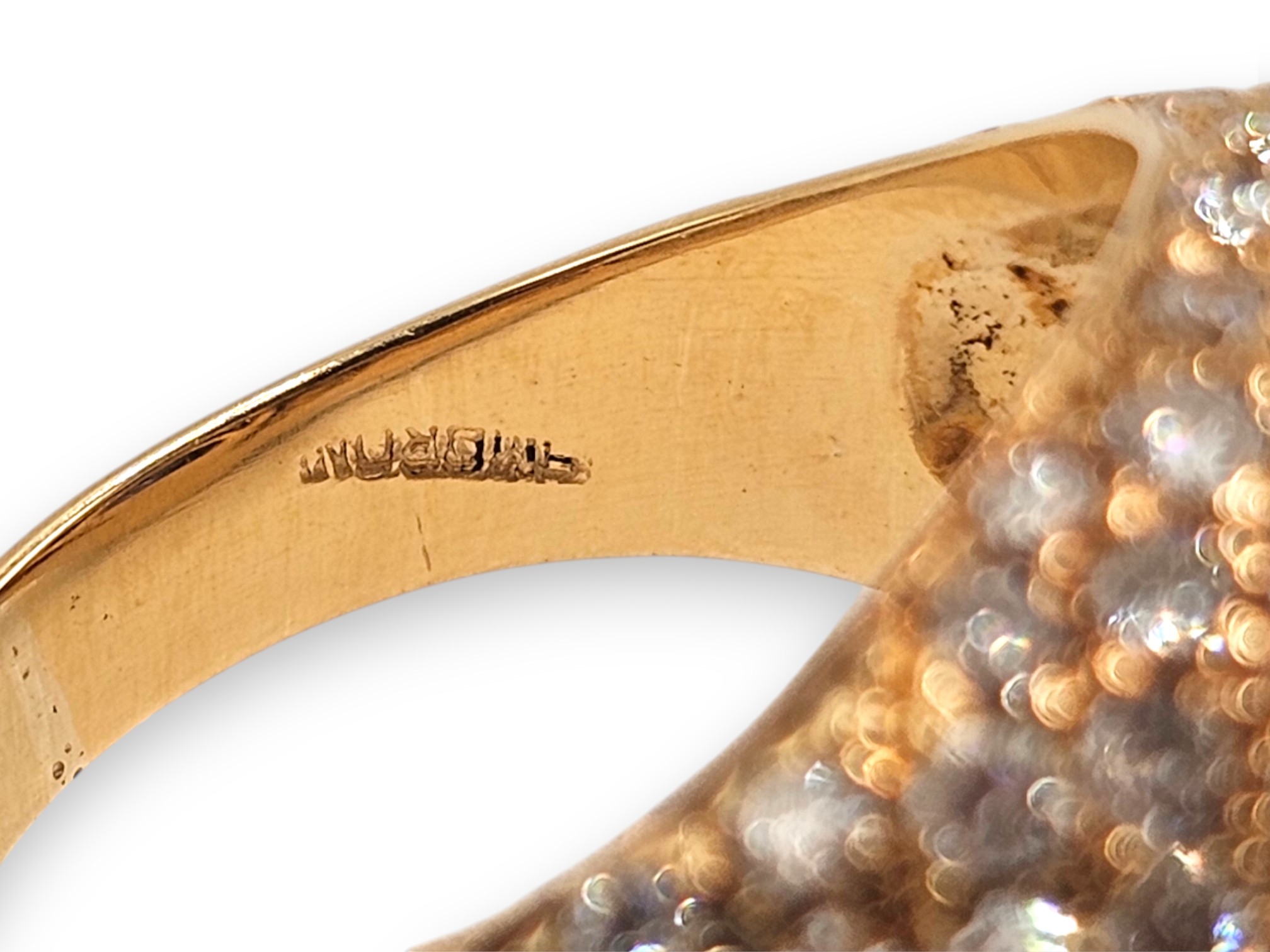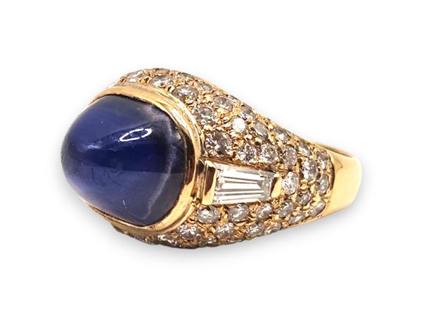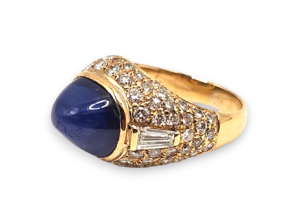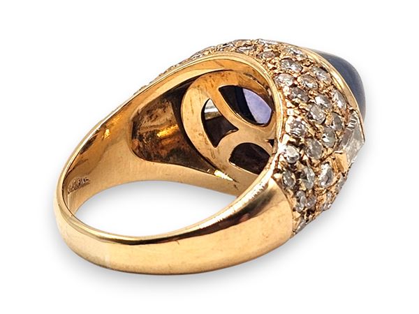 in oro giallo 18k, con voluminosa montatura a forma di cupola, che si assottiglia verso la base, pensata per mettere in risalto la gemma centrale, uno zaffiro ovale taglio cabochon, affiancato da coppia di diamanti taglio tapered, la montatura è impreziosita da pavè di diamanti taglio brillante. Firmato "F. MORONI".