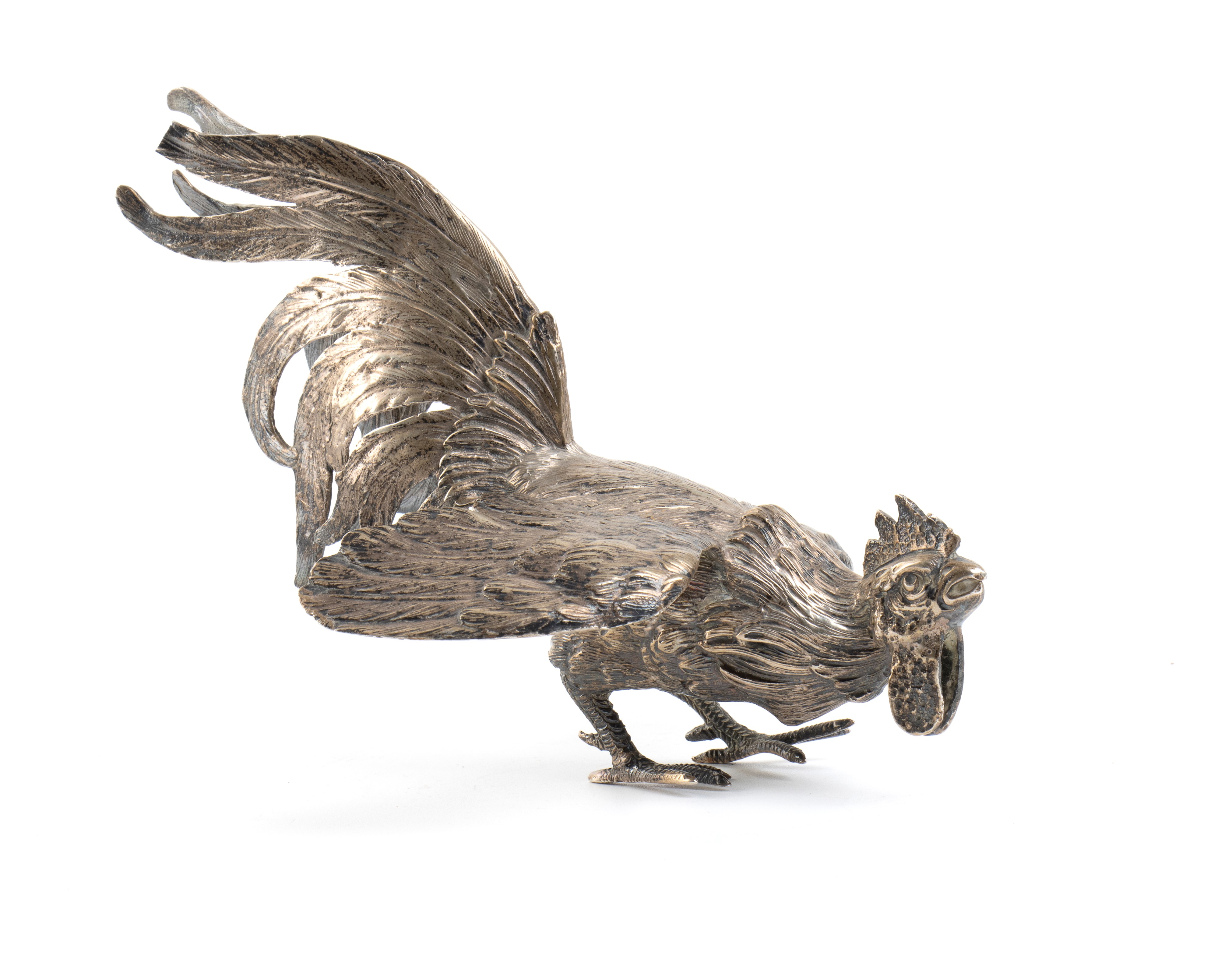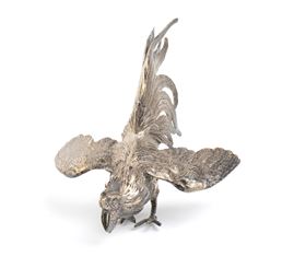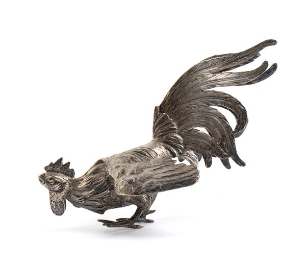 realizzato a fusione, rappresentato in posa dinamica, con il corpo proteso in avanti e la testa abbassata, quasi nell'atto di beccare o di un'azione di difesa.