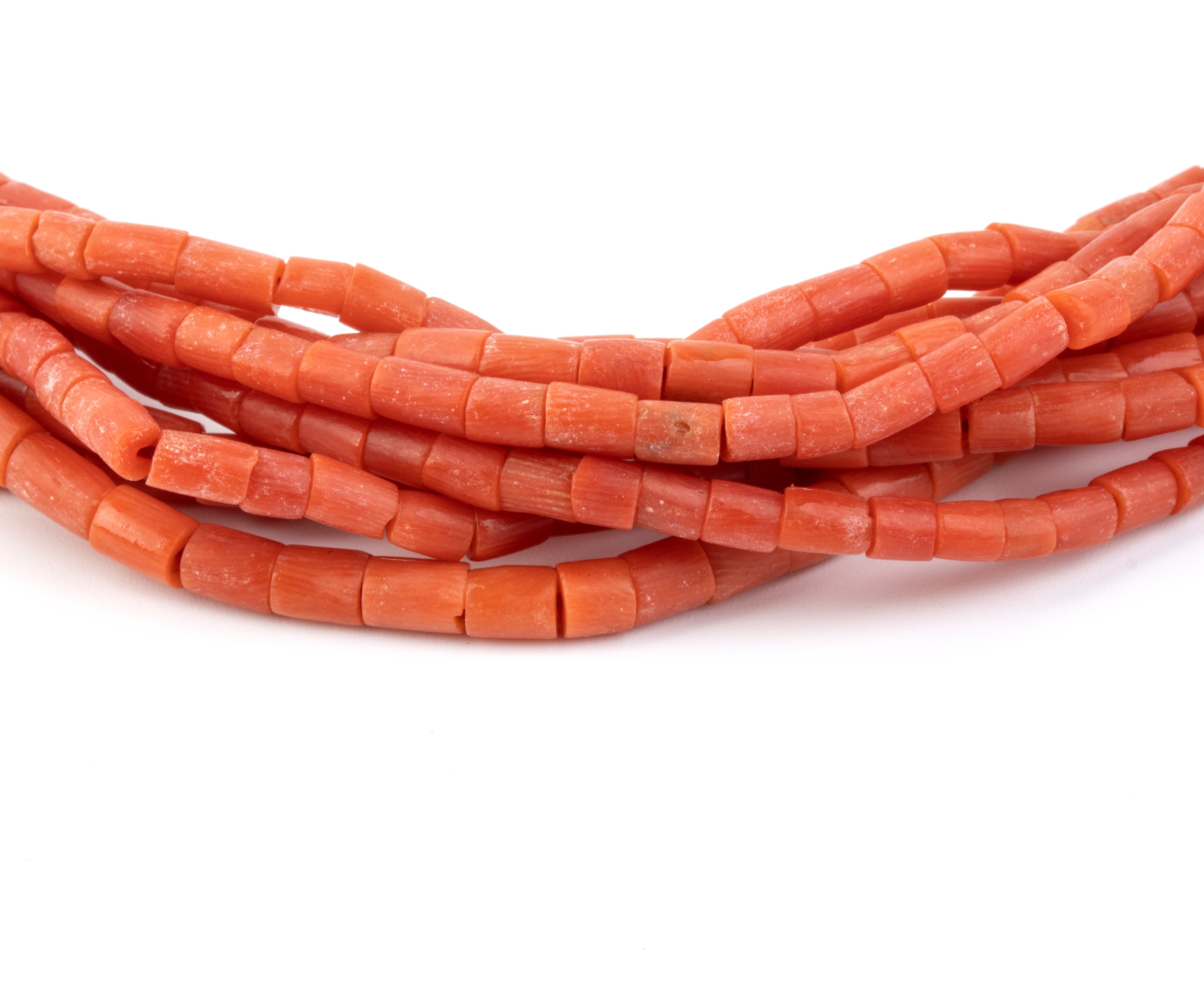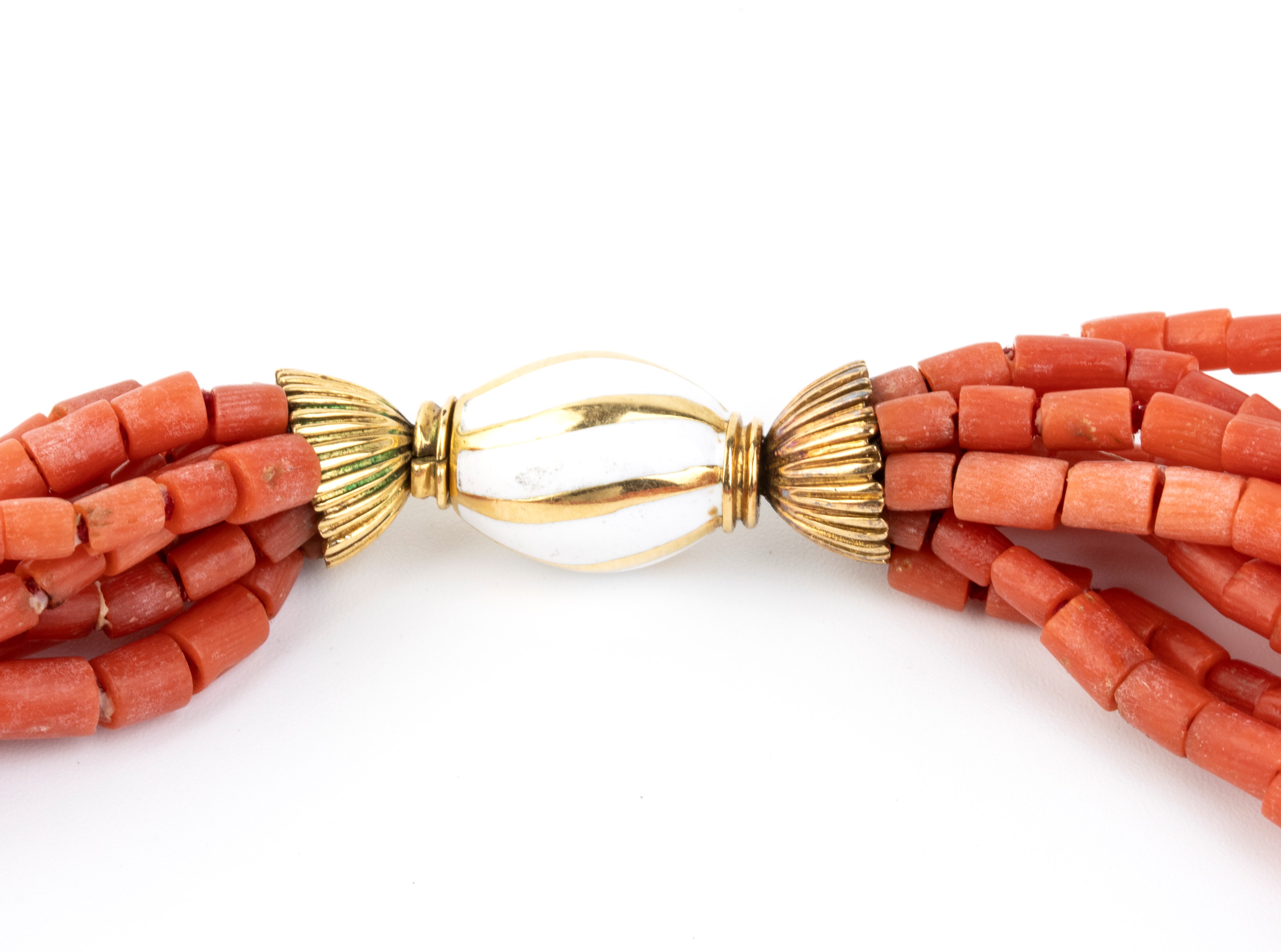 a sei fili di cilindretti di corallo Mediterraneo (Corallium Rubrum) con fermezza geometrica in oro 18k decorata con smalto.