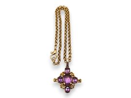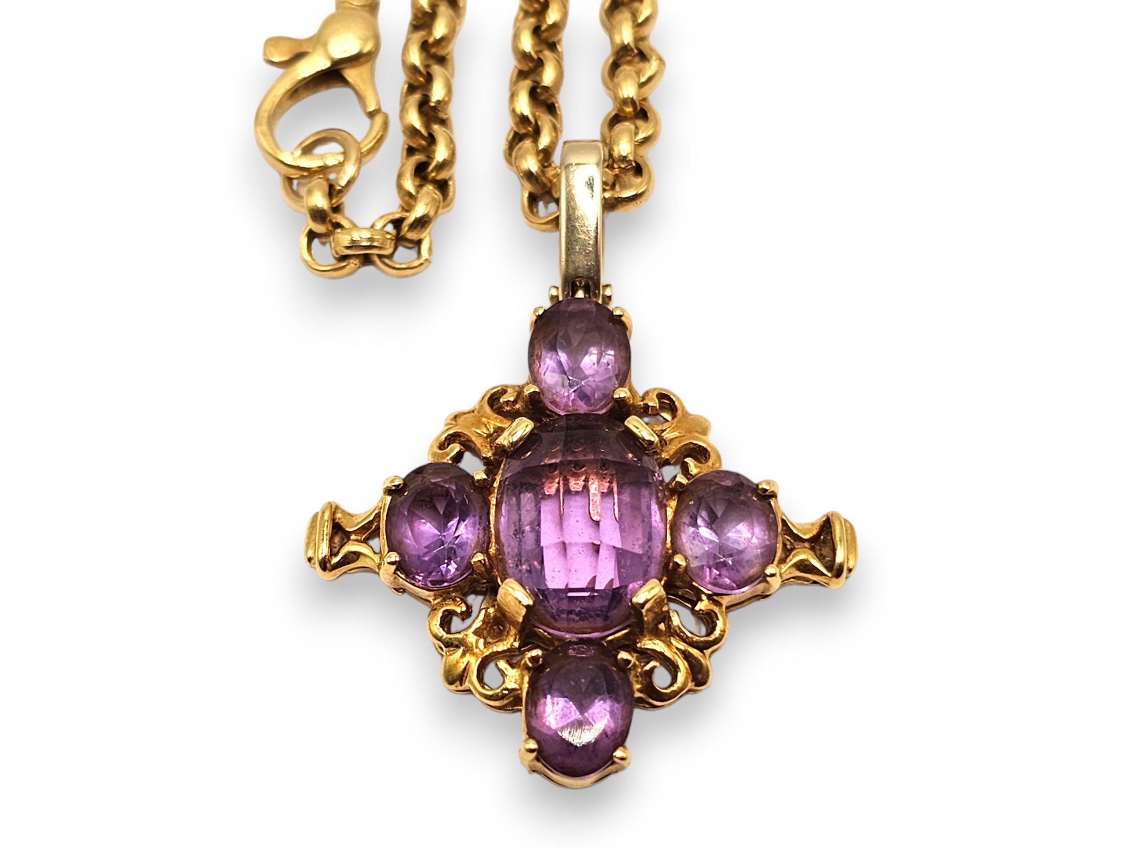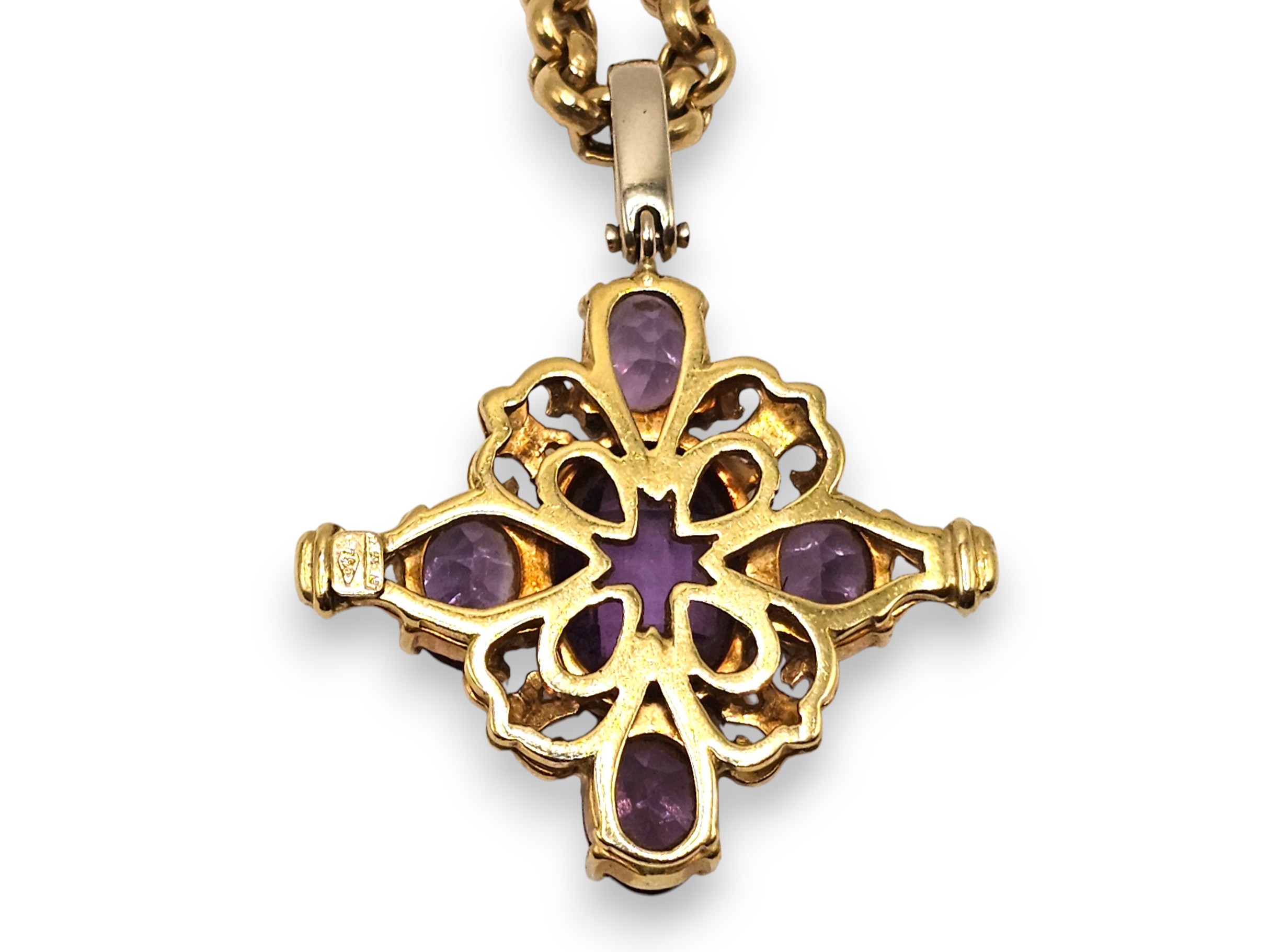 catena a maglia rolò in oro giallo 18k a cui è sospeso un pendente a forma di croce, incastonato con ametiste.