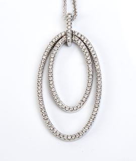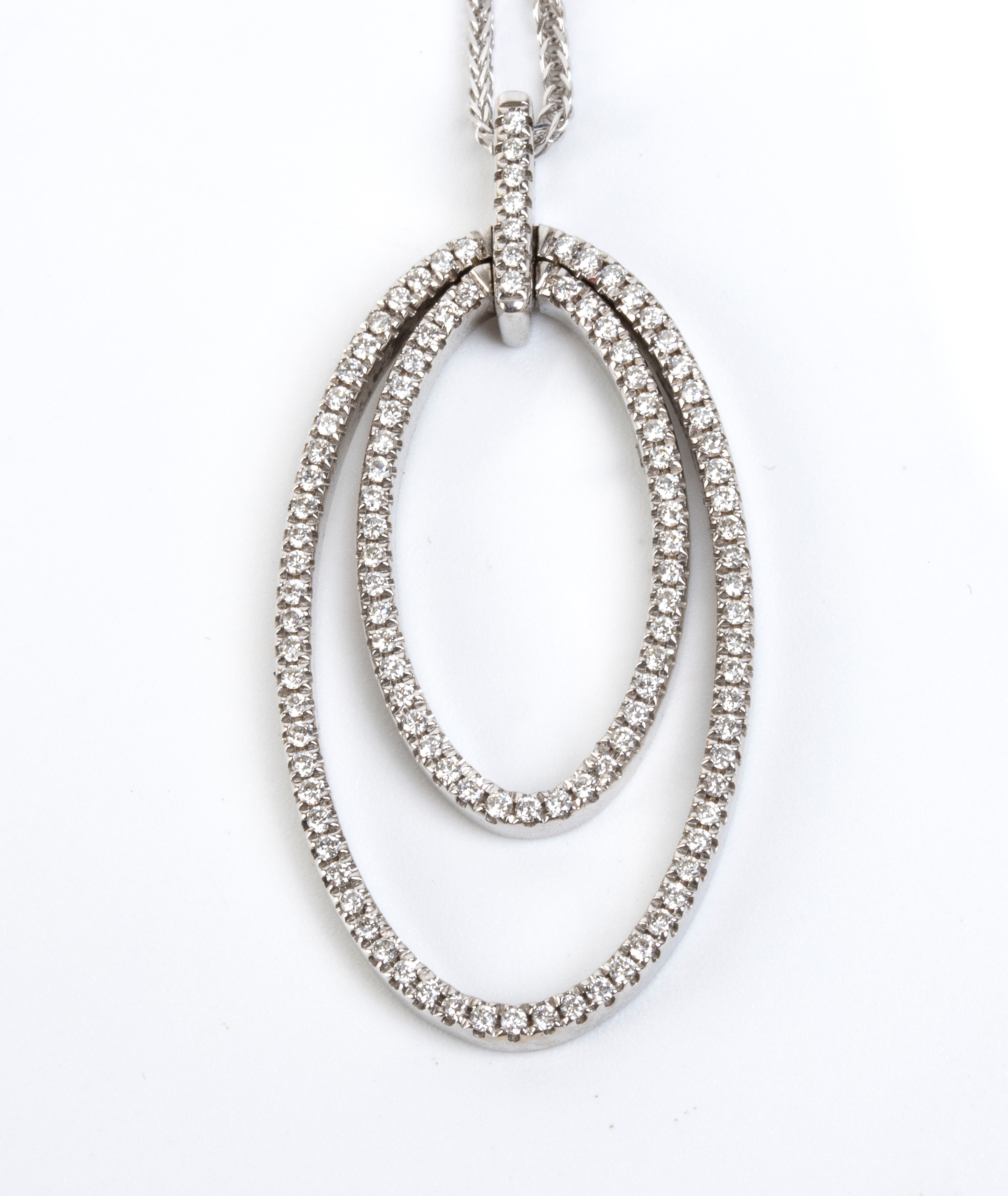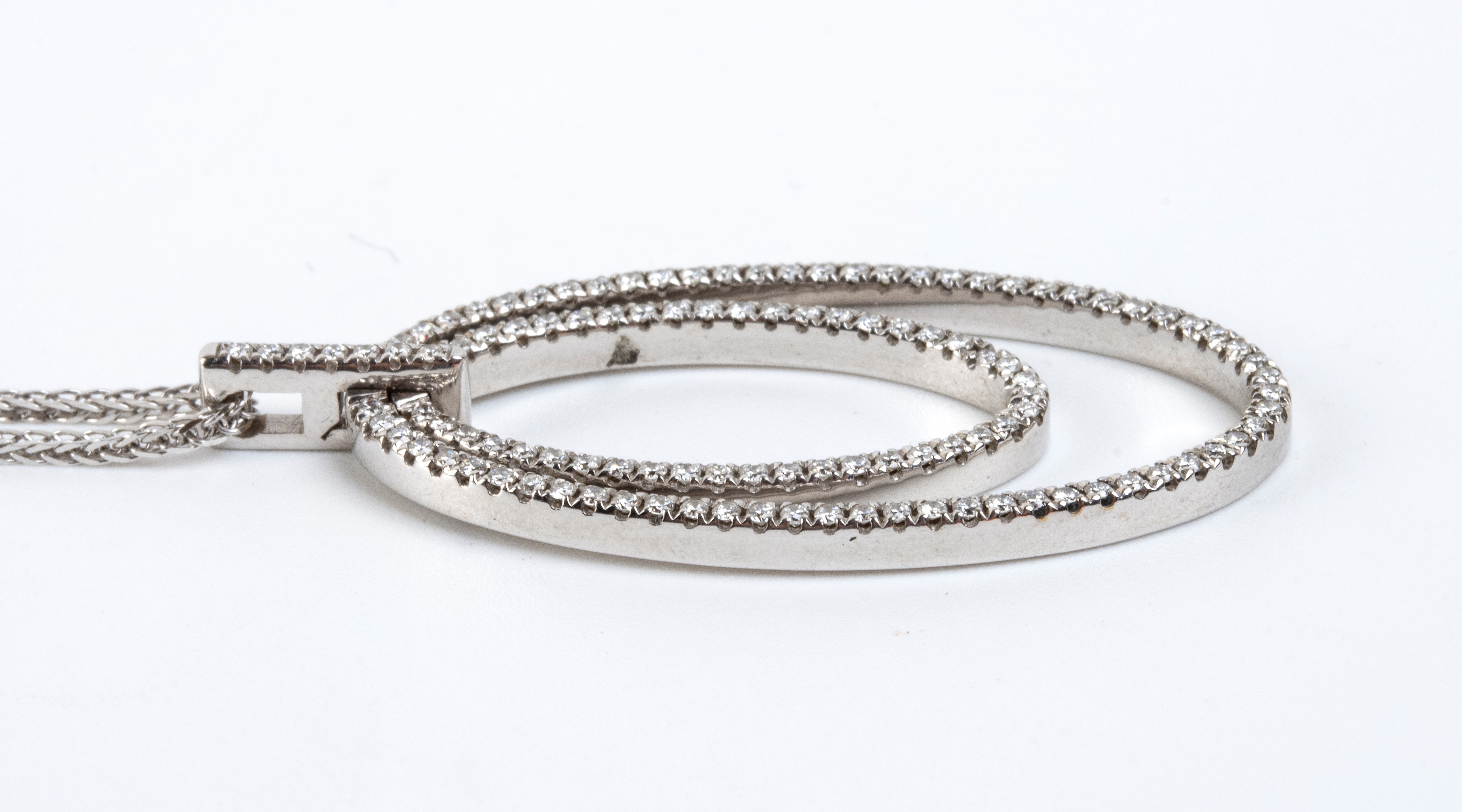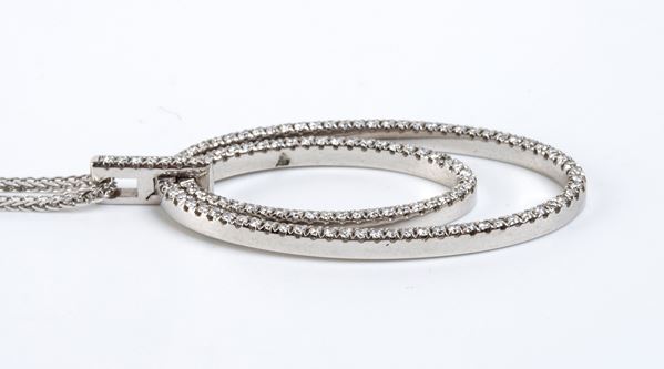 in oro bianco 18k, pendente geometrico impreziosito da n. 115 diamanti stimati per un peso totale di circa 0.80 ct, colore G-H, purezza VS- SI.