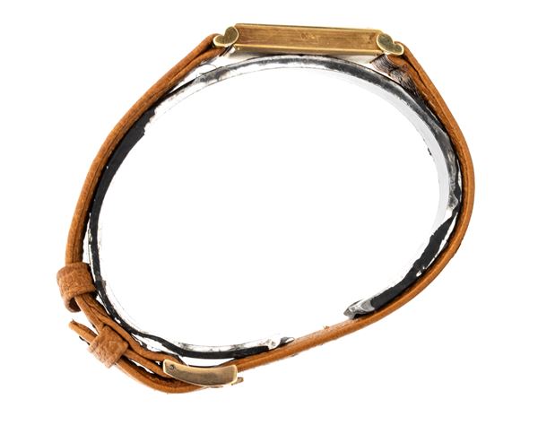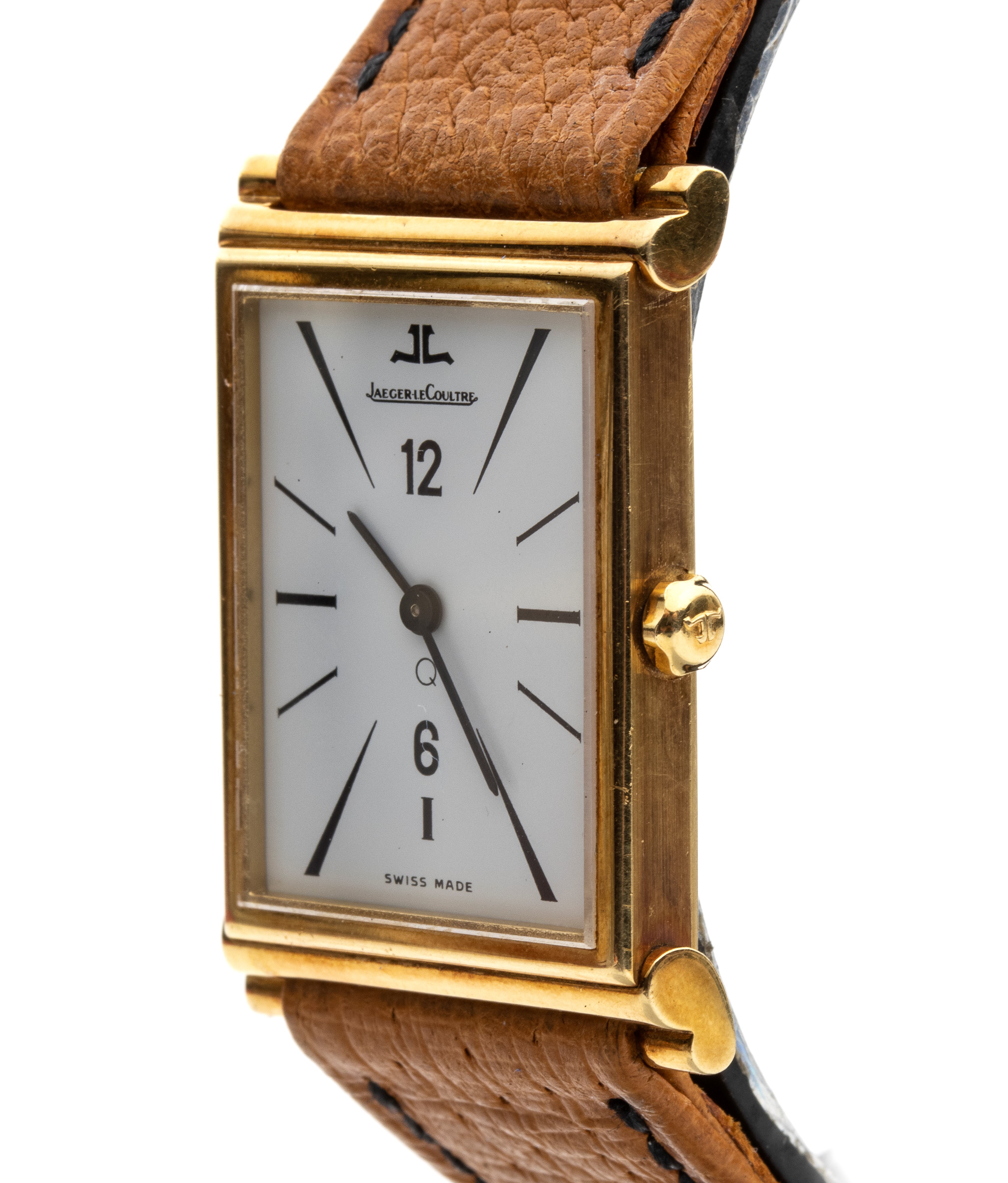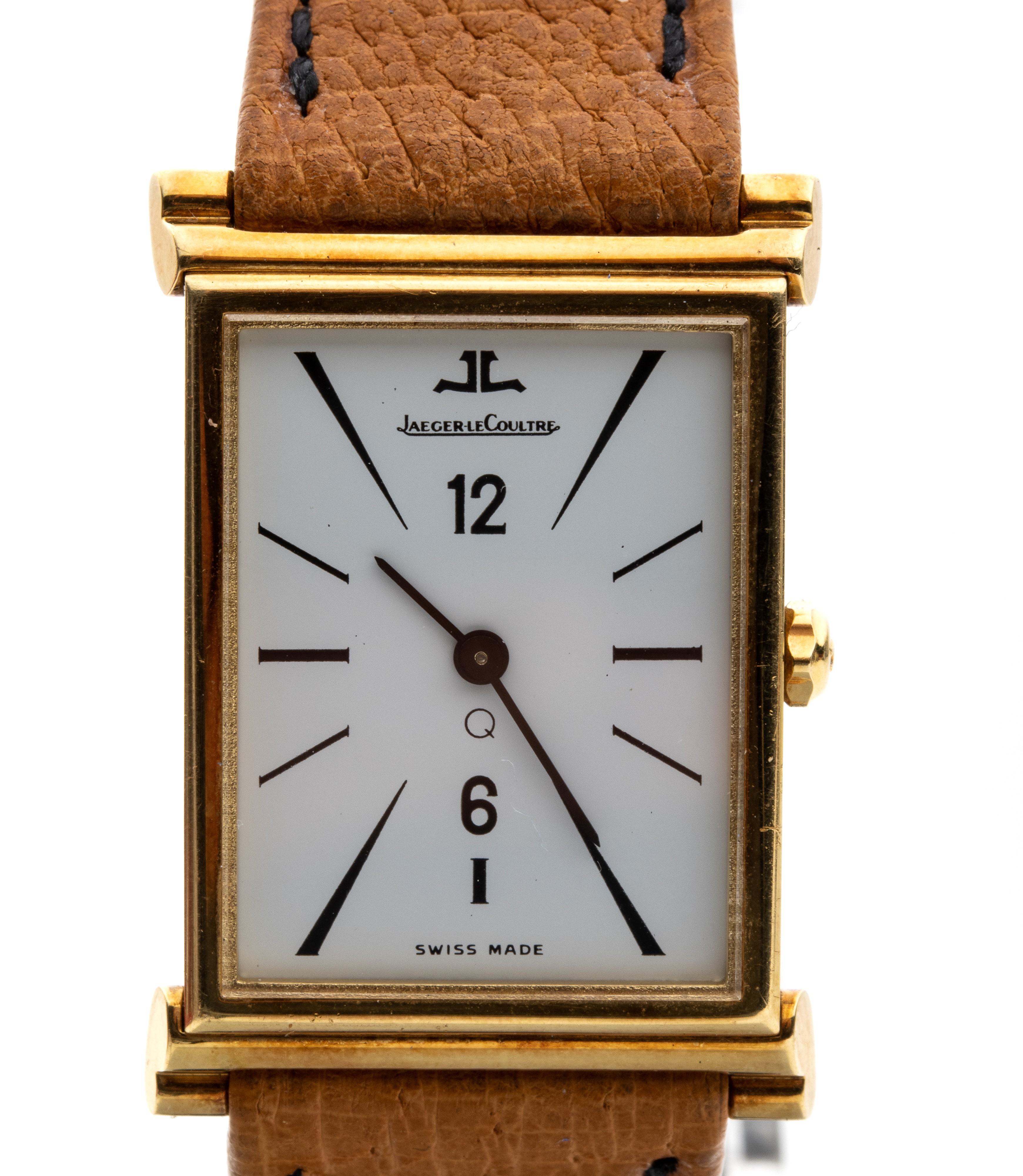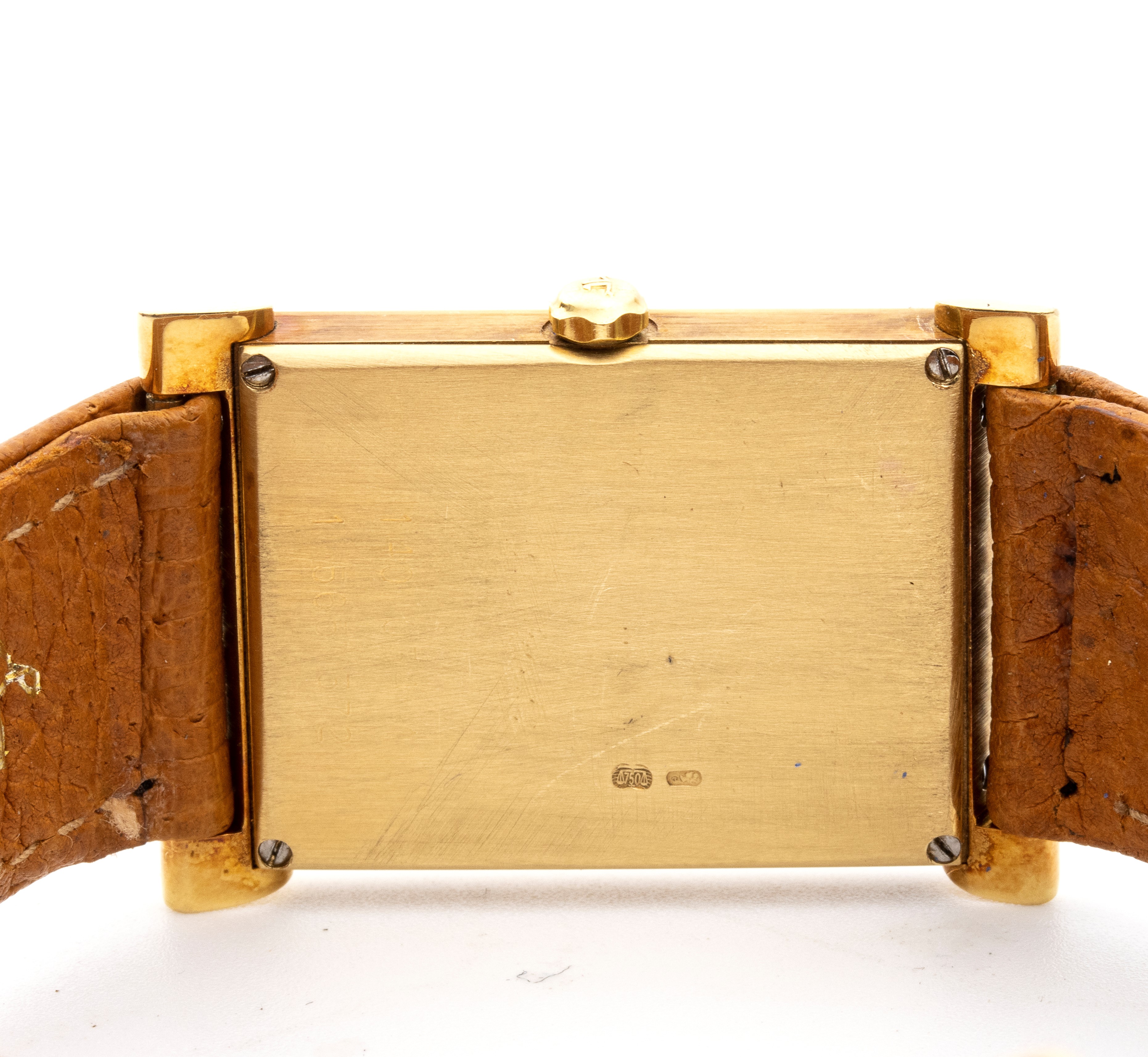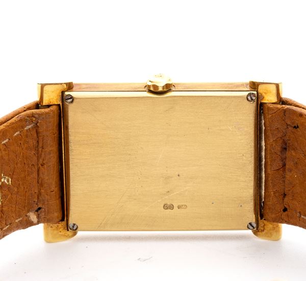 con cinturino in pelle con fibbia in metallo placcata oro, cassa in oro 18k di forma rettangolare, quadrante bianco con indici neri. Movimento al quarzo. Referenza fondello 140.034, matricola 1.565.372.