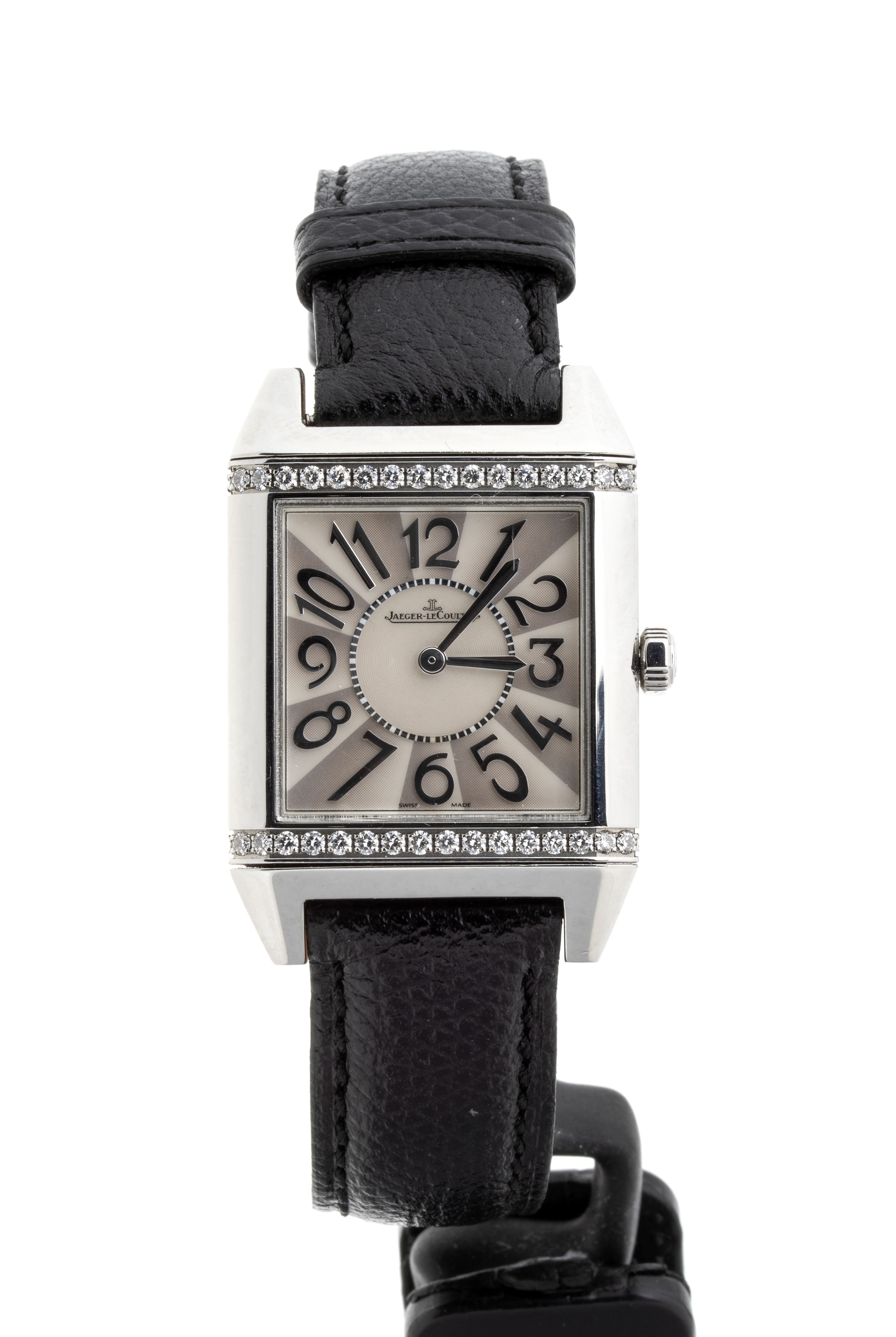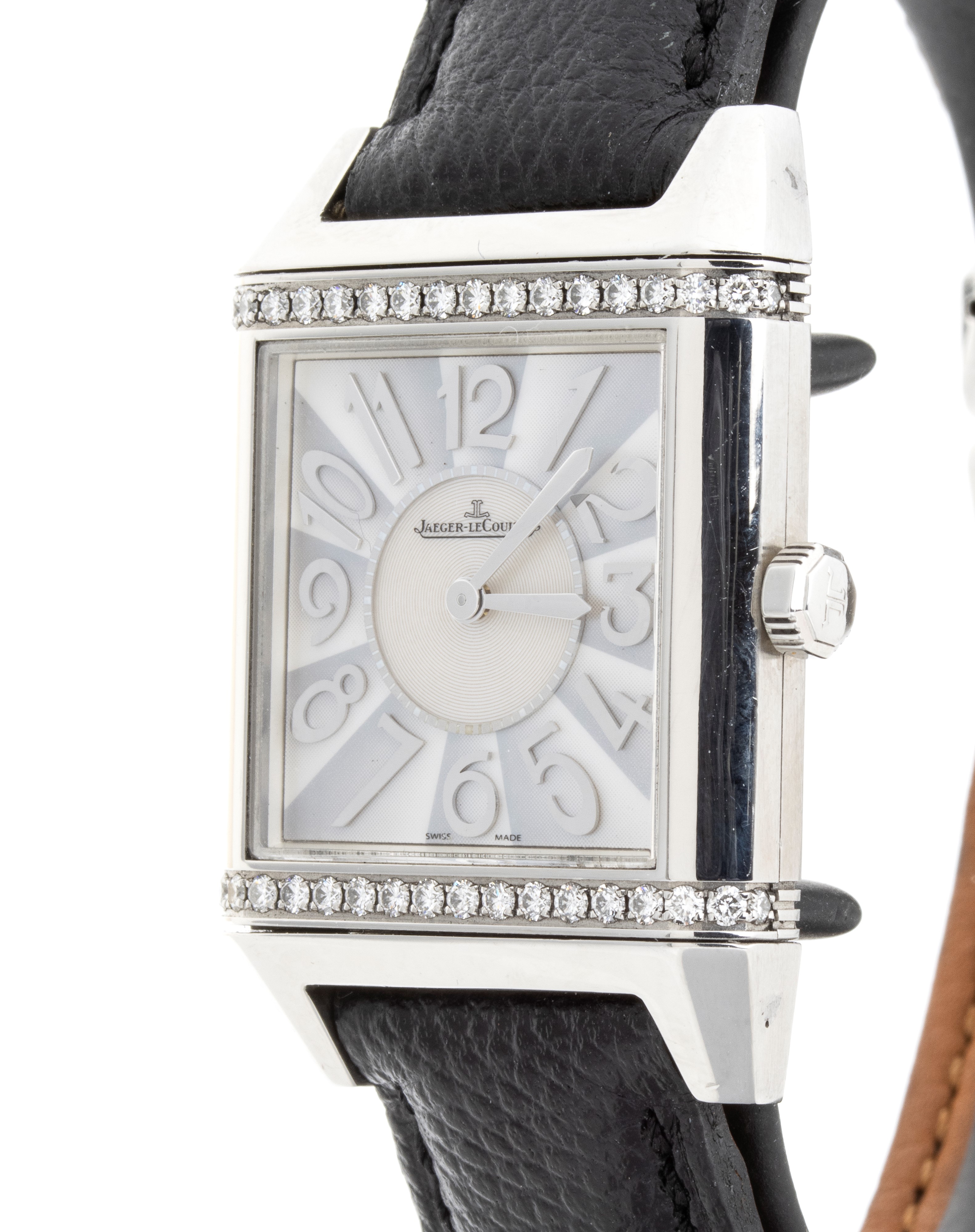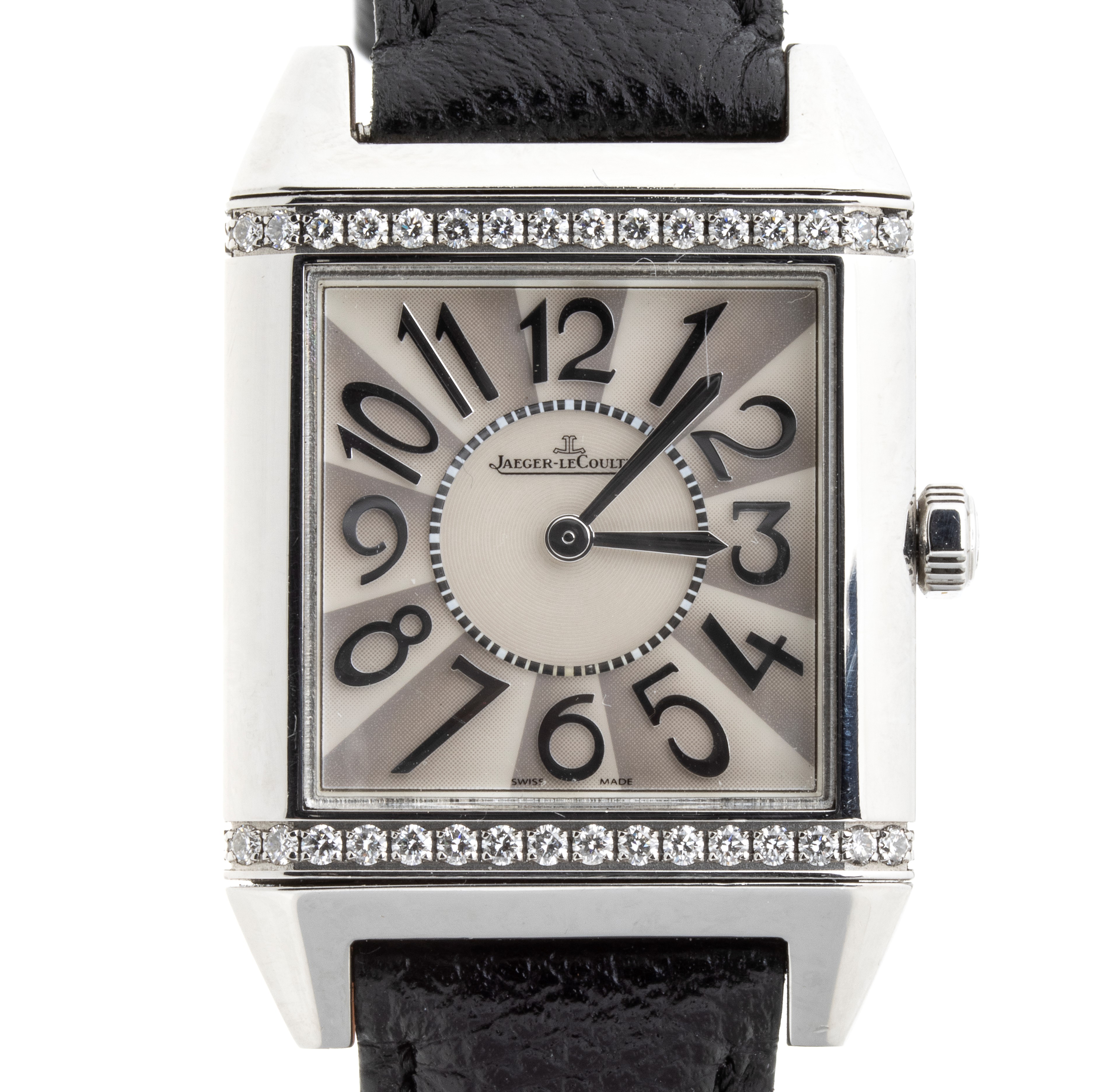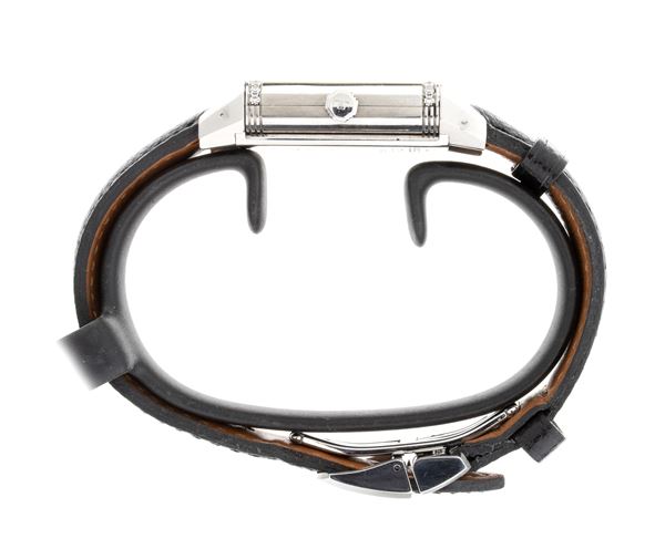 con cassa e fibbia deployante in acciaio, brillanti a margine del quadrante finemente lavorato a sfondo bianco con indici arabi argentati, cinturino in pelle. Movimento al quarzo marciante. Referenza 234.8.47, matricola 2703216.