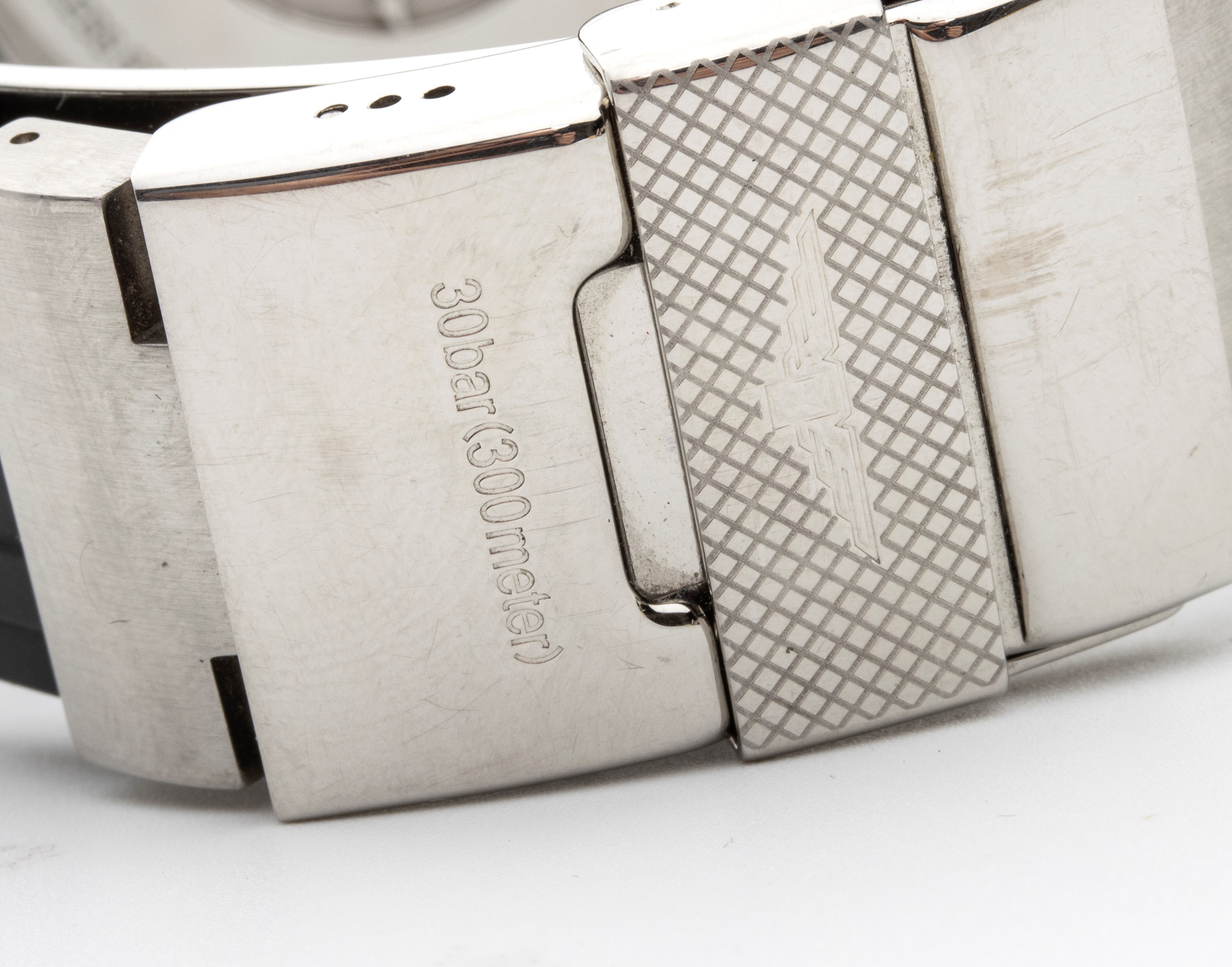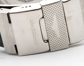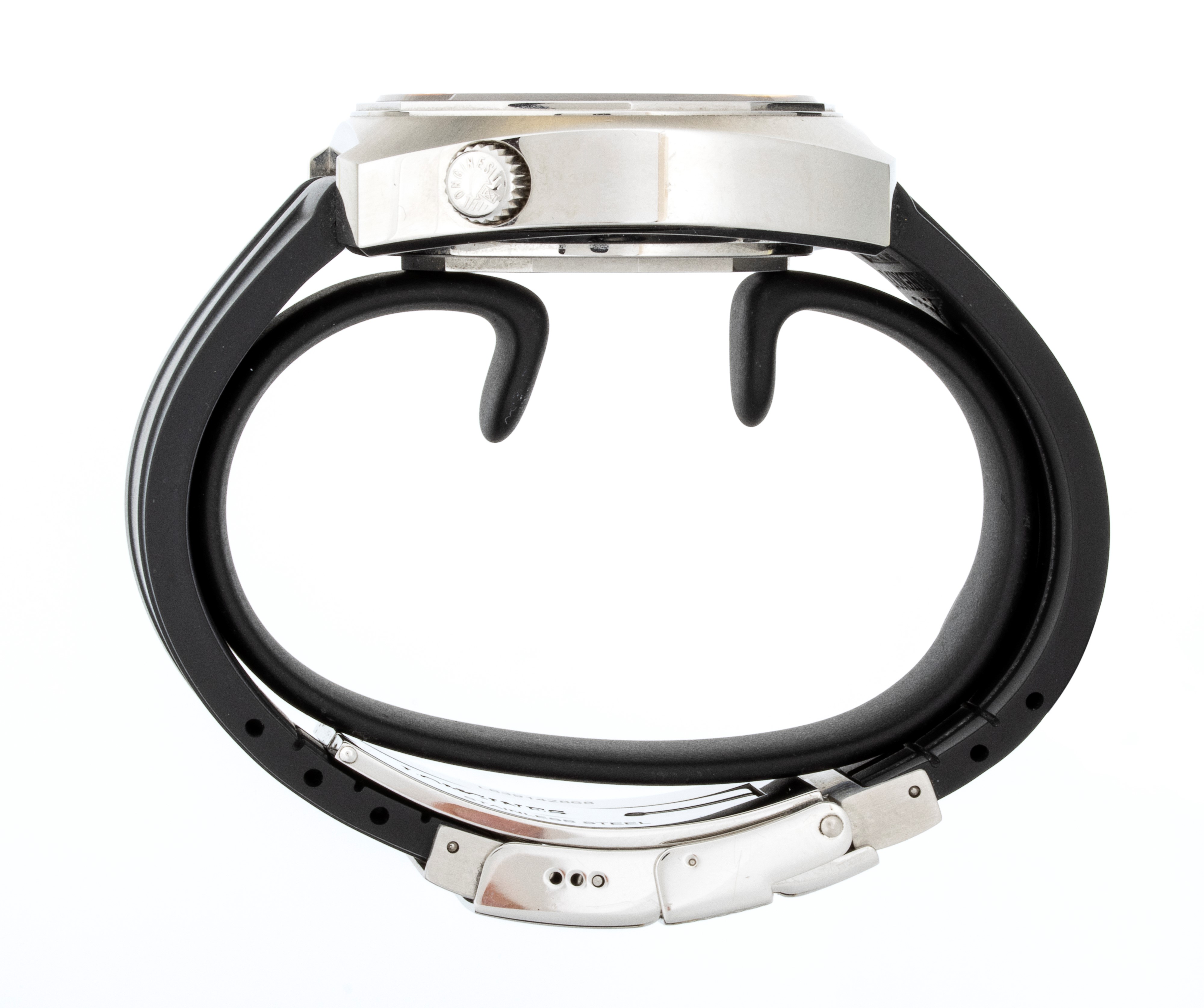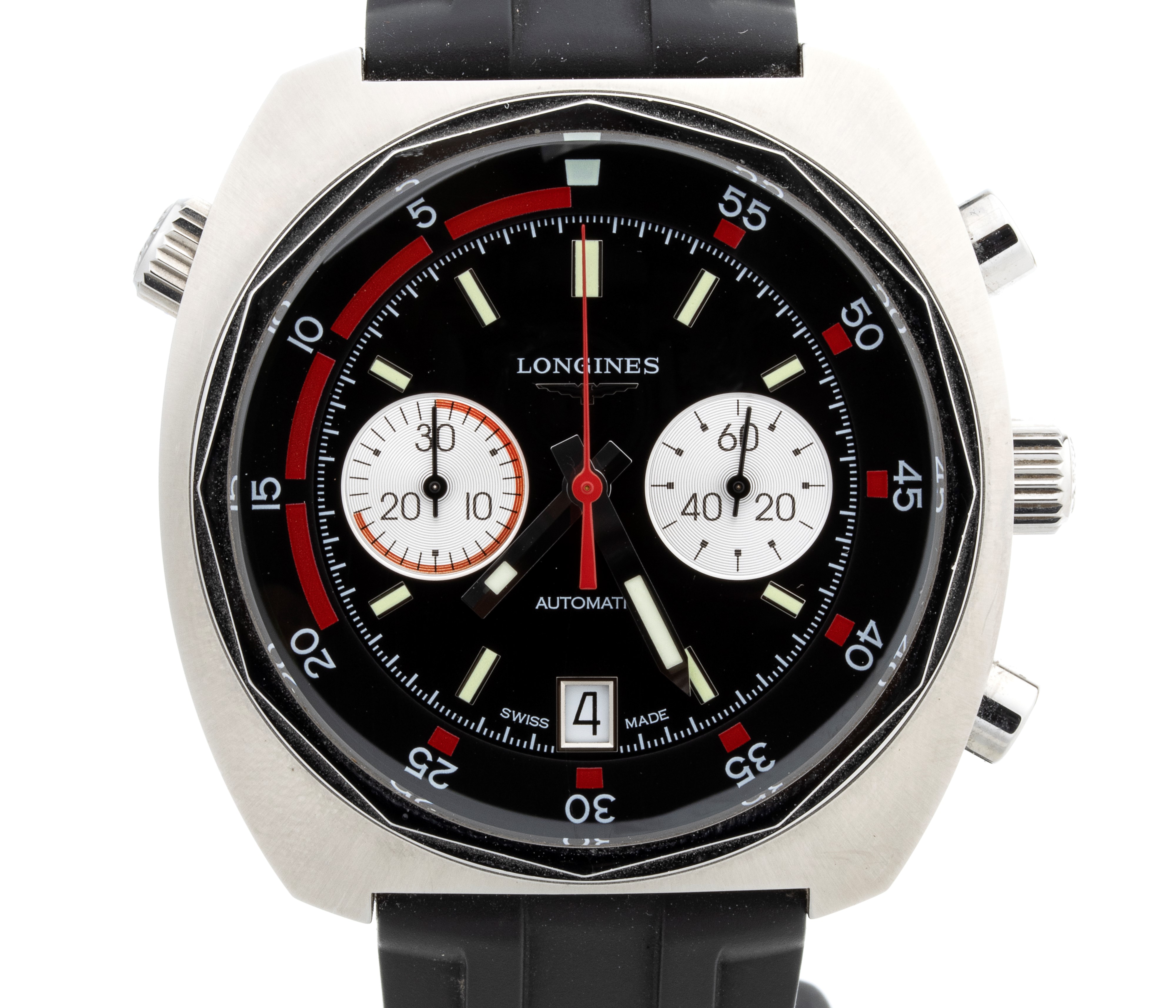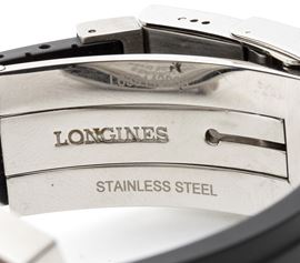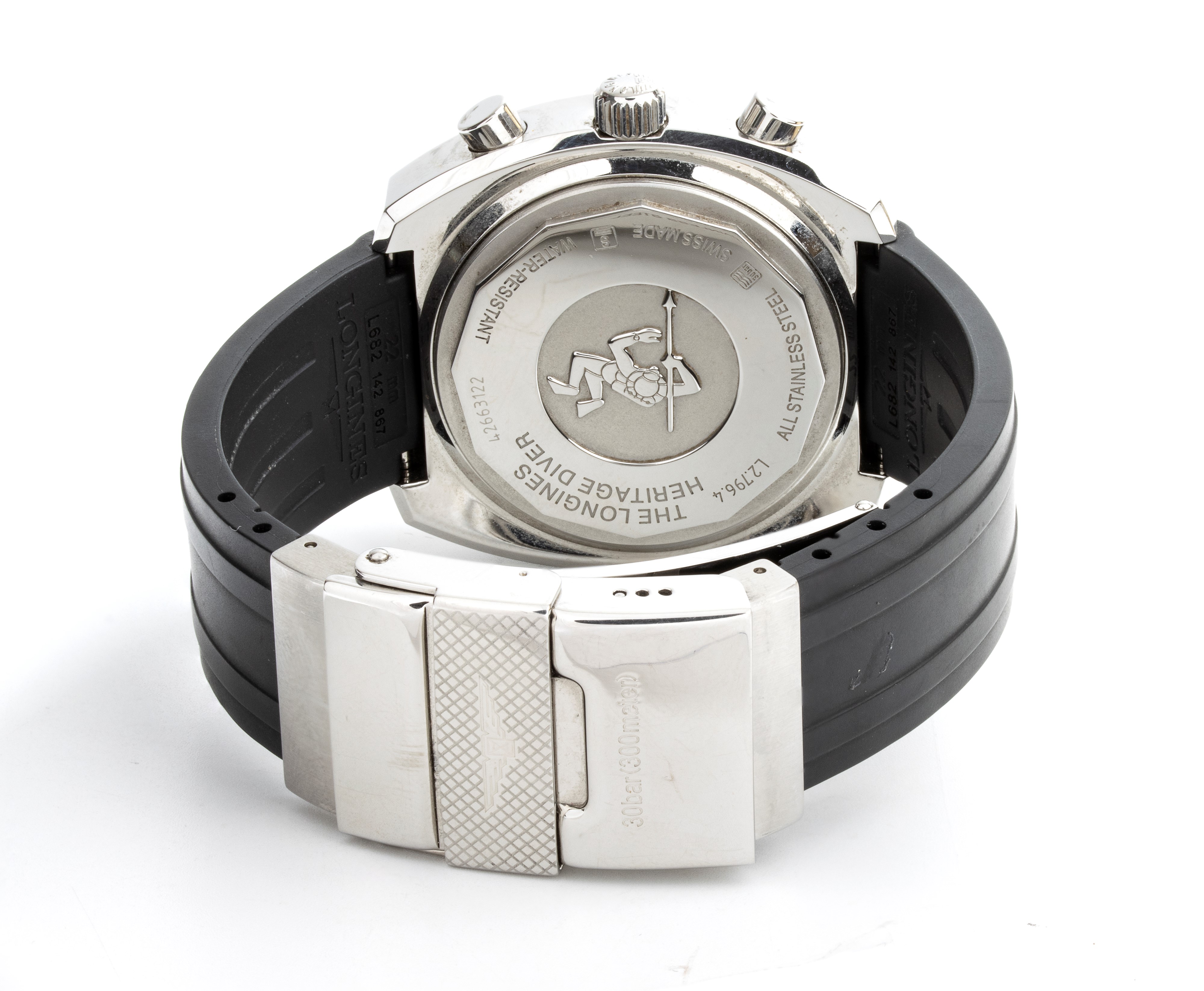 con cassa a forma di cuscino in acciaio, subacqueo con ghiera per immersione regolabile tramite corona ad ore 10, quadrante con indici chiari e scritte rosse, cinturino in gamma. Referenza L2.796.4, matricola 42663122.