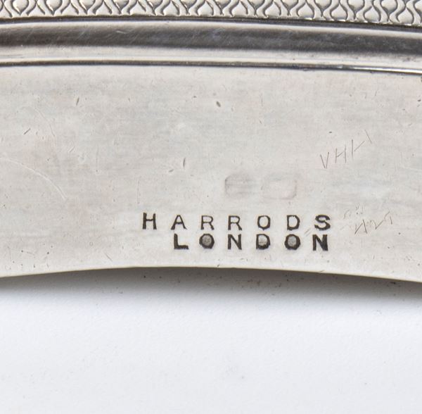 1 - Fiaschetta rettangolare con superficie decorata a zigrinatura fine. Chester 1913-1914, argentiere Harrods Stores Ltd;