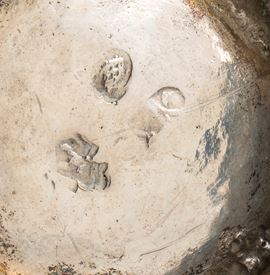 1 - Piccola lattiera con manico, con decorazione a sbalzo con una serie di fassoni  alternate a cartigli, su un lato è presente un paesaggio sbalzato.