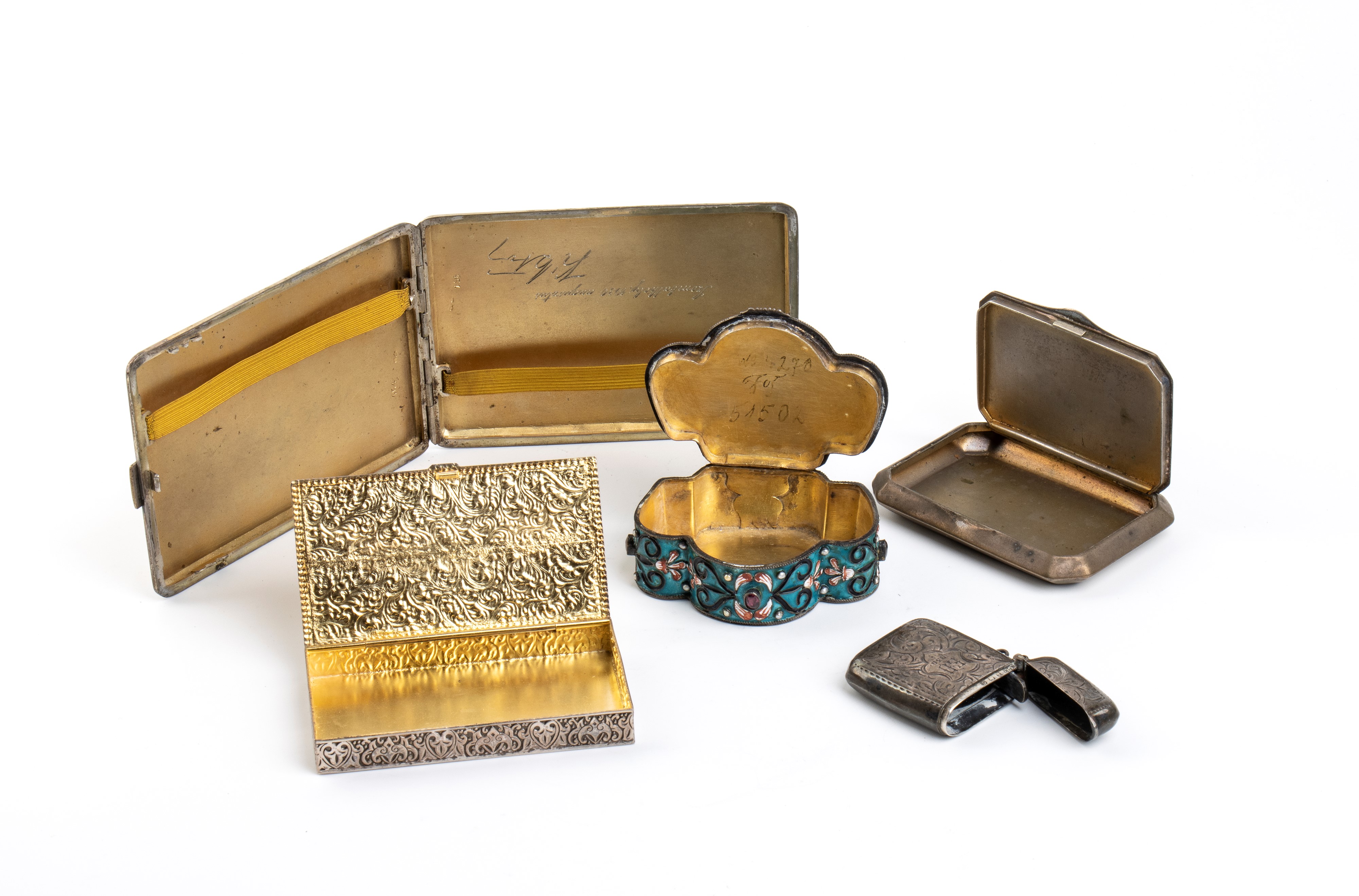 1 - Tabacchiera rettangolare caratterizzato da una superficie lavorata a zigrinatura o finitura a fasce. Punzonata "58" e "454" e recante la un'incisione interna riportante "Szombathely, 1930 augusztus;