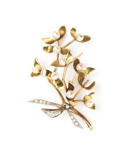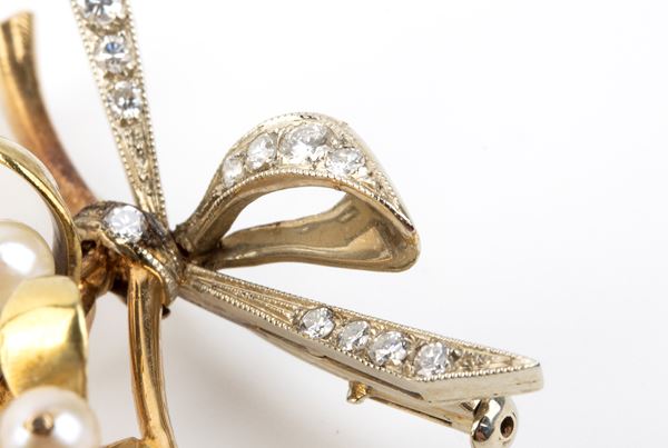 Spilla con motivo a bouquet in oro con diamanti e perle