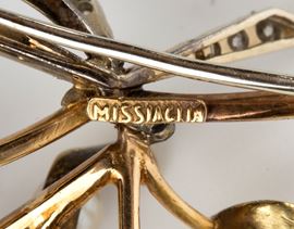 in oro giallo ed oro bianco, con nastro in diamanti e punteggiatura di perle coltivate d'acqua salata. Fimato: "MISSAGLIA".