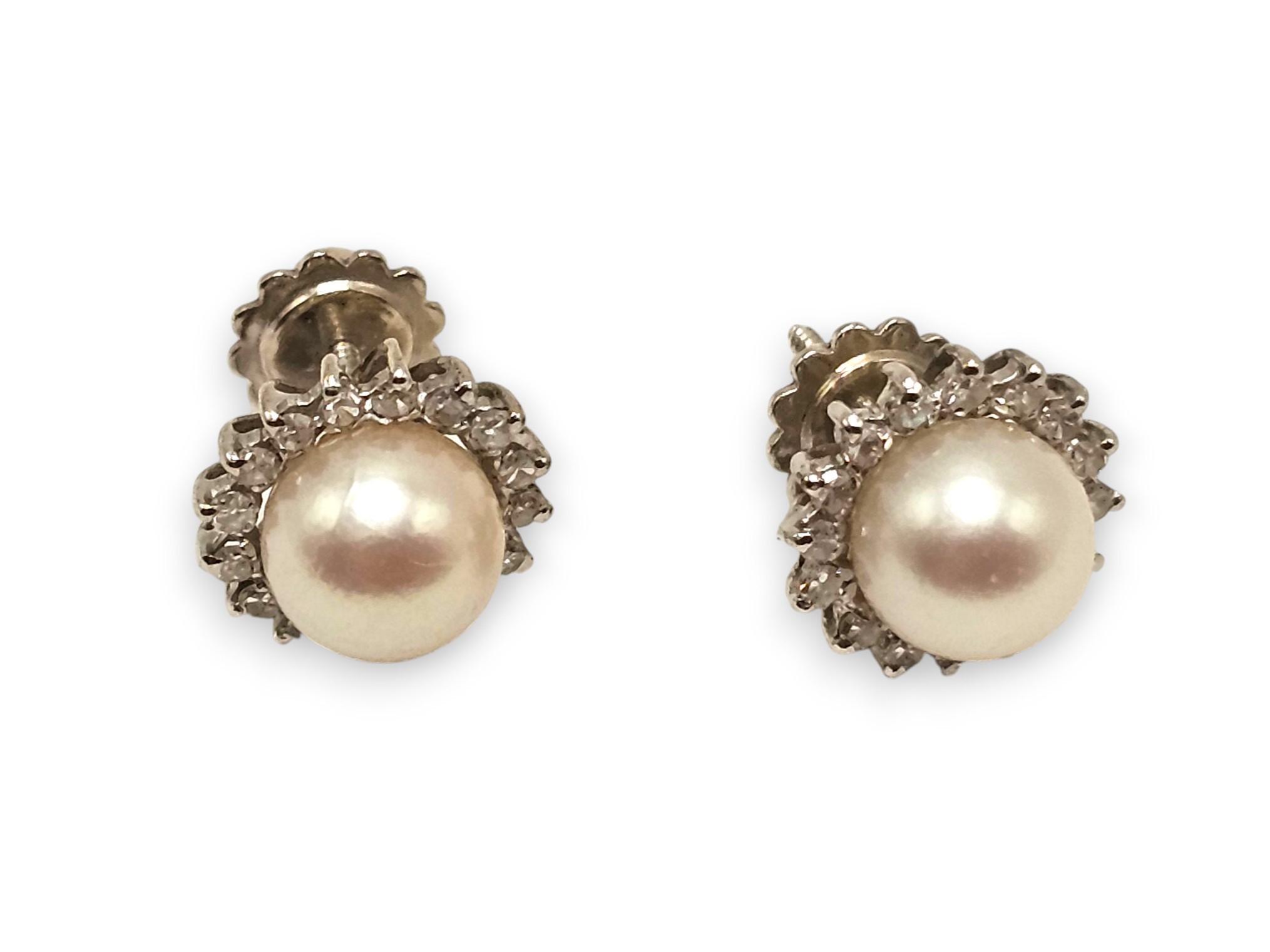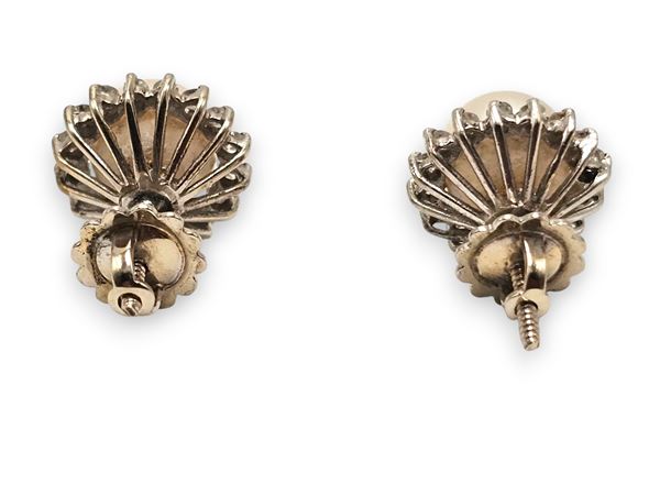 in oro bianco, ciascuno con perla coltivata d'acqua salata incorniciata da diamanti taglio brillante stimati per un peso totale di circa 0.60 ct, colore H-I, purezza VS.