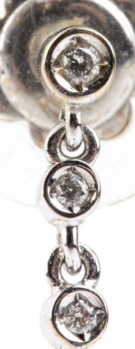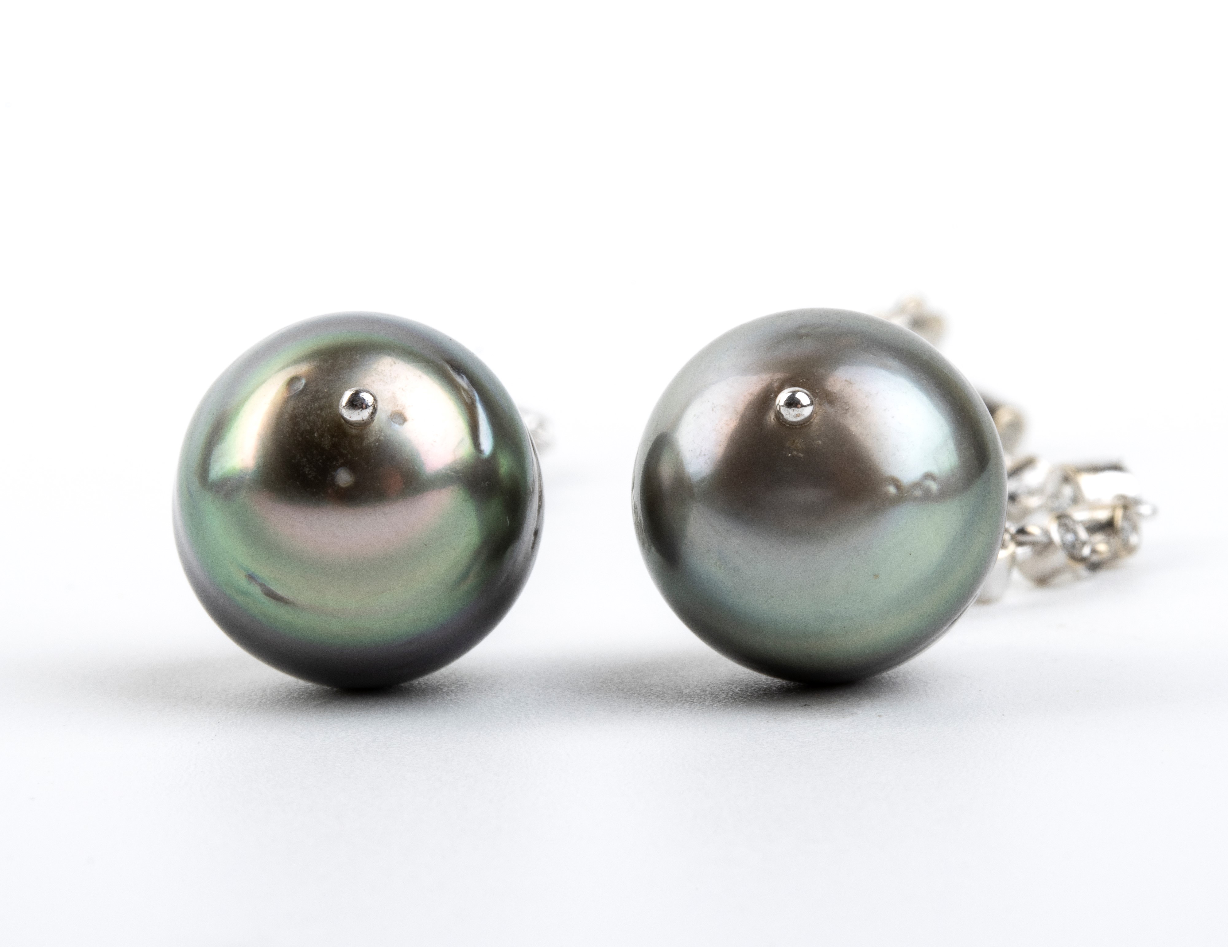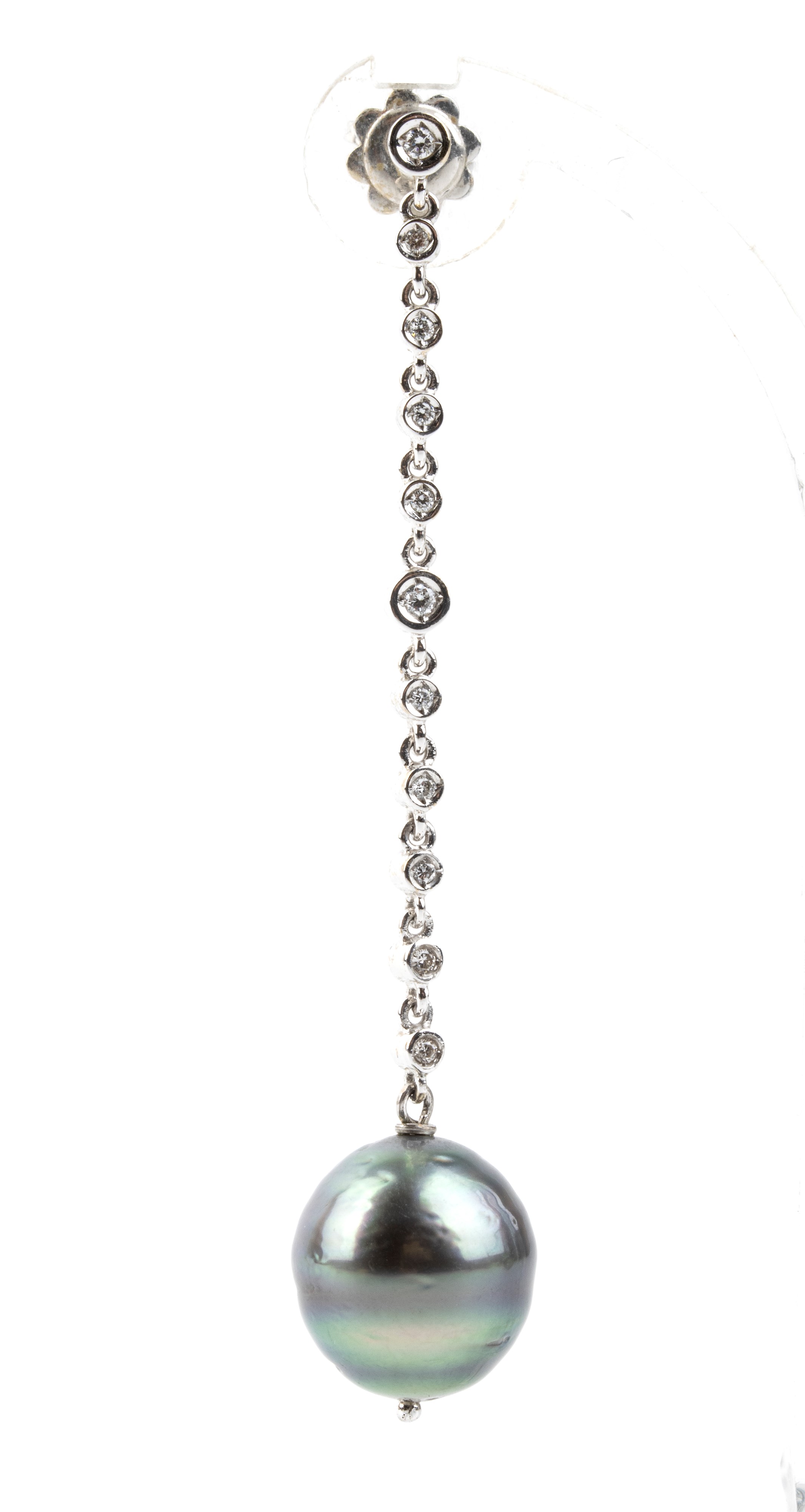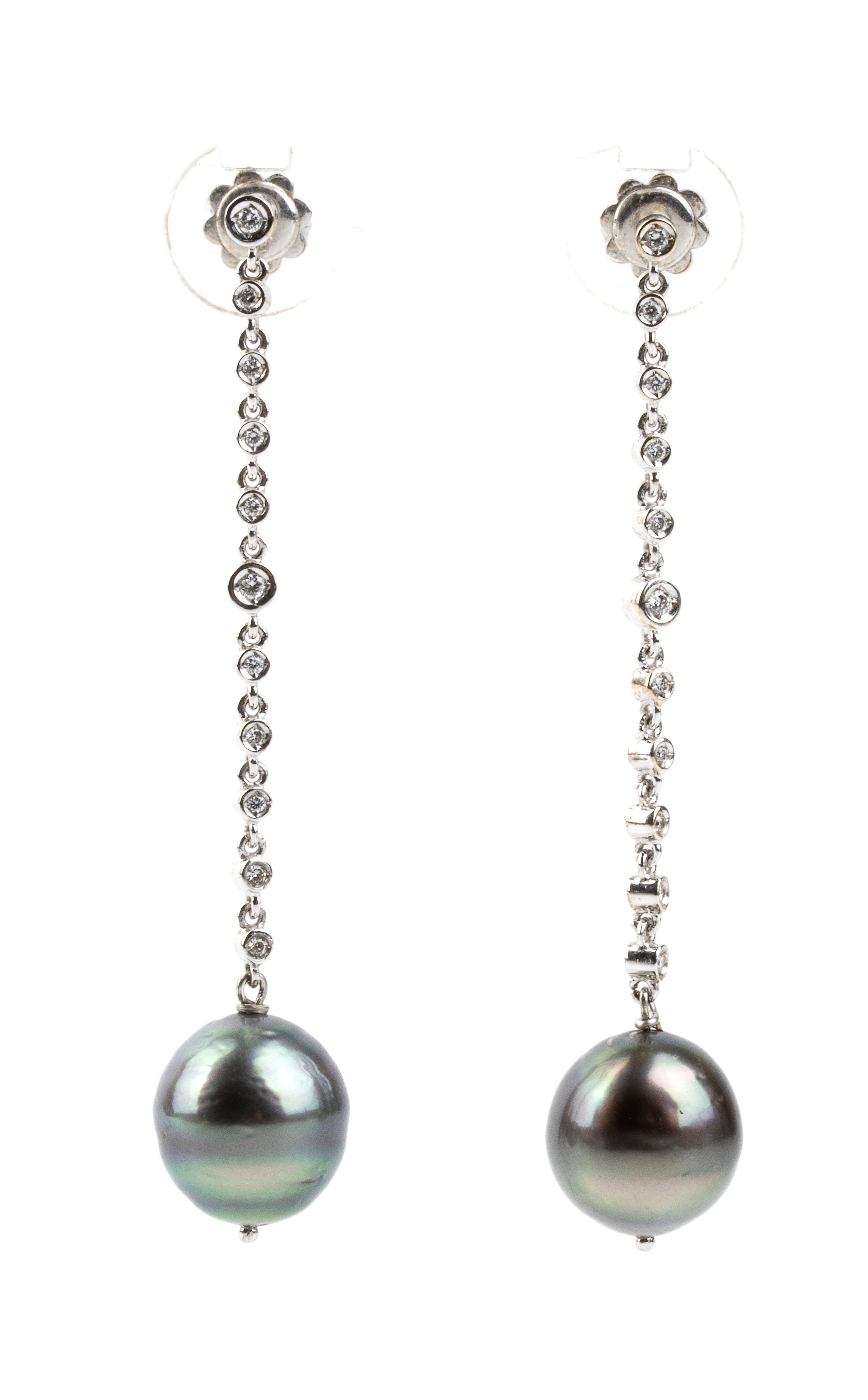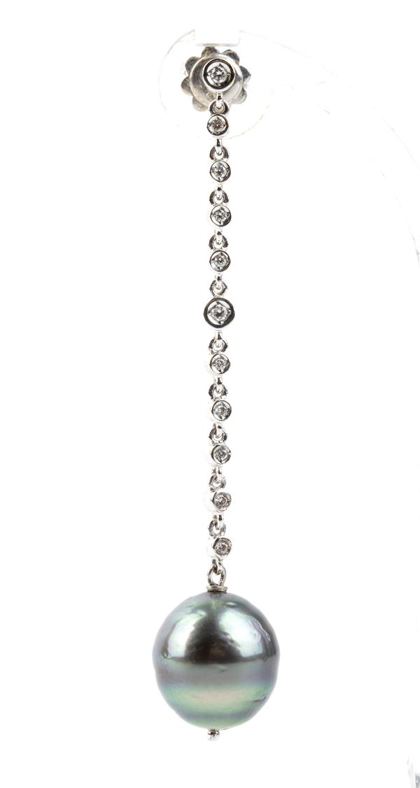 in oro bianco 18k, ciascuno con perla Tahiti sospesa ad una linea snodata di diamanti taglio brillante, stimati per un peso totale di circa 0.20 ct, colore F-G, purezza VS-SI.
