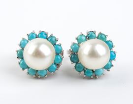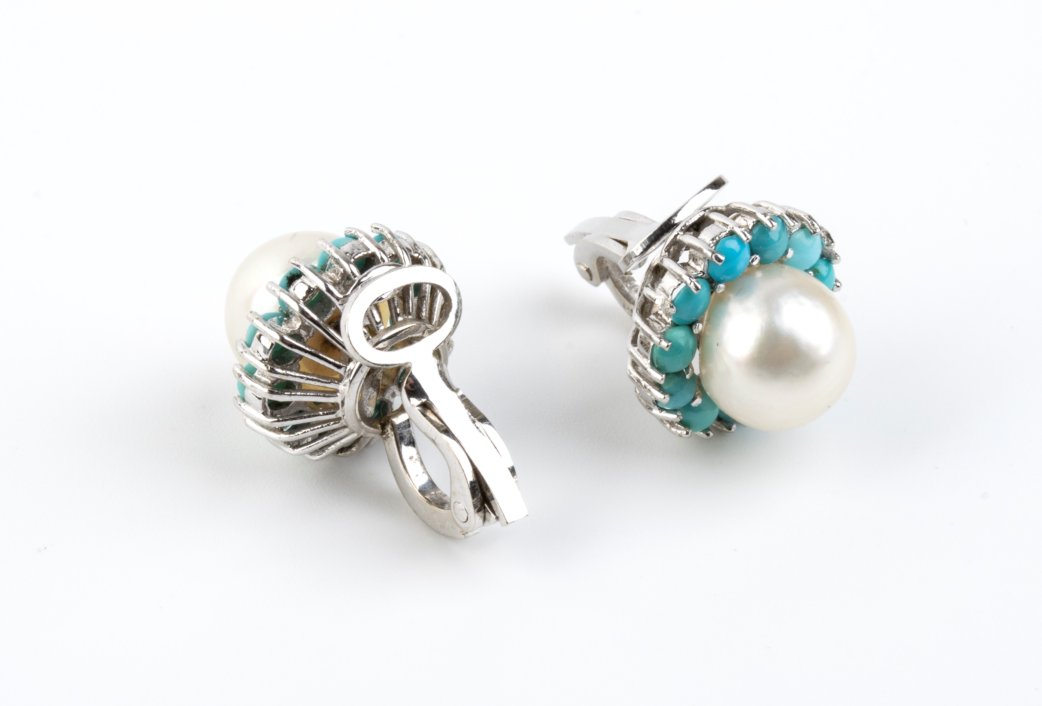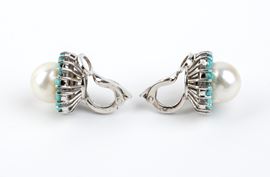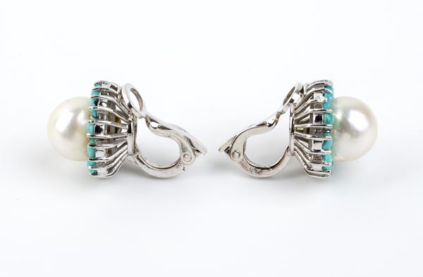 in oro bianco 18k, ciascuno con perla coltivata d'acqua salata tra cornice di cabochon di turchese.