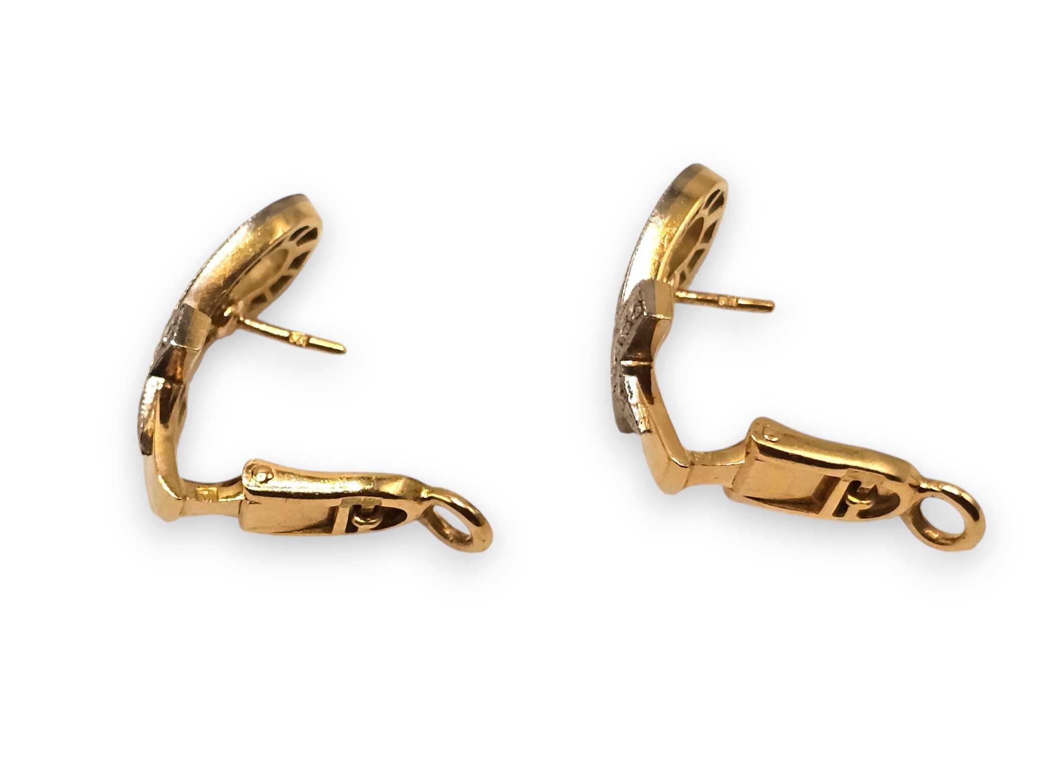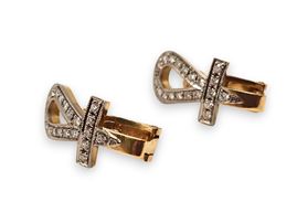 in oro gialli ed oro bianco 18k, ciascuno con disegno di croce Egizia (o croce di Ank), in diamanti taglio brillante stimati per un peso totale di circa 0.60 ct, colore H, purezza VS.