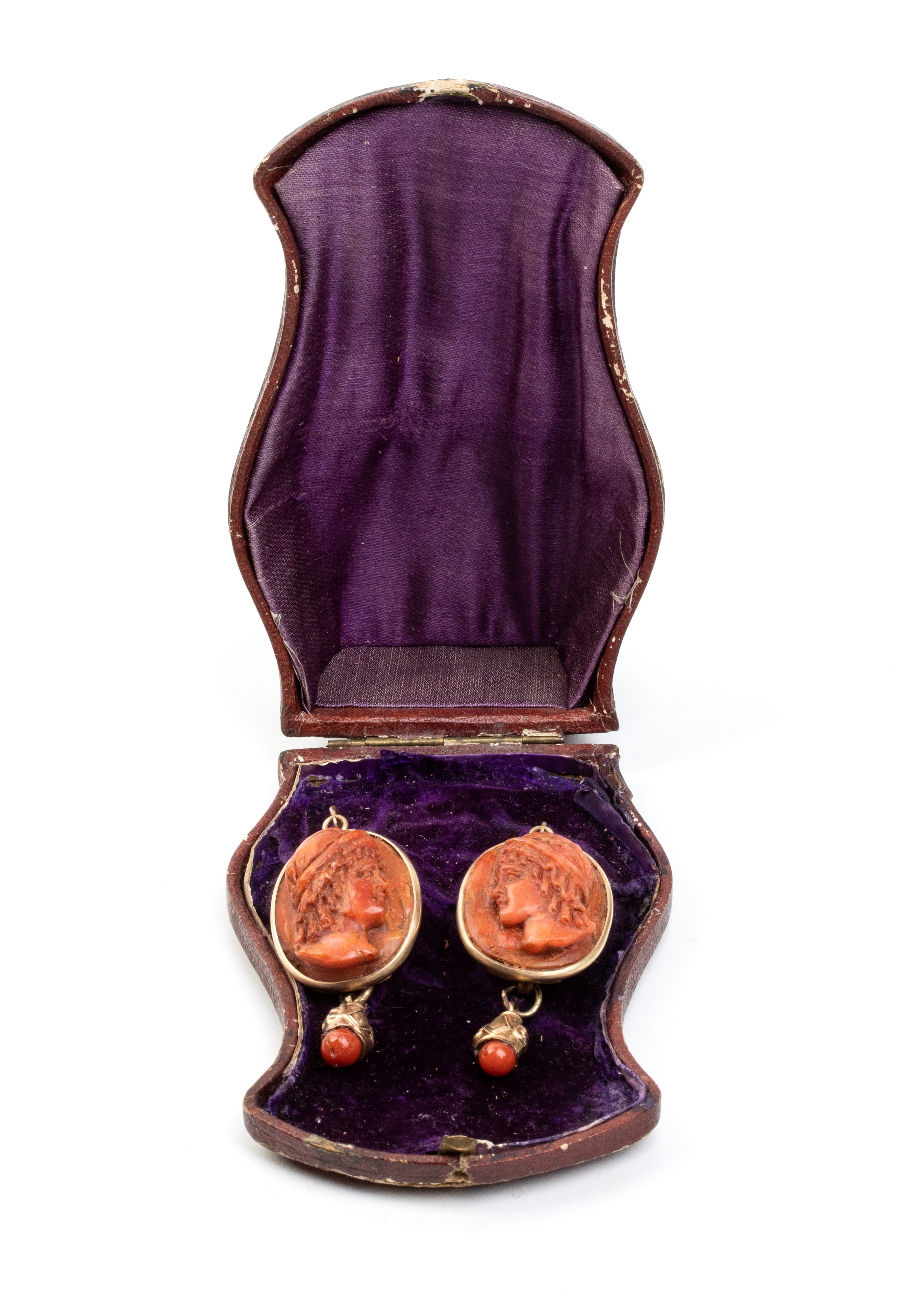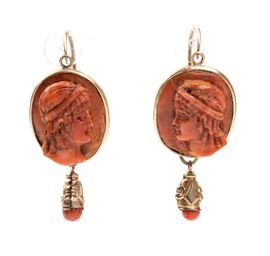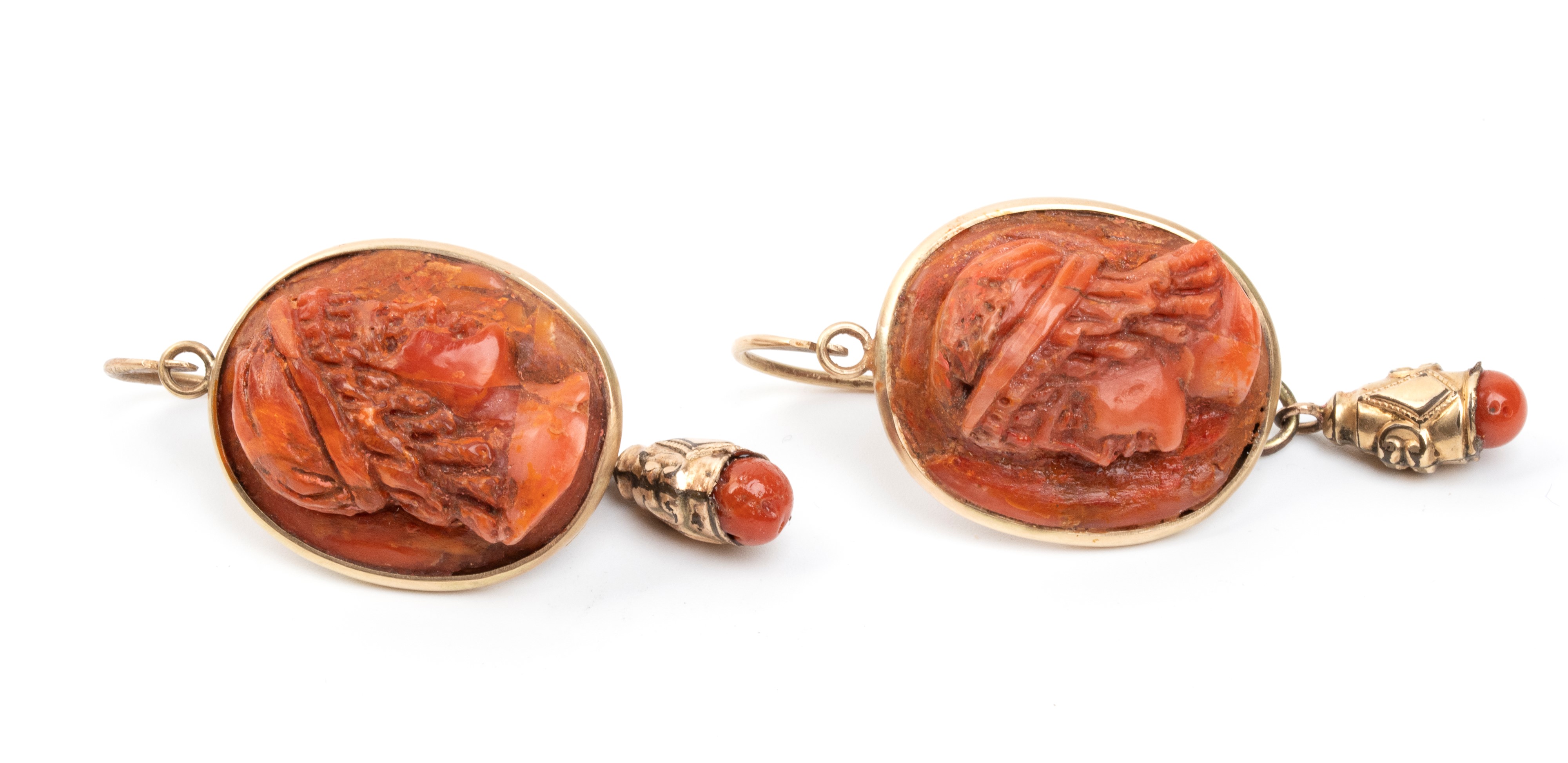 montature in oro giallo che incorniciano cammei in corallo Mediterraneo (Corallium Rubrum) raffiguranti profili classici maschile ed femminile.