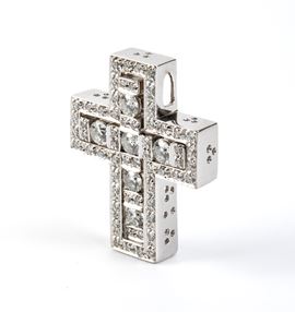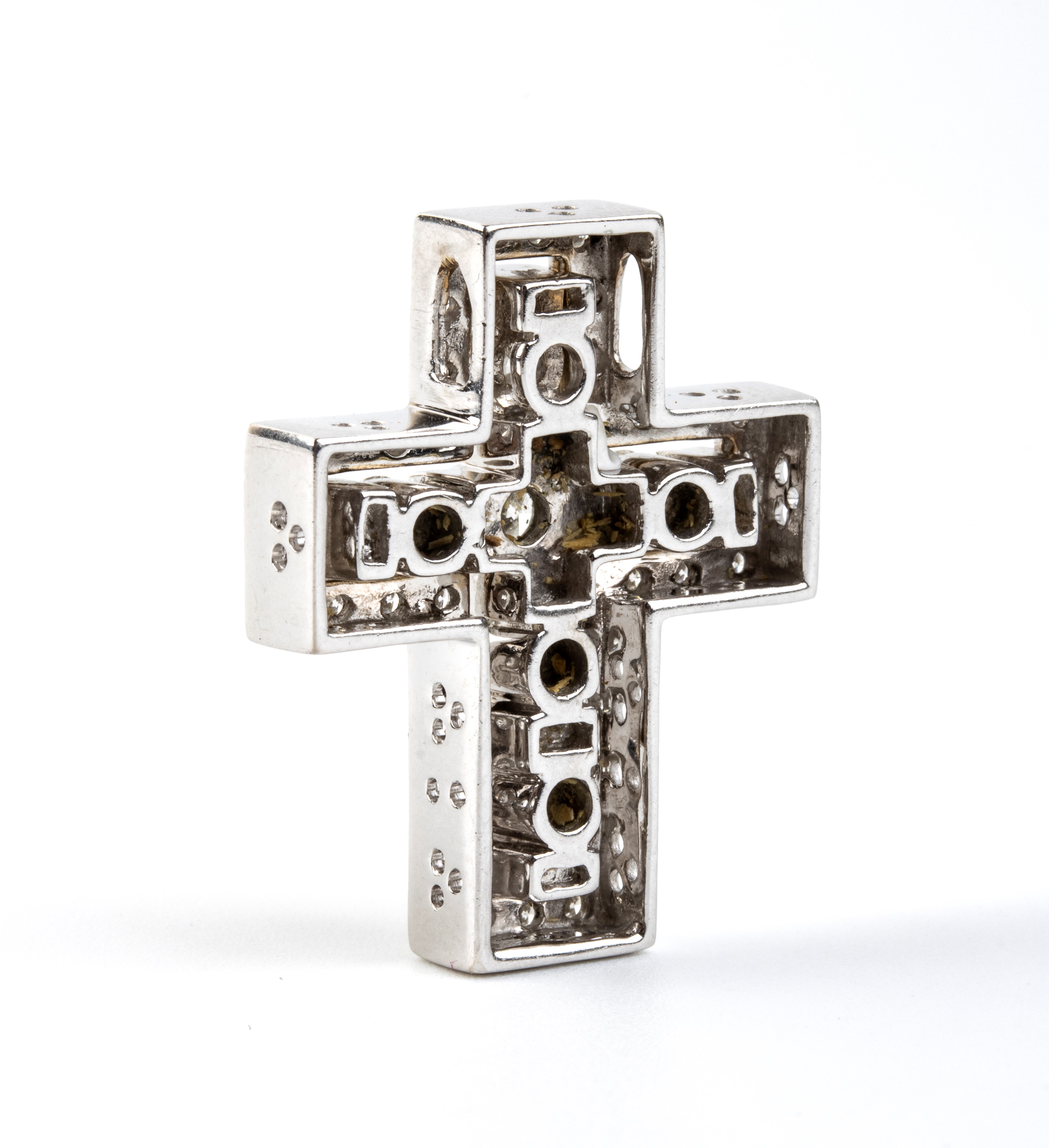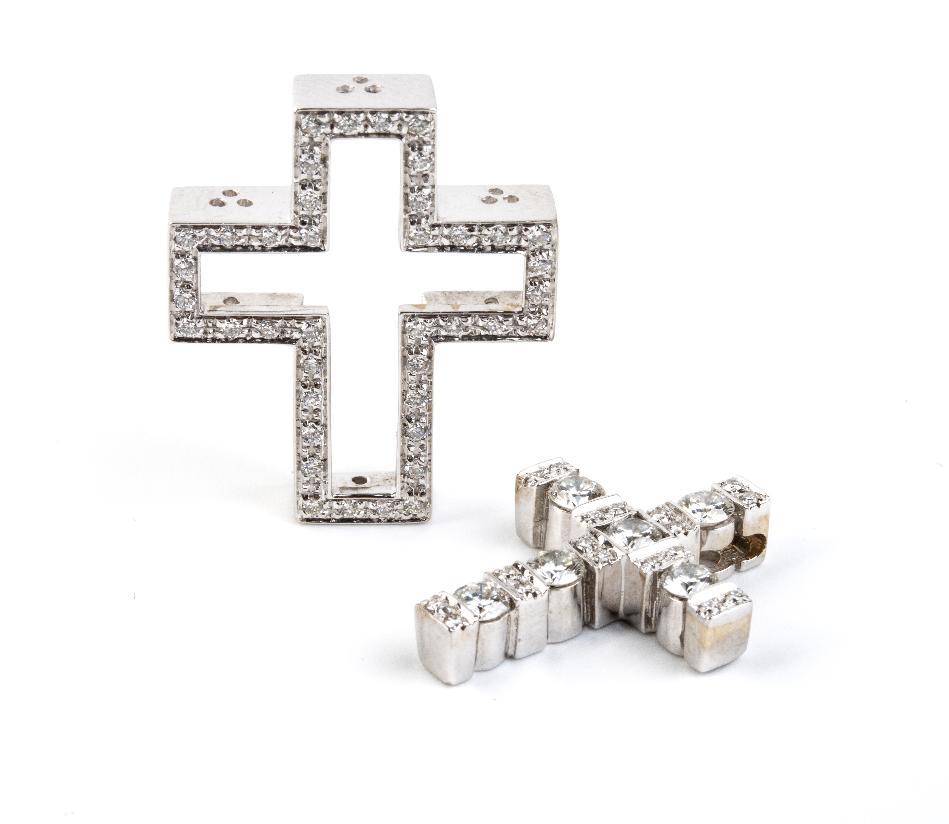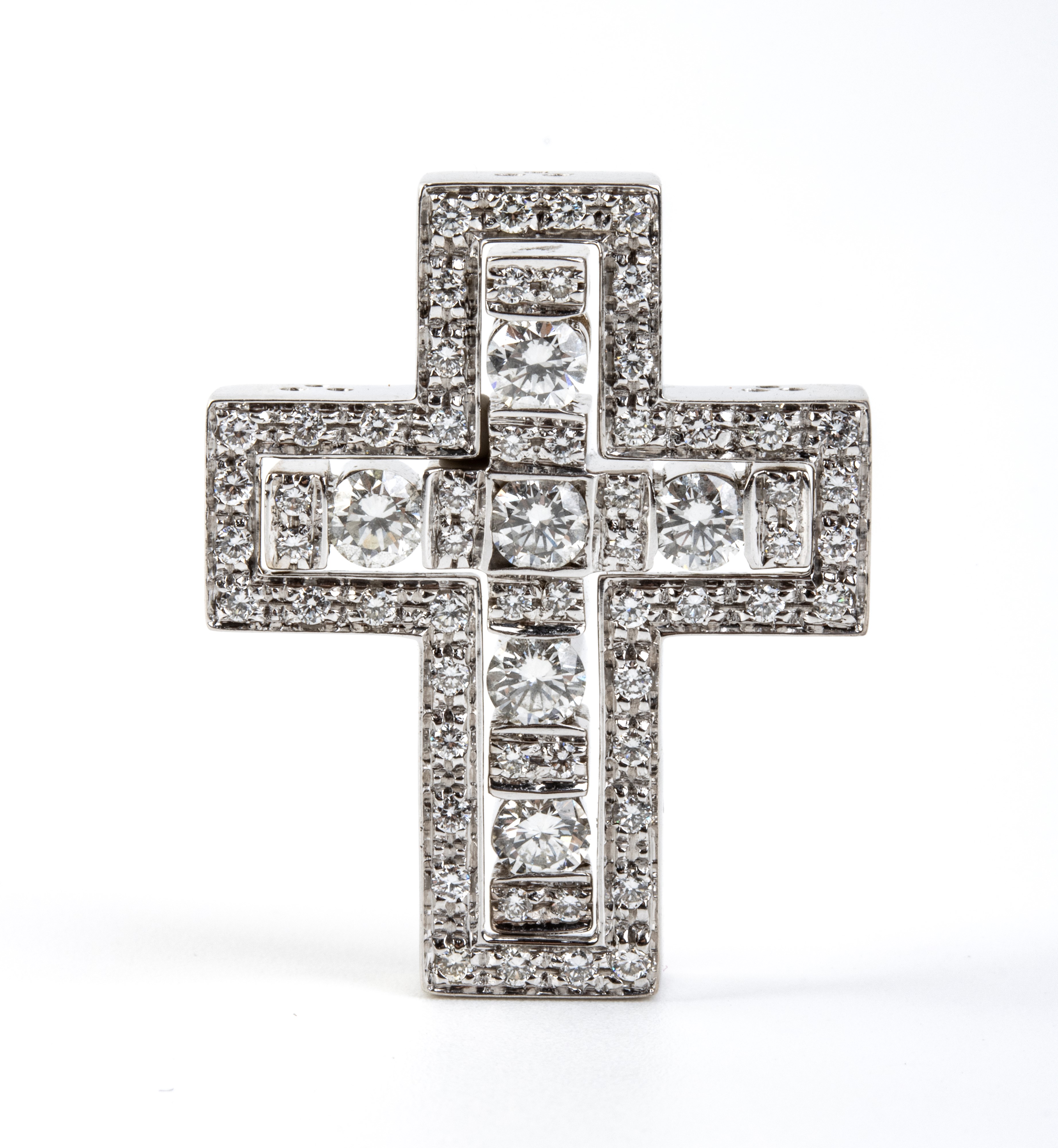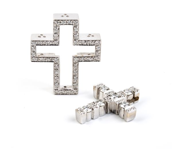 composto da una coppia di croci concentriche in oro bianco, con pavé di diamanti taglio brillante, stimati per un peso totale di circa 1.30 ct, colore G-H, purezza VVS-VS.