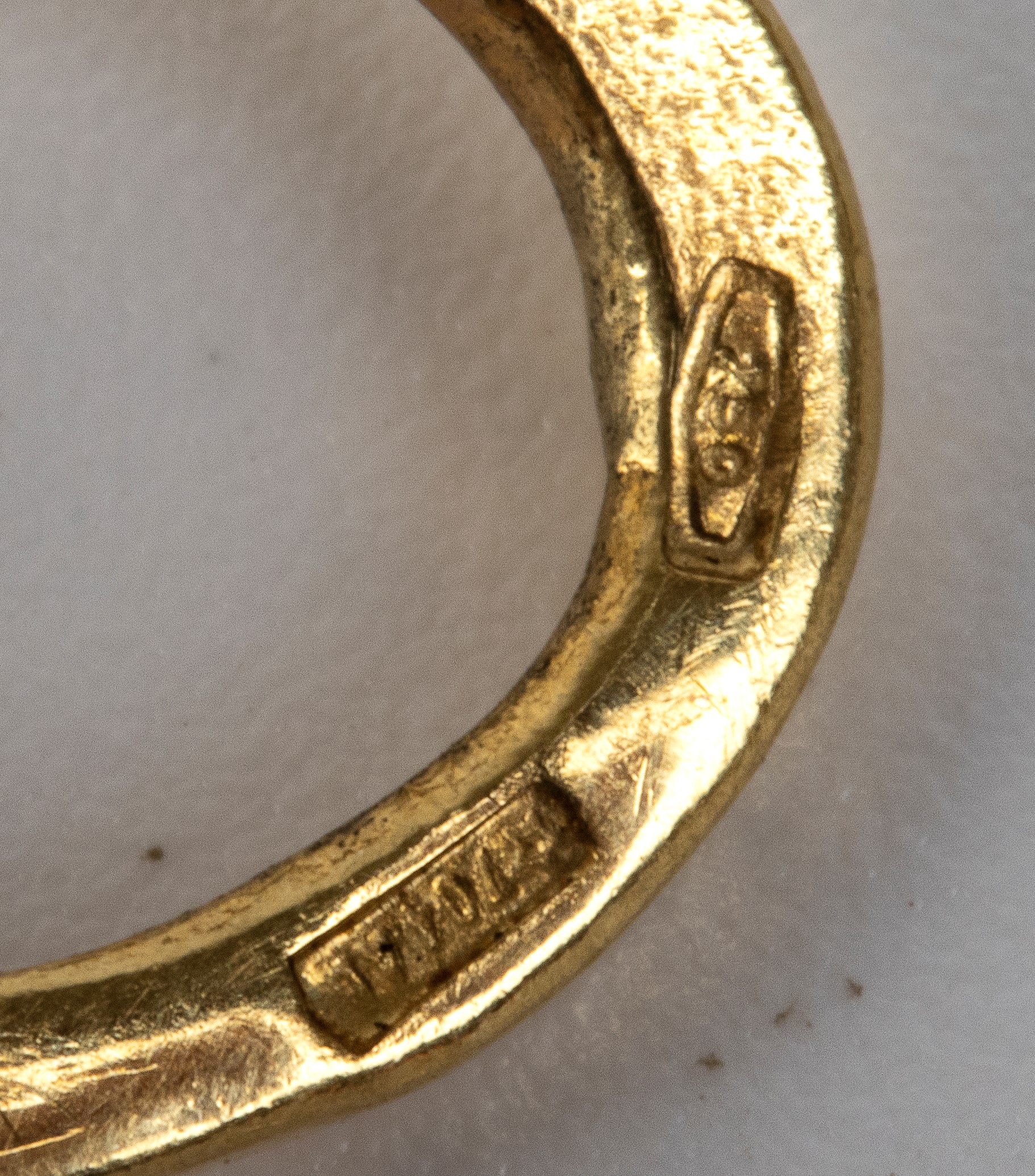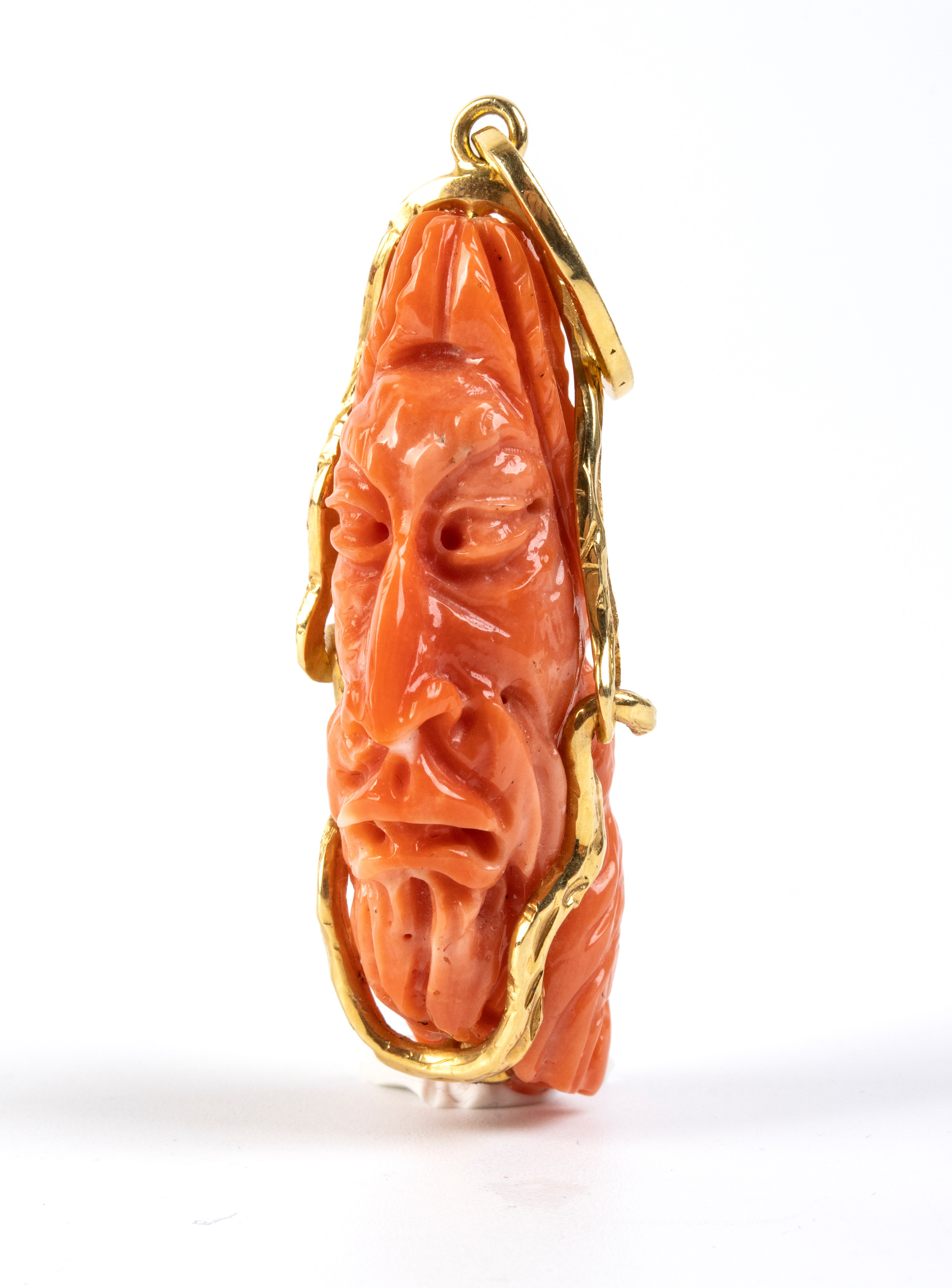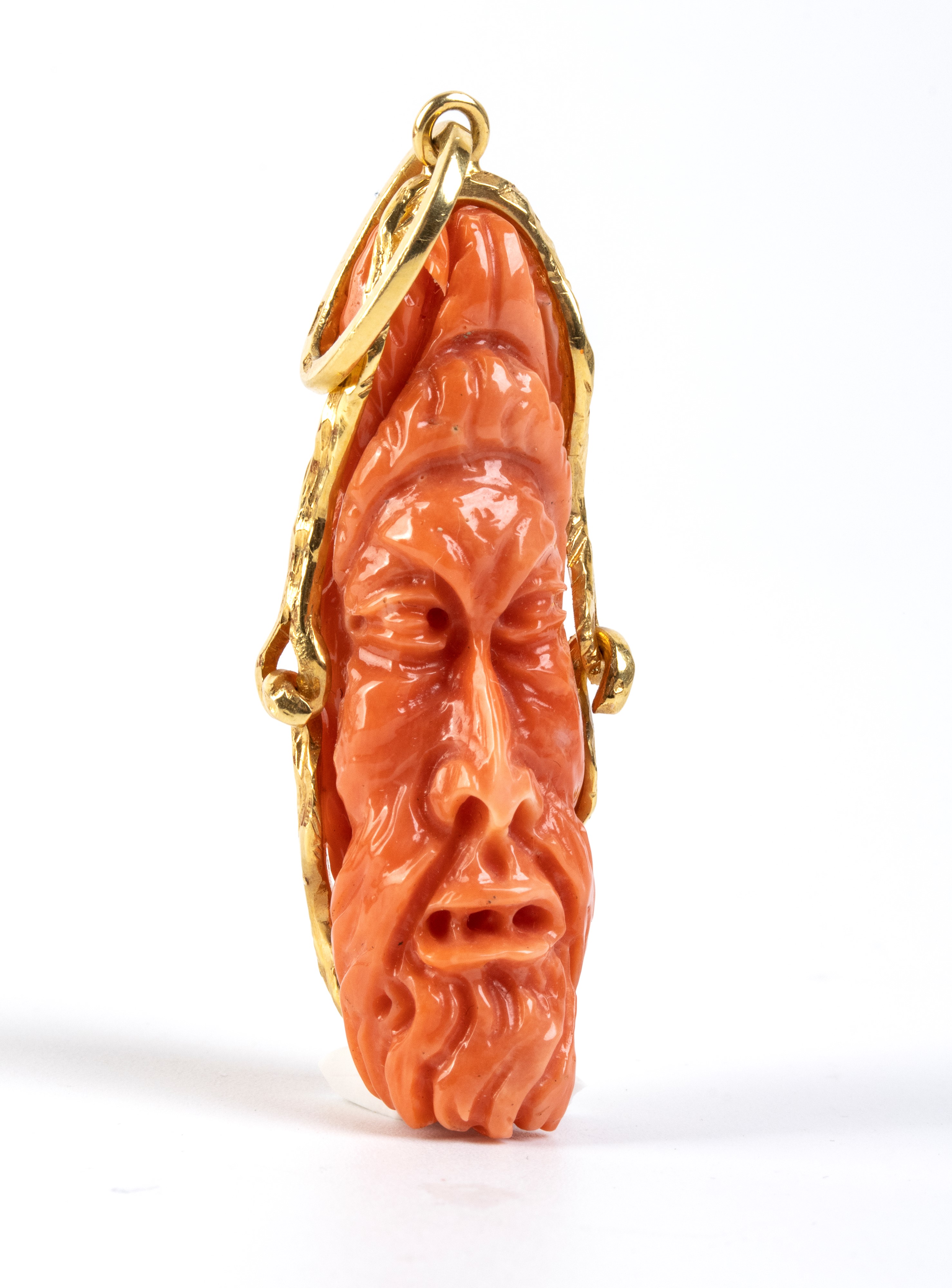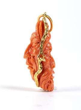 scultura antropomorfa bifronte realizzata in corallo Cerasuolo (Corallim Elatius), montaggio in oro giallo 18k.