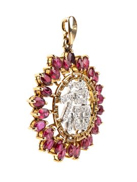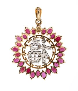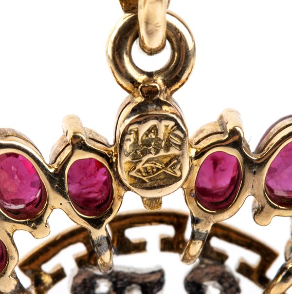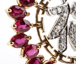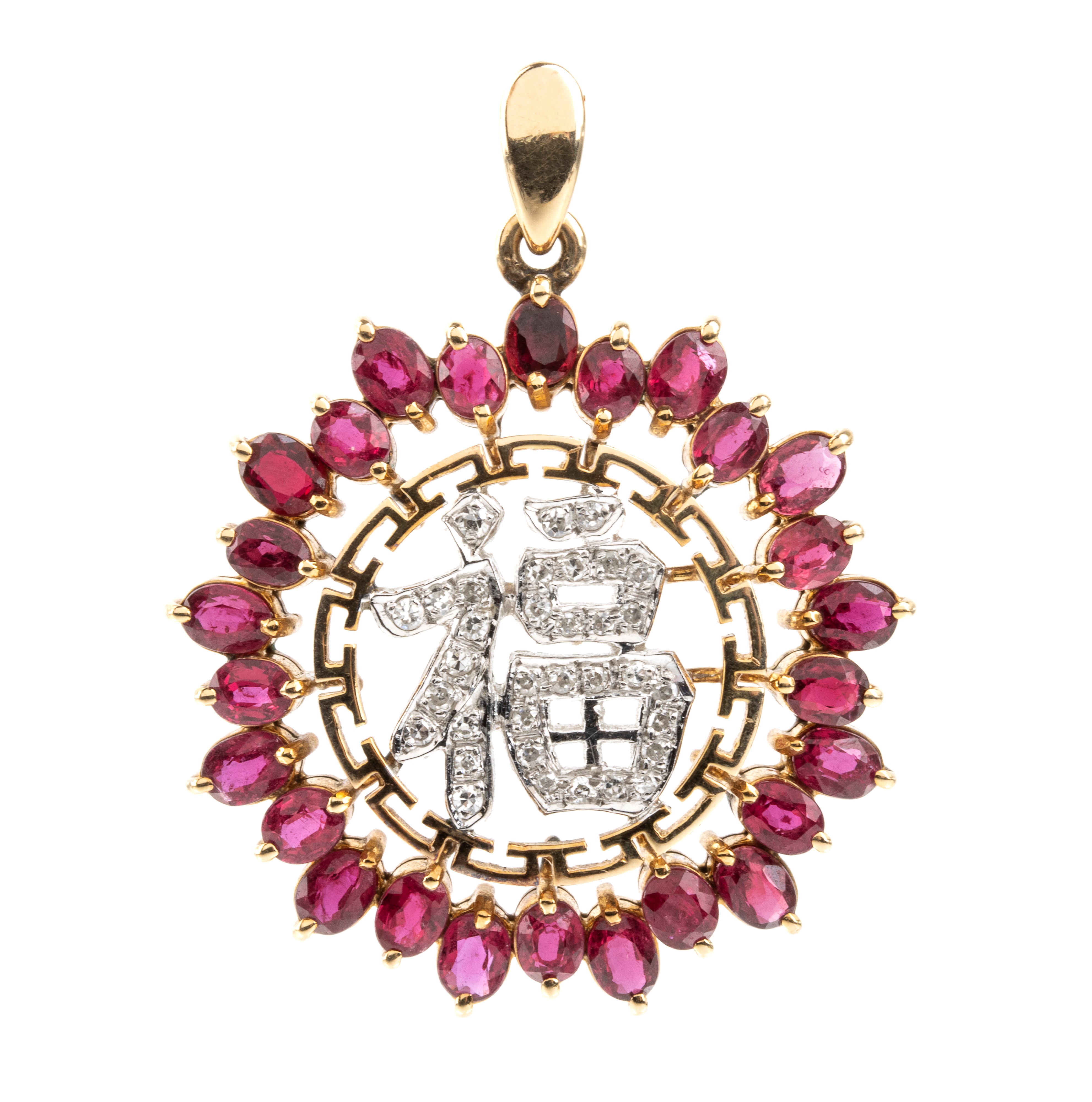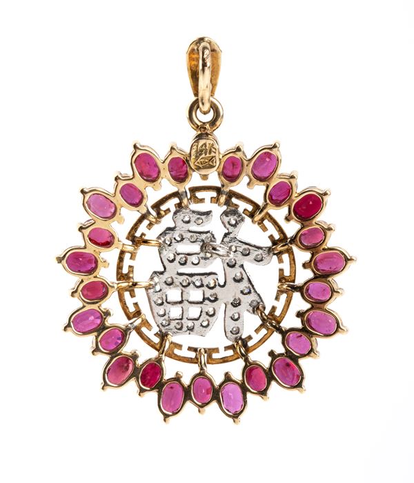 in oro giallo ed oro bianco 14k, con iscrizione centrale in caratteri orientali in diamanti incorniciata da rubini.