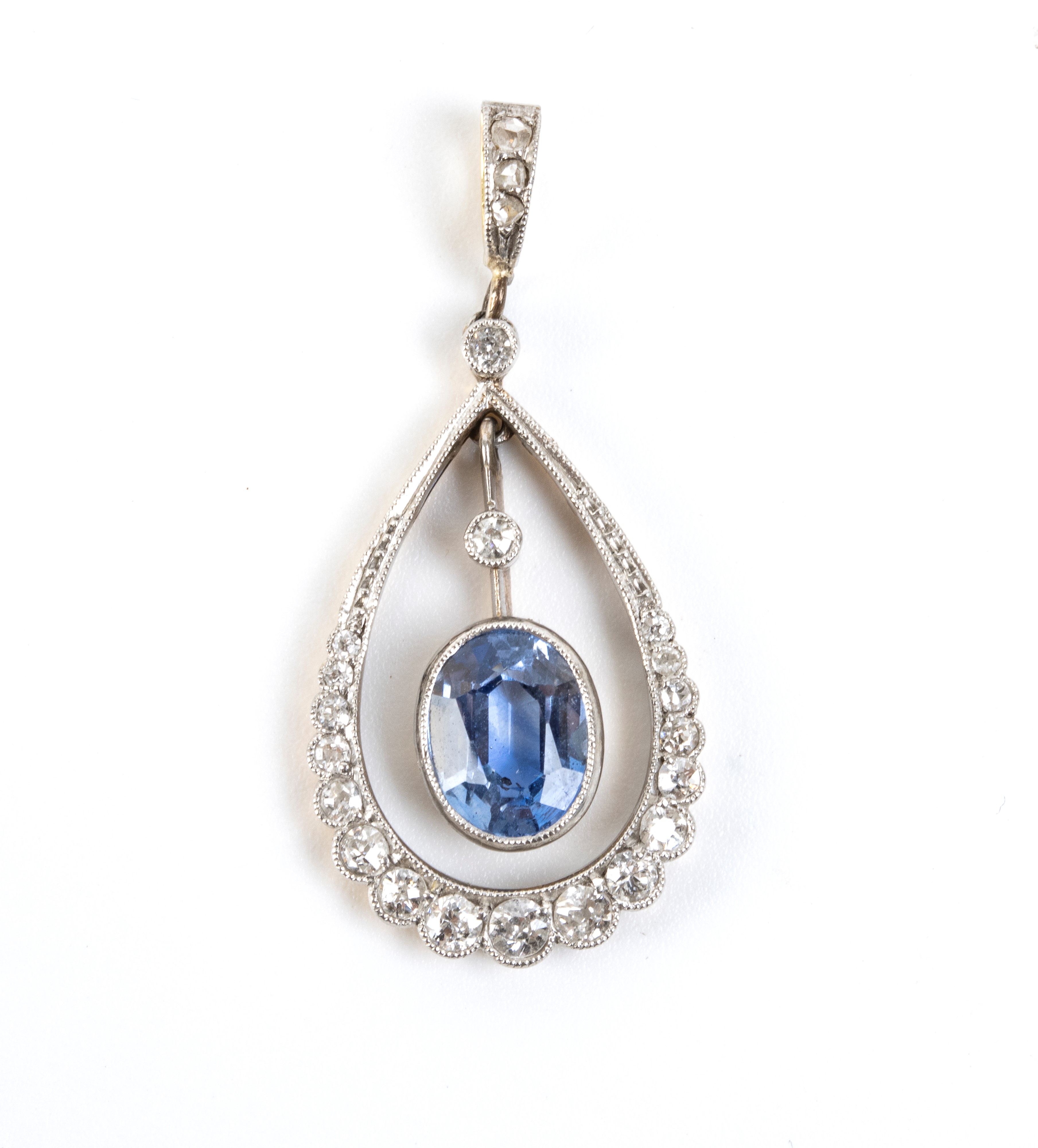 a forma di goccia, decorato con diamanti taglio a rosa e taglio old mine, al centro è sospeso uno zaffiro.