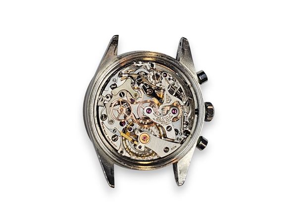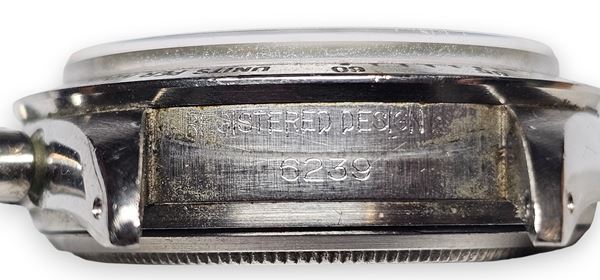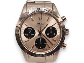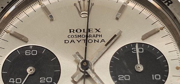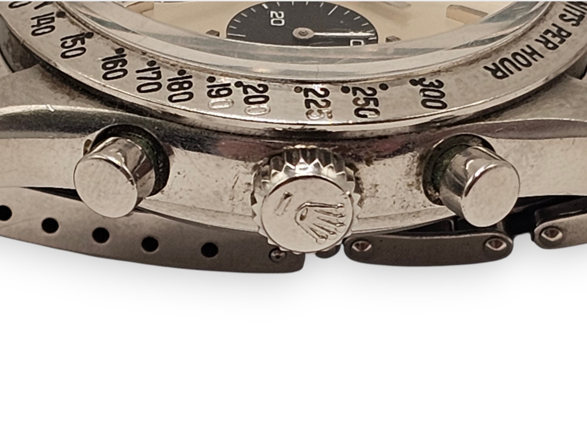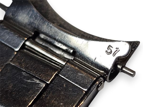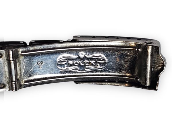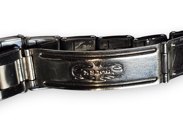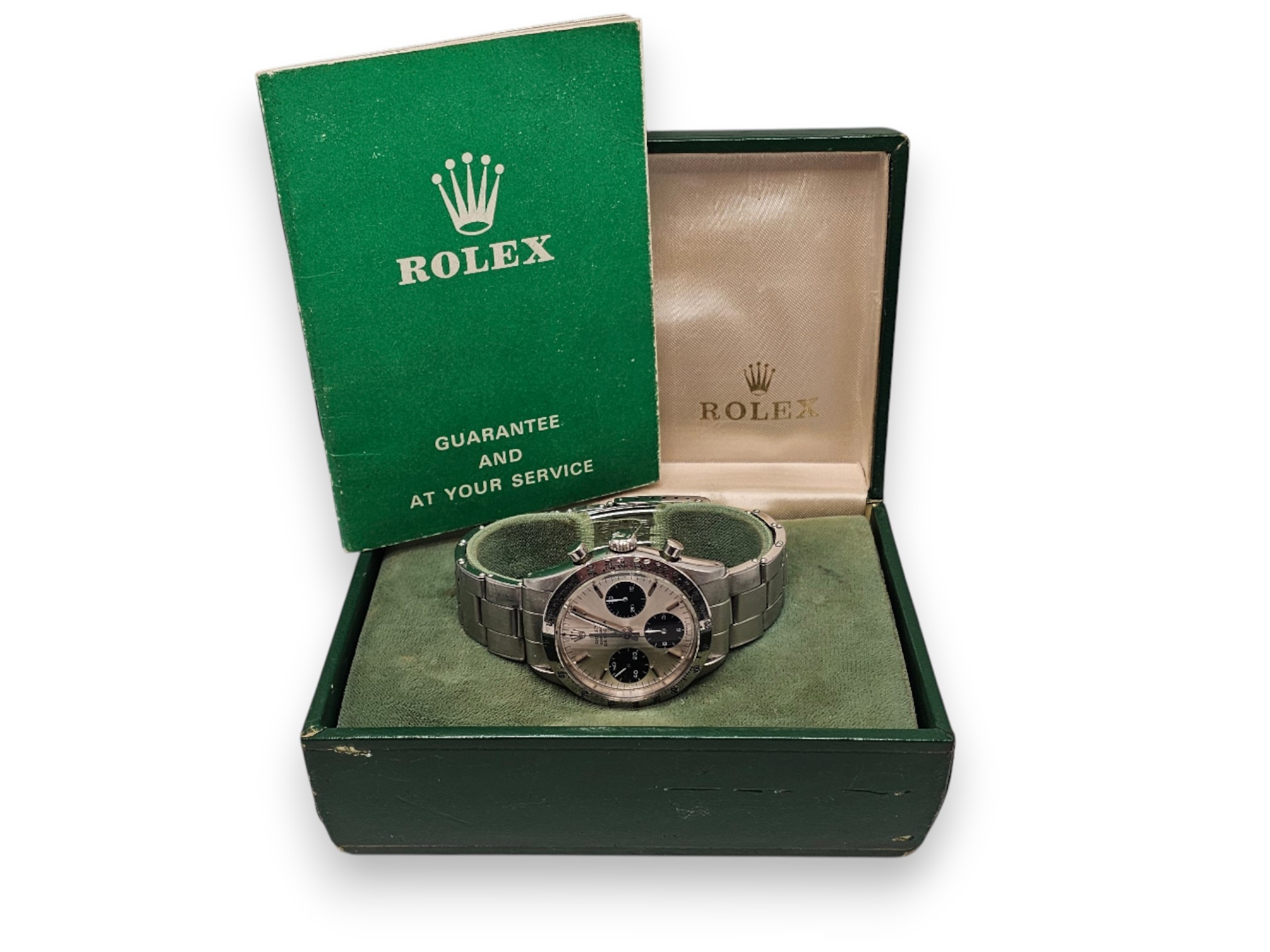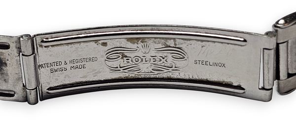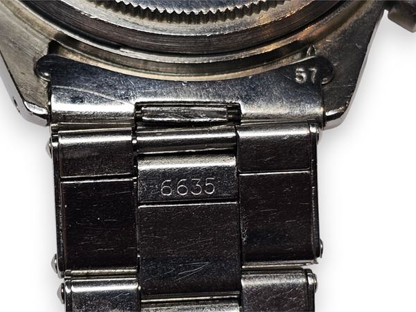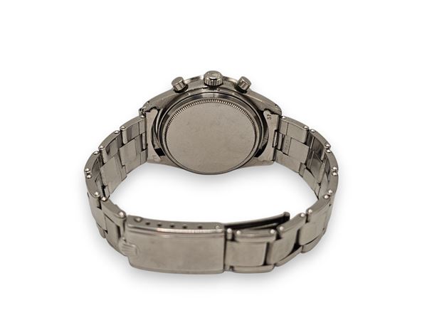 con cassa in acciaio, pulsanti a pompa e corona a vite, quadrante con scritta nera "ROLEX COSMOGRAPH DAYTONA" su fondo argento e contatori neri, bracciale in acciaio a rivetti, referenza 6635, finali 57, fibbia deployante 1/69. Movimento manuale calibro 722-1, fondello a vite. Referenza 6239, matricola 1.695.174.