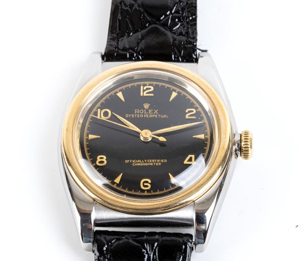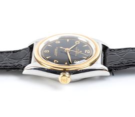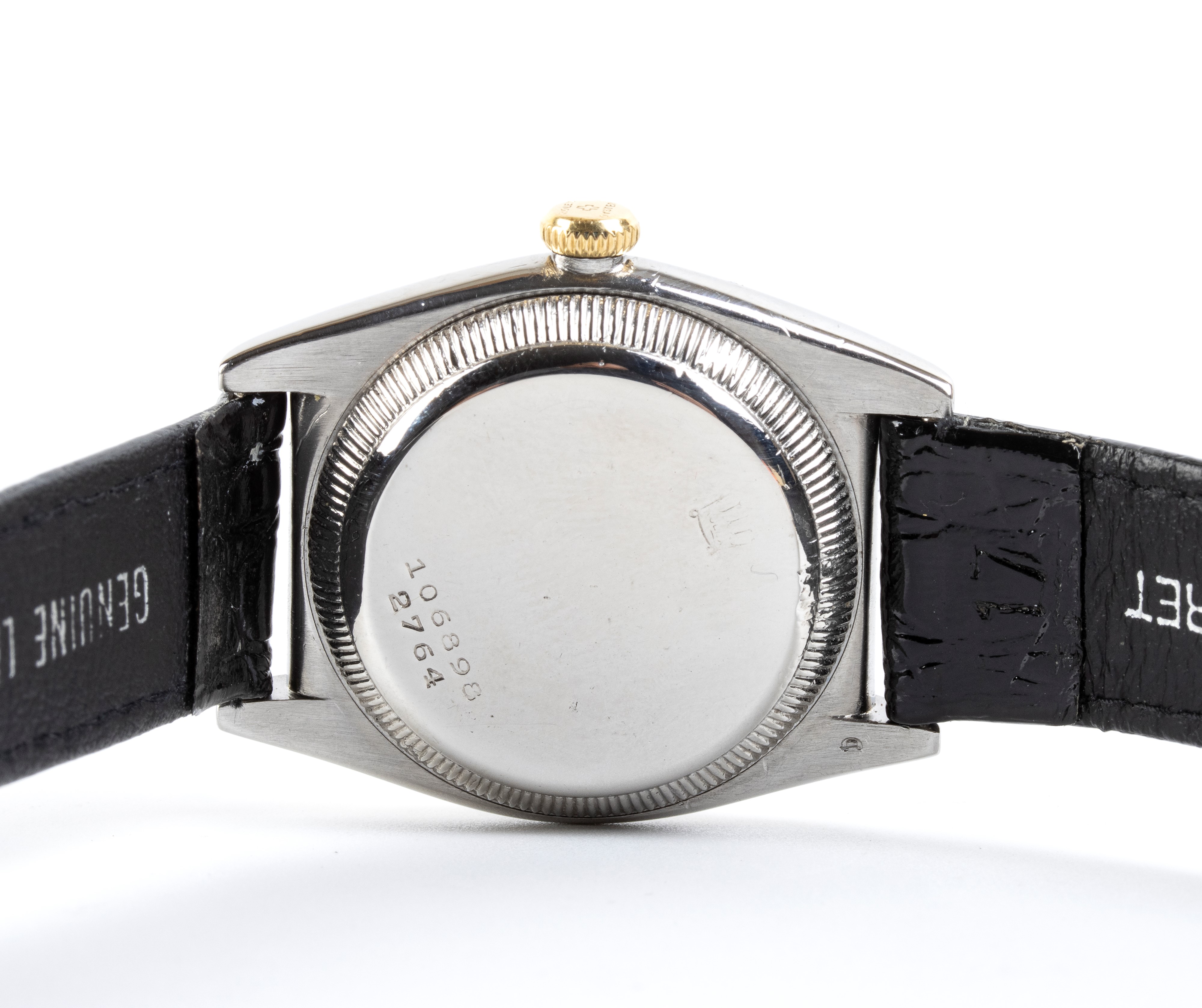 con cassa in acciaio e oro, quadrante nero con sfera a lancia e indici arabi dorati a rilievo. Movimento blindato automatico. Referenza 2764, matricola 106898.