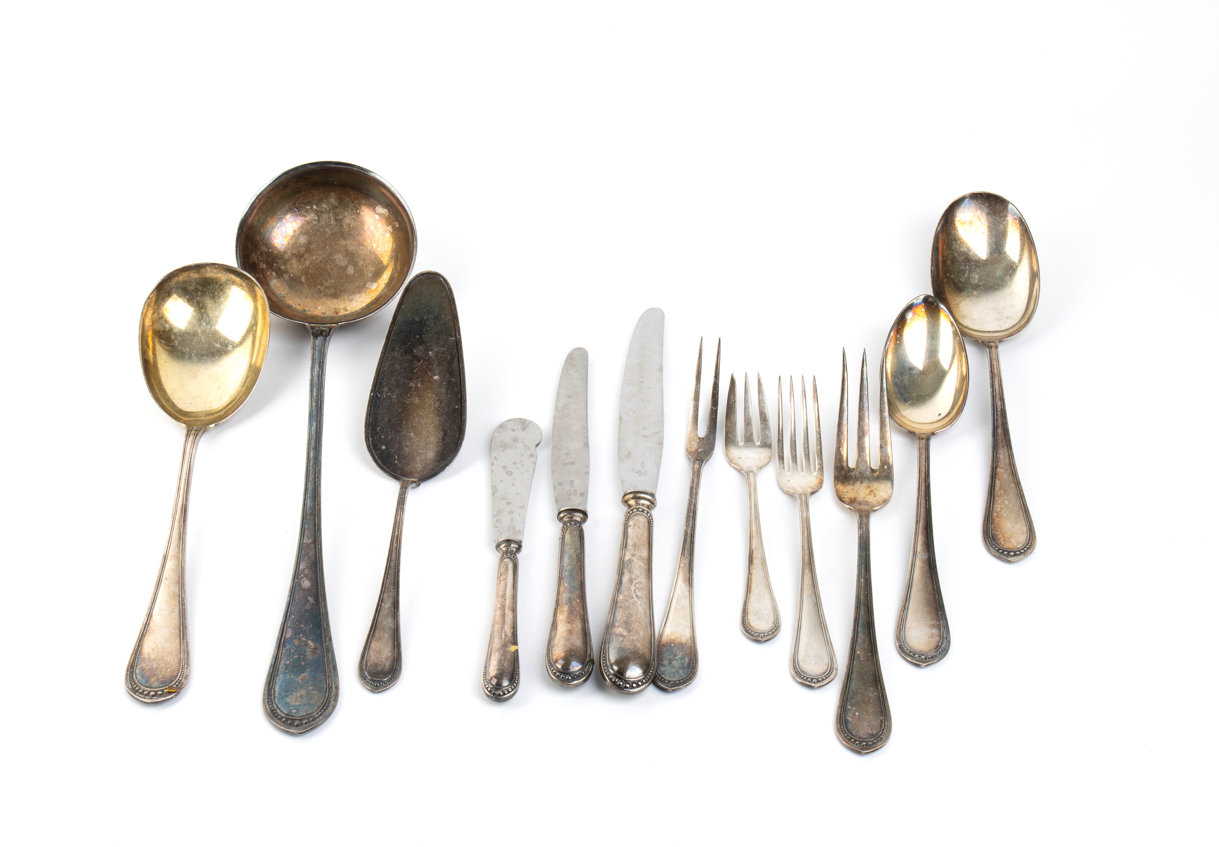 composto da: 11 forchette grandi (lunghezza 21 cm); 11 coltelli grandi con lama in acciaio inox (lunghezza 24,5 cm); 10 cucchiai grandi (lunghezza 21 cm); 10 forchette da frutta (lunghezza 17,5 cm); 12 coltelli da frutta con lama in acciaio inox (lunghezza 21 cm); 12 forchette da dessert (lunghezza 15,5 cm); 11 posate da portata.