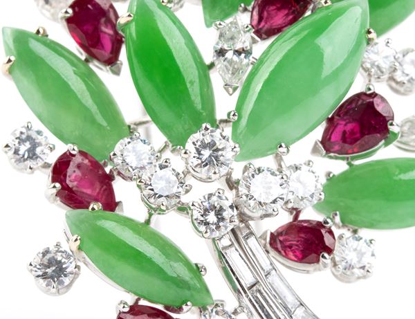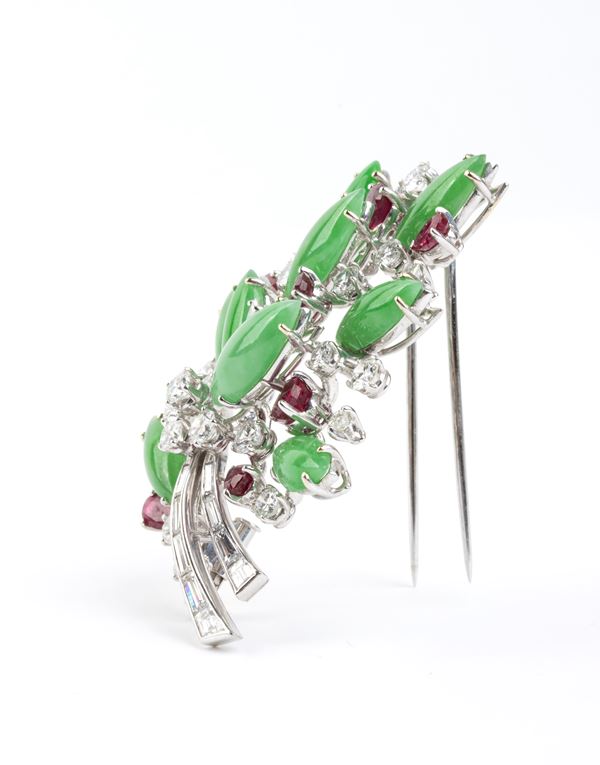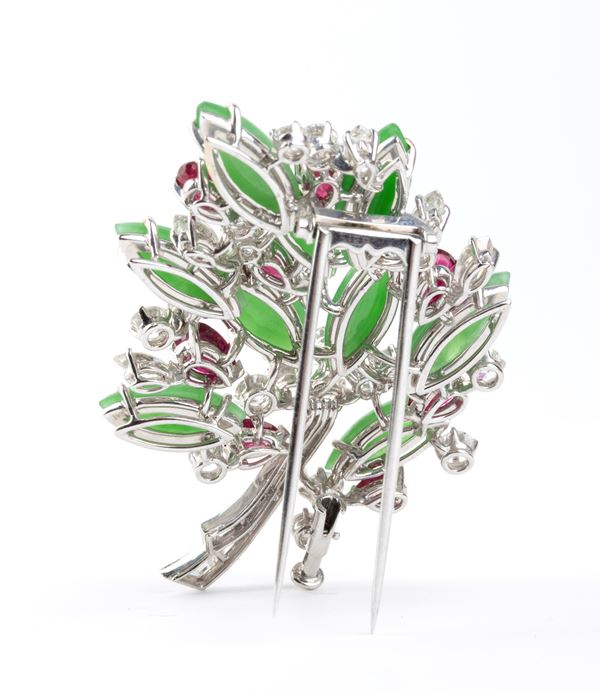 in oro bianco, a motivo di tralcio fiorito, con foglie in giadeite, steli e piccoli frutti in diamanti e rubini.