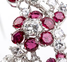 Punteggiata con diamanti di varie forme e tagli, come taglio brillante, taglio baguette e taglio a navetta, stimati per un peso totale di circa 7.50 ct, colore E-F, purezza IF-VVS; e rubini di forma rotonda, taglio composito, per un peso totale di circa 6.80 ct.