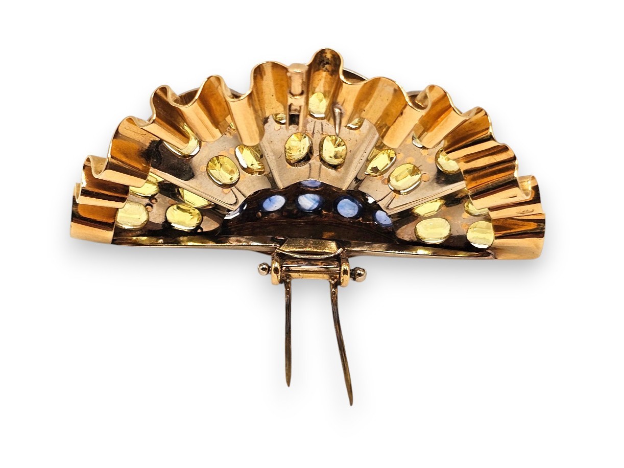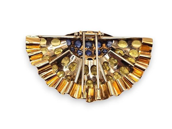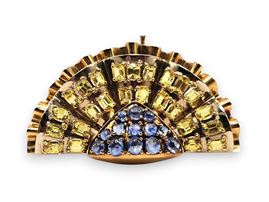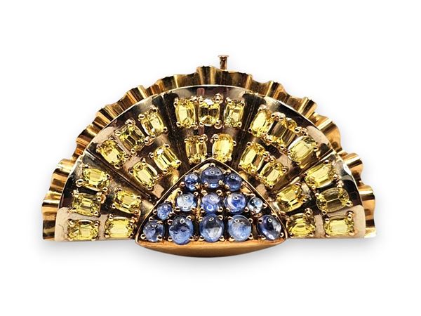 Spilla a ventaglio in oro con zaffiri gialli e blu