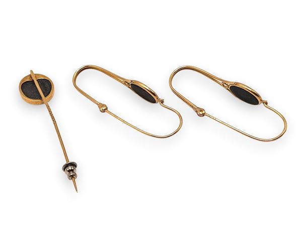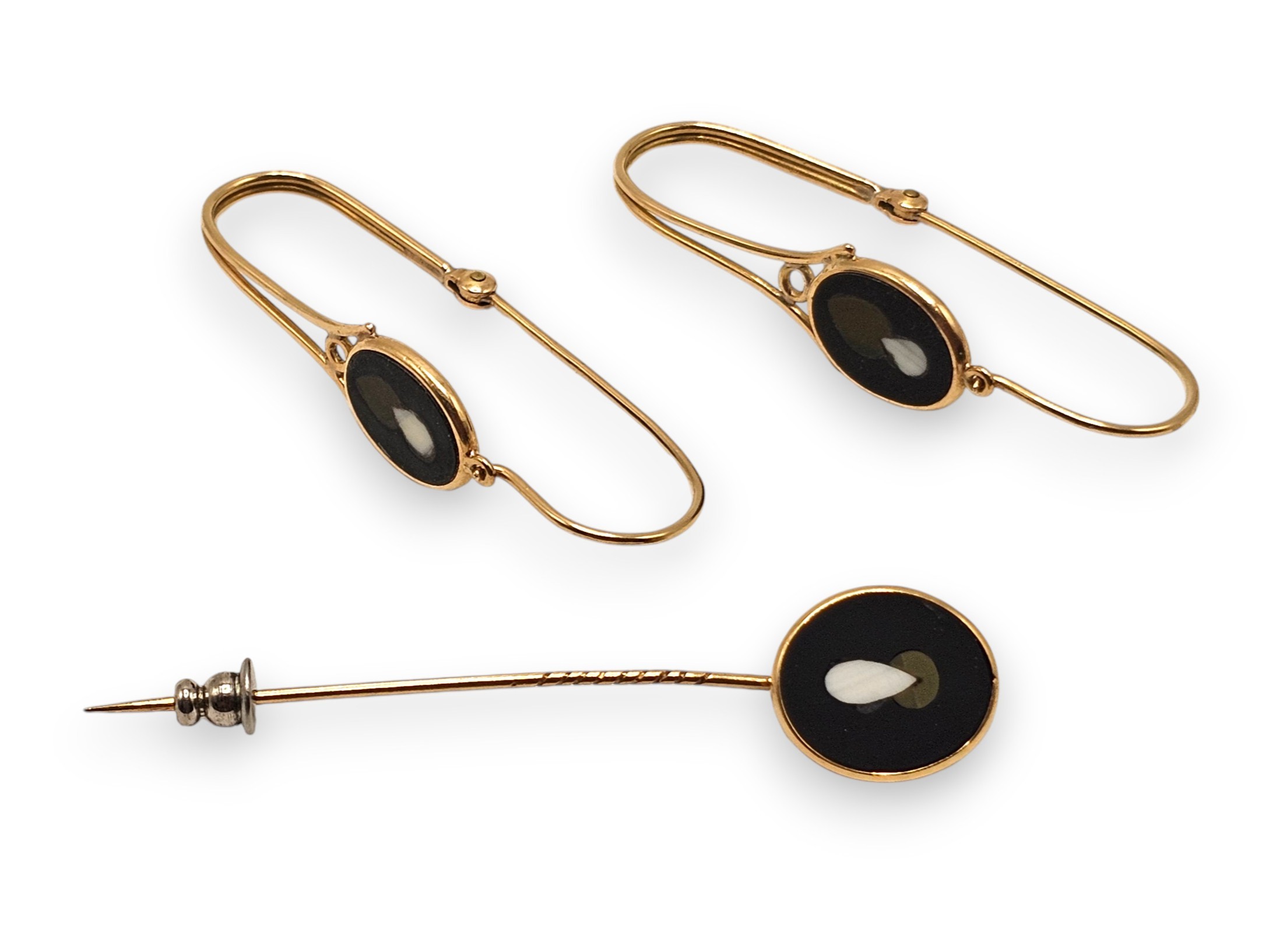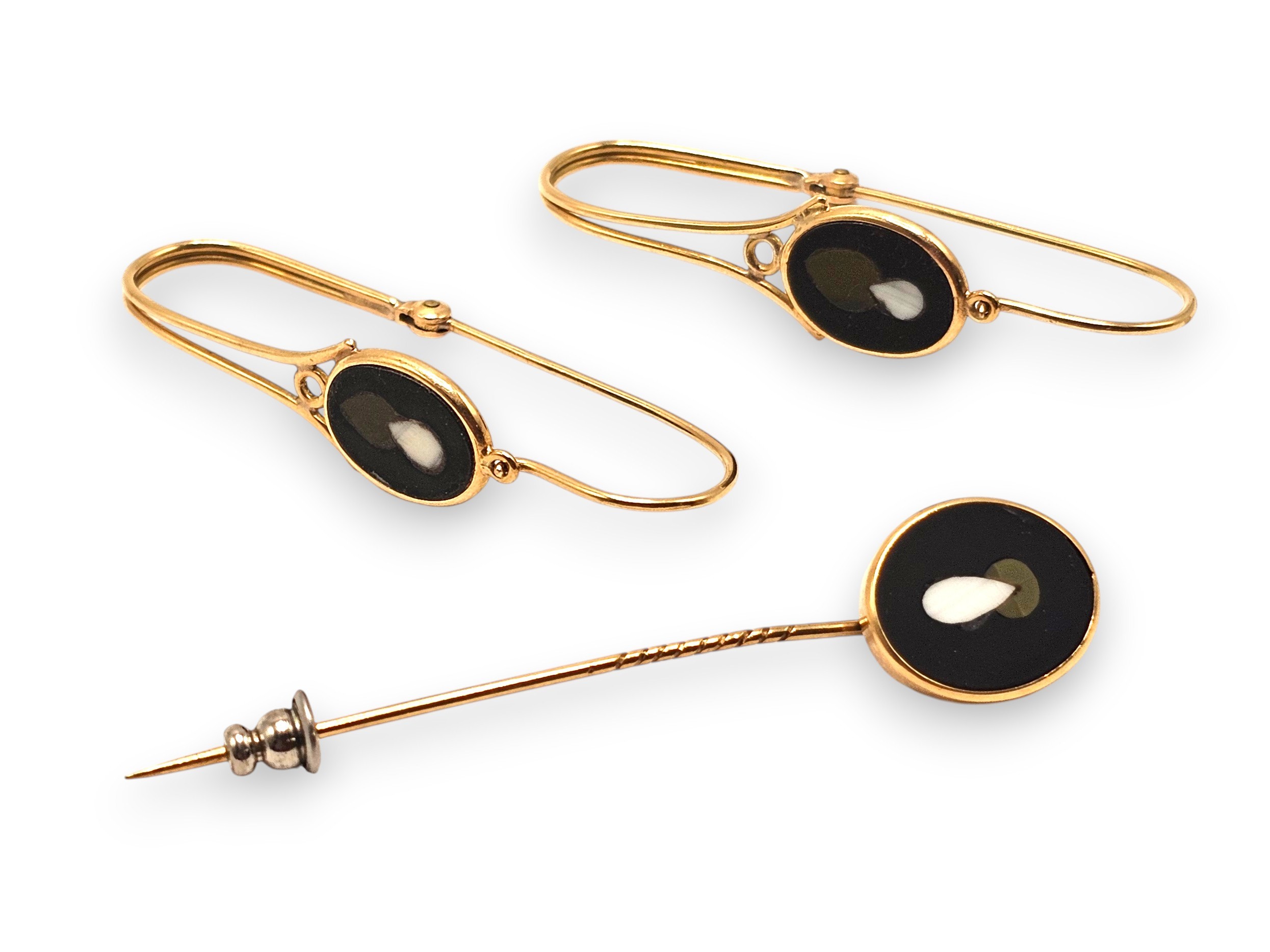 Spilla e paio di orecchini in oro giallo con intarsi in pietre dure, inizio XX secolo