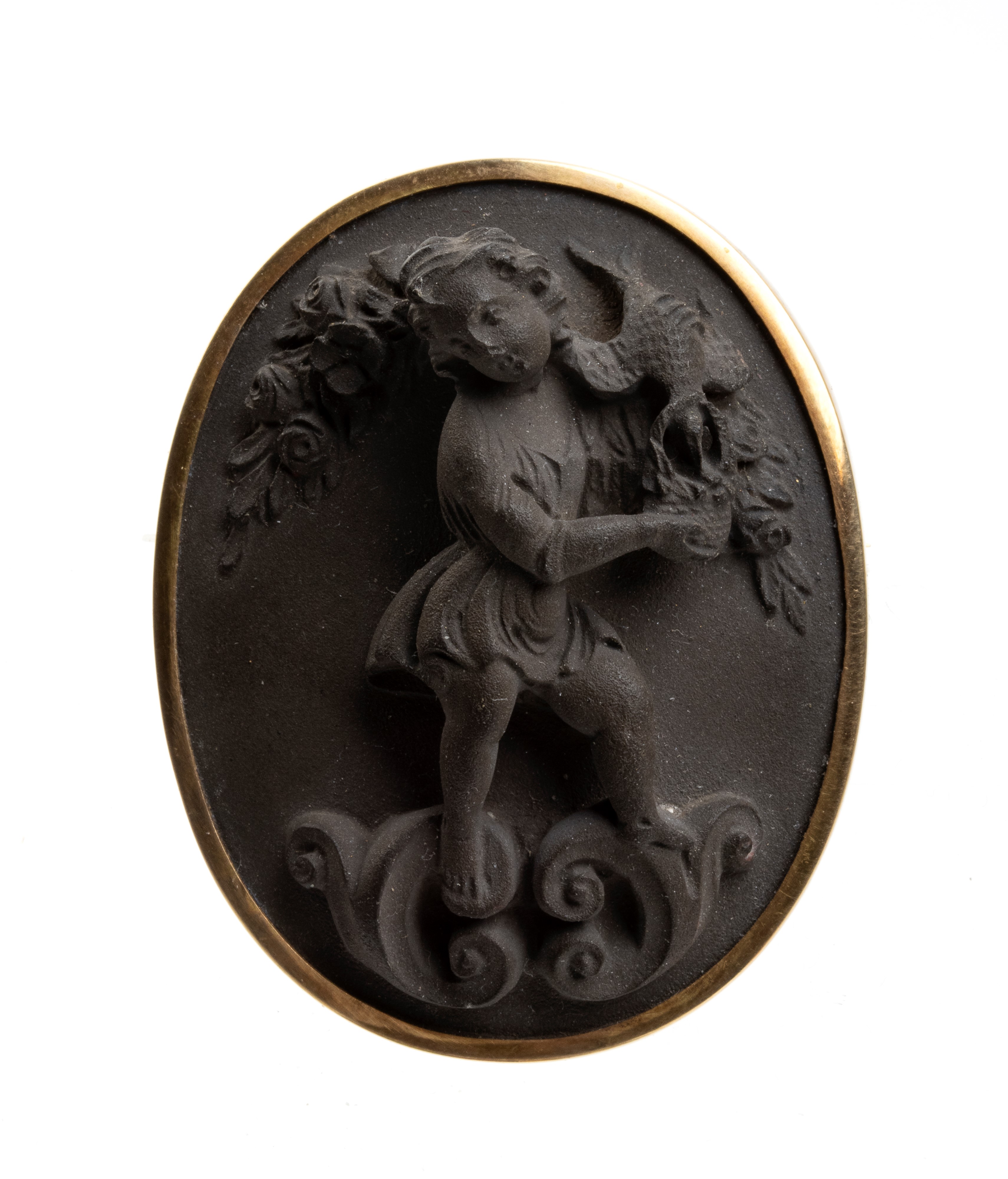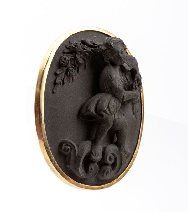 cornice in oro giallo, incastonato con cameo scolpito in lava scura, raffigurante un fanciullo in bassorilievo, stante su una nuvola o volute decorative, colto mentre trattiene saldamente un uccello, che potrebbe rappresentare un’allegoria.