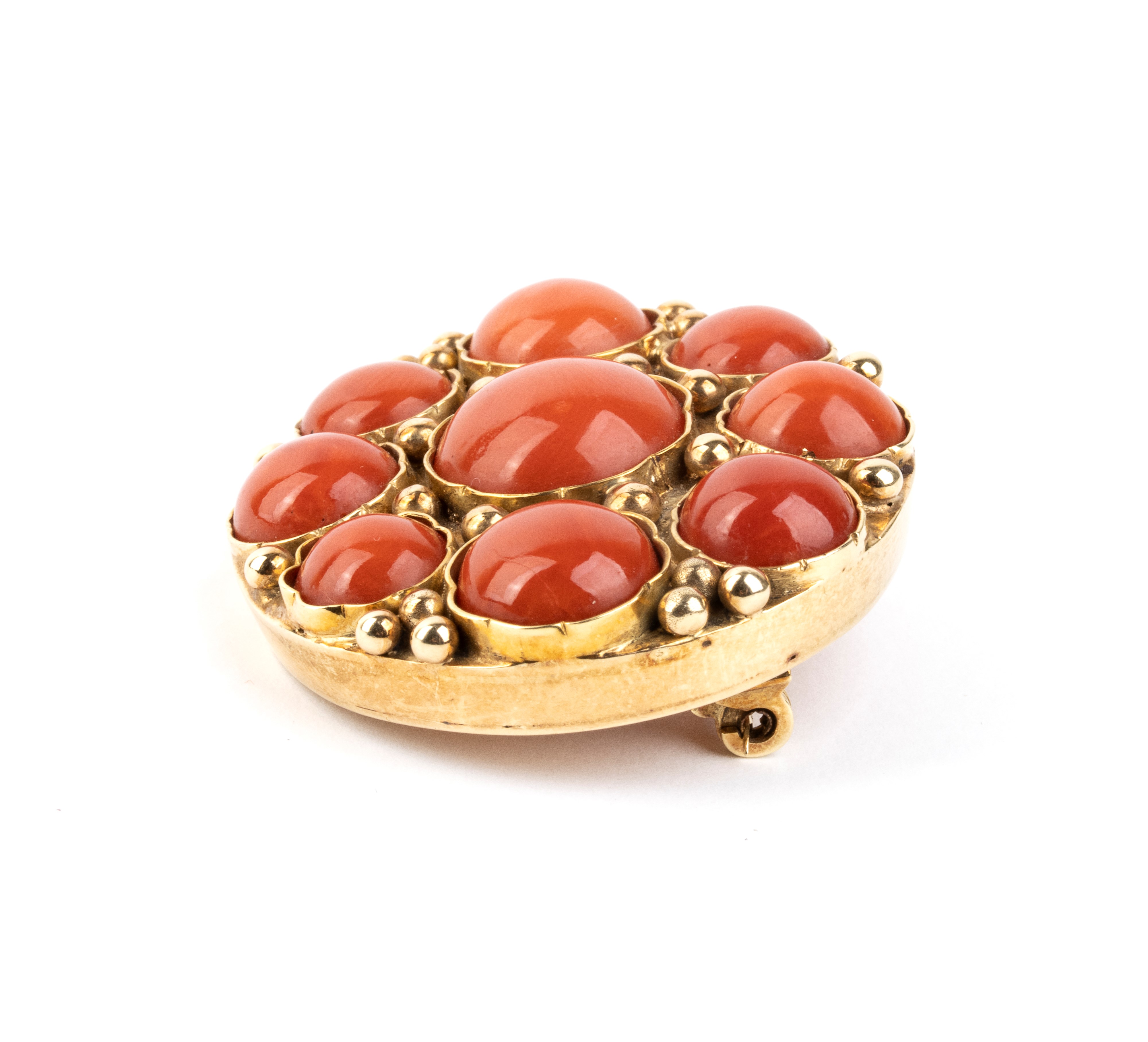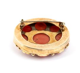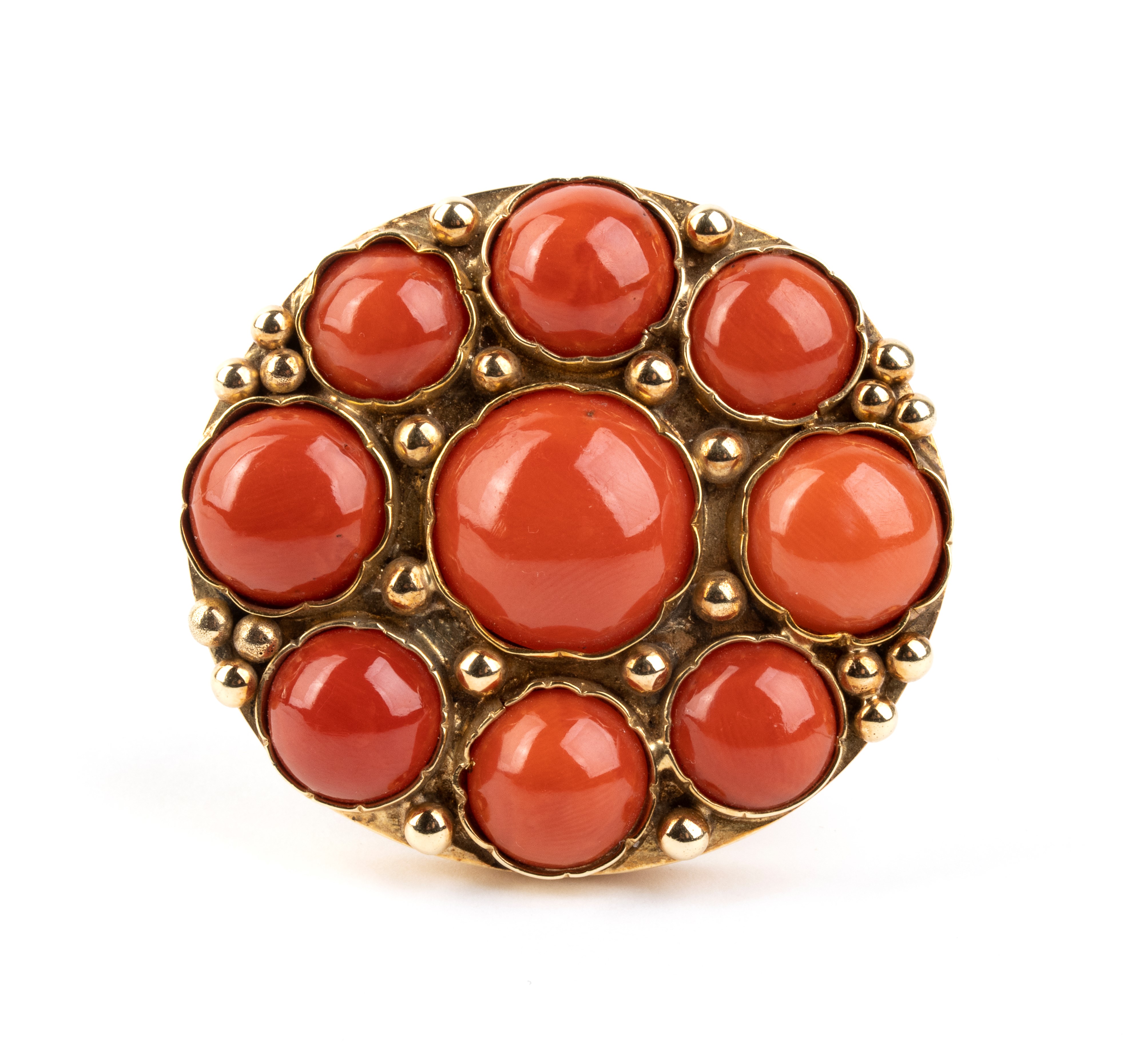 di forma rotonda, in oro giallo, incastonata con cabochon di corallo Mediterraneo (Corallium Rubrum).