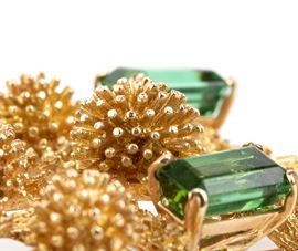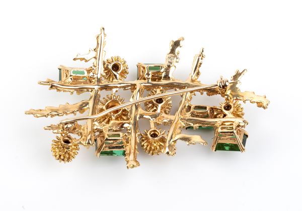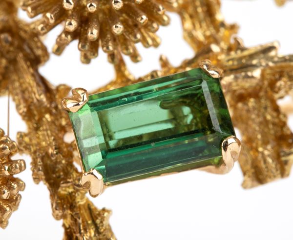 in oro giallo 18k, motivo fantasia con intreccio di rami, fiori stilizzati e tormaline verdi.