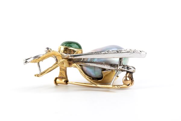 Spilla insetto in oro con tormalina, perla, diamanti e rubini