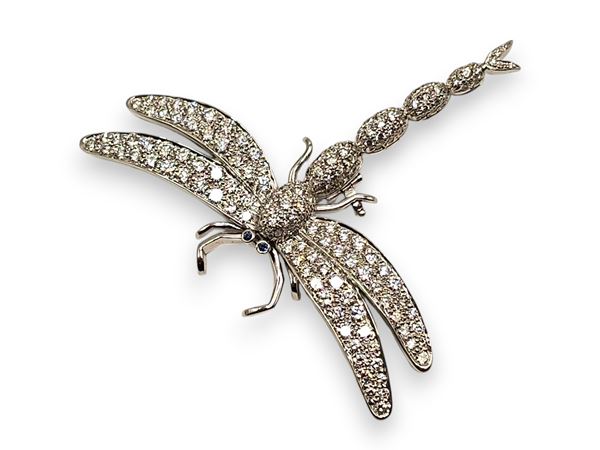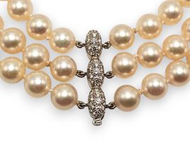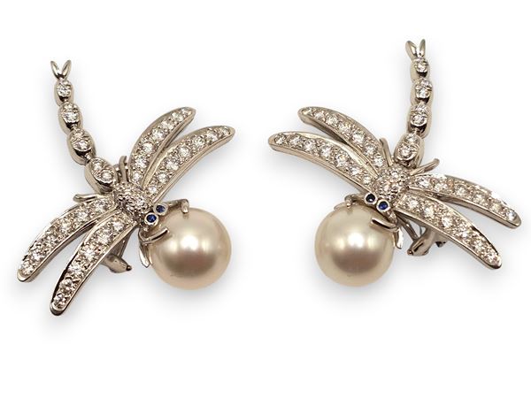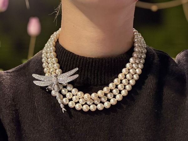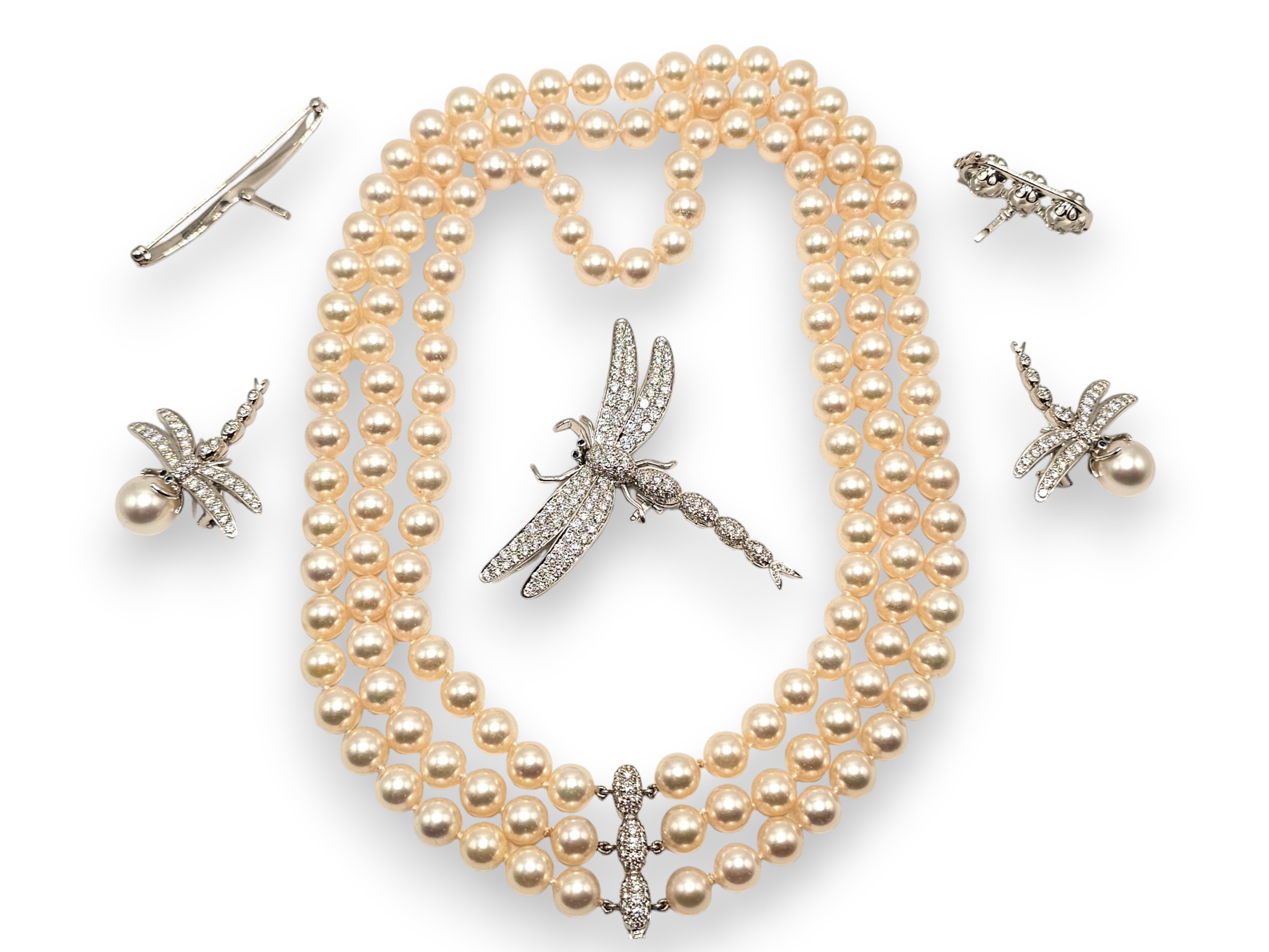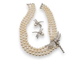 Il lotto è composto da: una collana a tre fili di perle coltivate d'acqua salata con chiusura in platino e diamanti; un paio di orecchini ed una spilla a forma di libellula in platino e pavé di diamanti su ali e corpo e occhi in piccoli zaffiri.