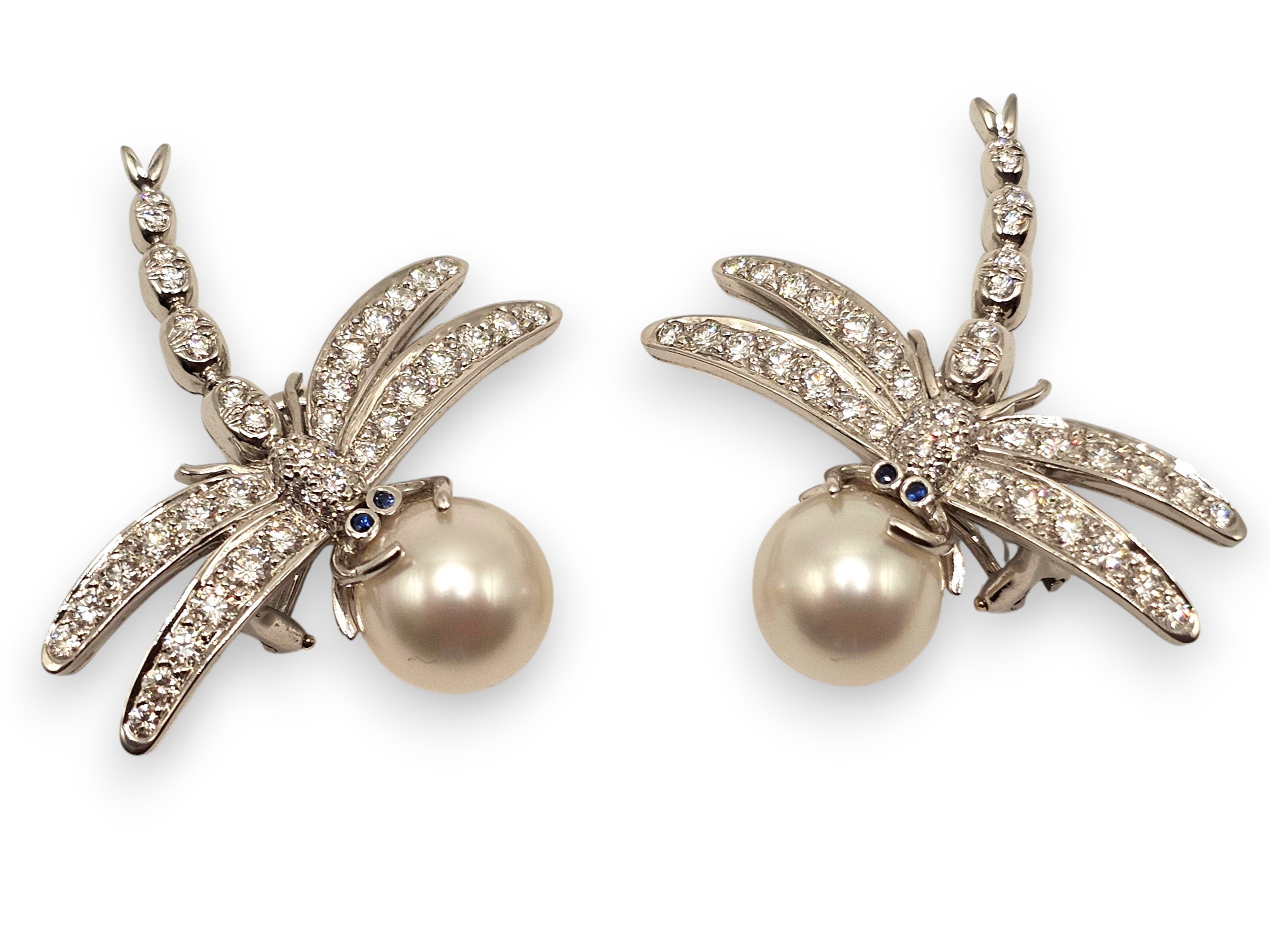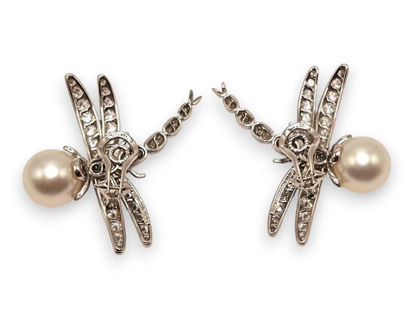Parure Dragonfly con orecchini e collana in platino, diamanti e perle