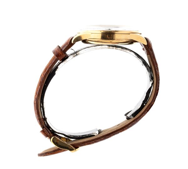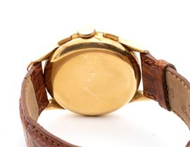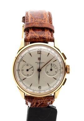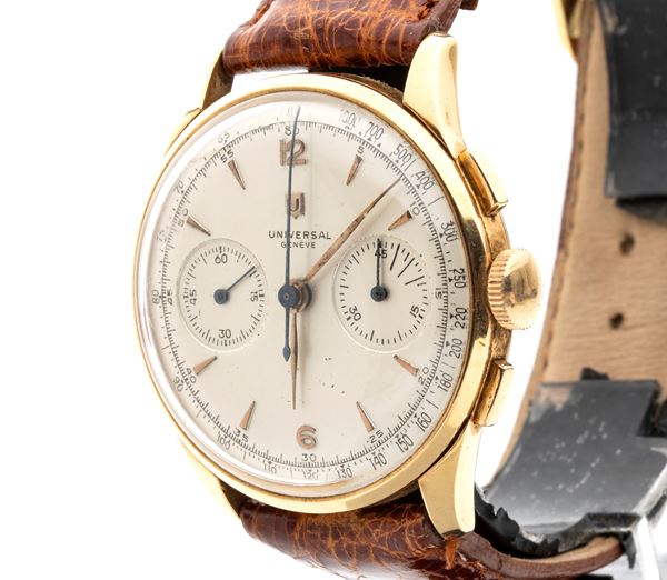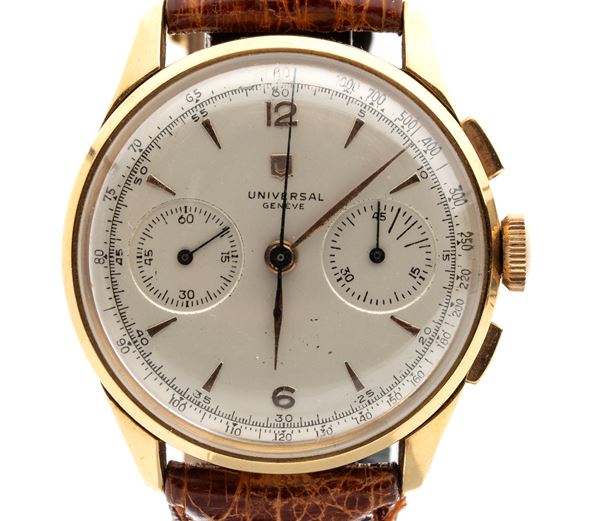 con cassa in oro commerciale, quadrante firmato "UNIVERSAL GENÈVE", con cinturino in pelle e fibbia in metallo dorato. Calibro cronografico meccanico manuale 287 Universal Genève.