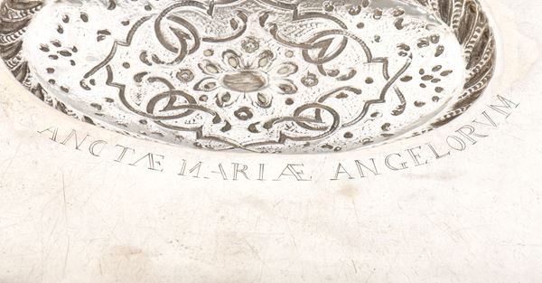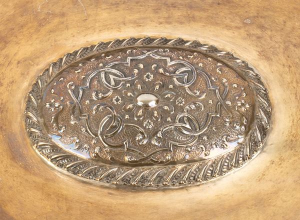 di forma ovale realizzato a sbalzo e cesello, caratterizzato da una superficie ampia e lucida, circondata da una tesa riccamente lavorata. Il bordo presenta un motivo con un decoro continuo di volute, racemi floreali e un bordo esterno a cordoncino. Al centro un medaglione ovale in leggero rilievo finemente decorato a motivi fitomorfi o a volute.