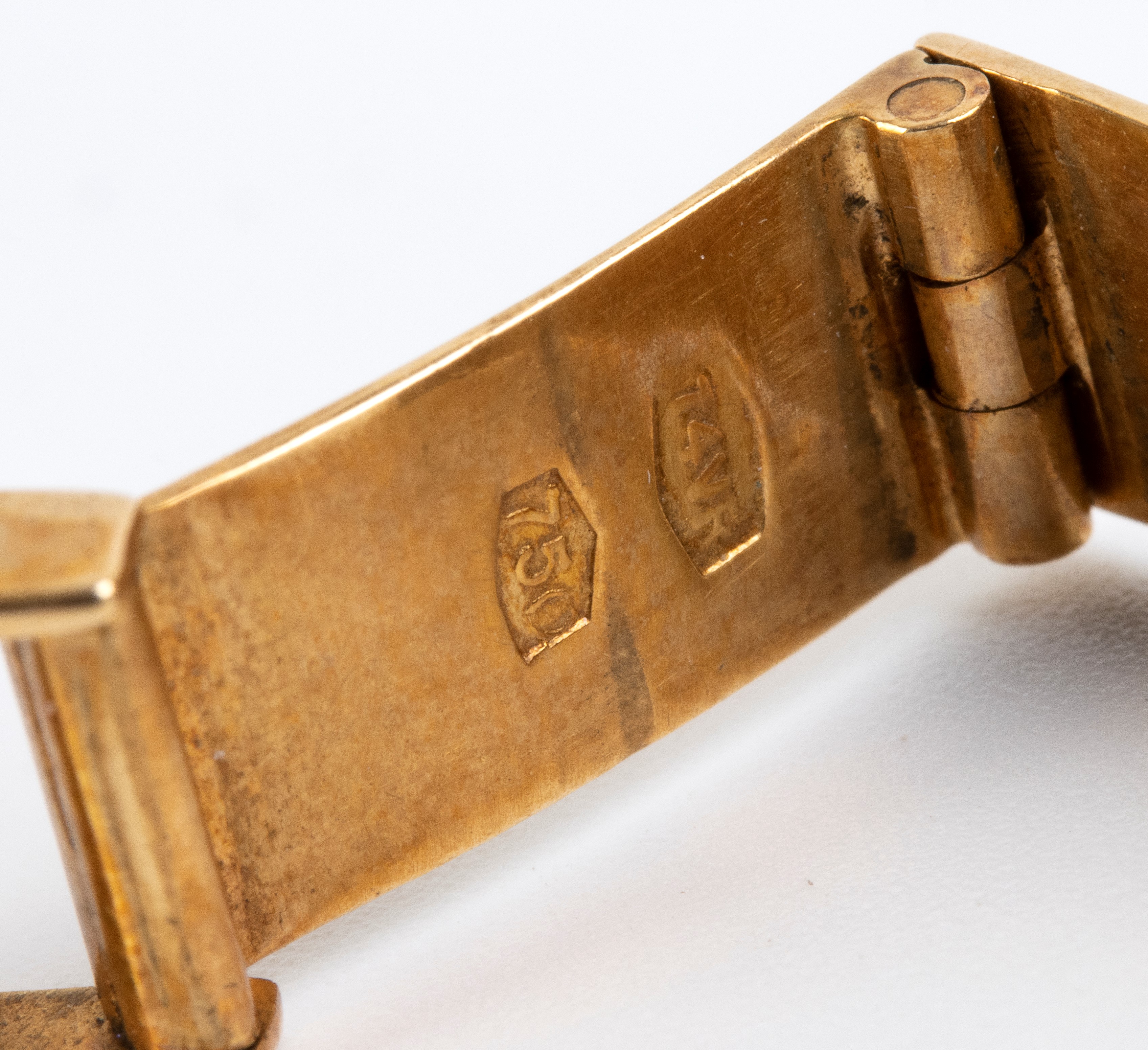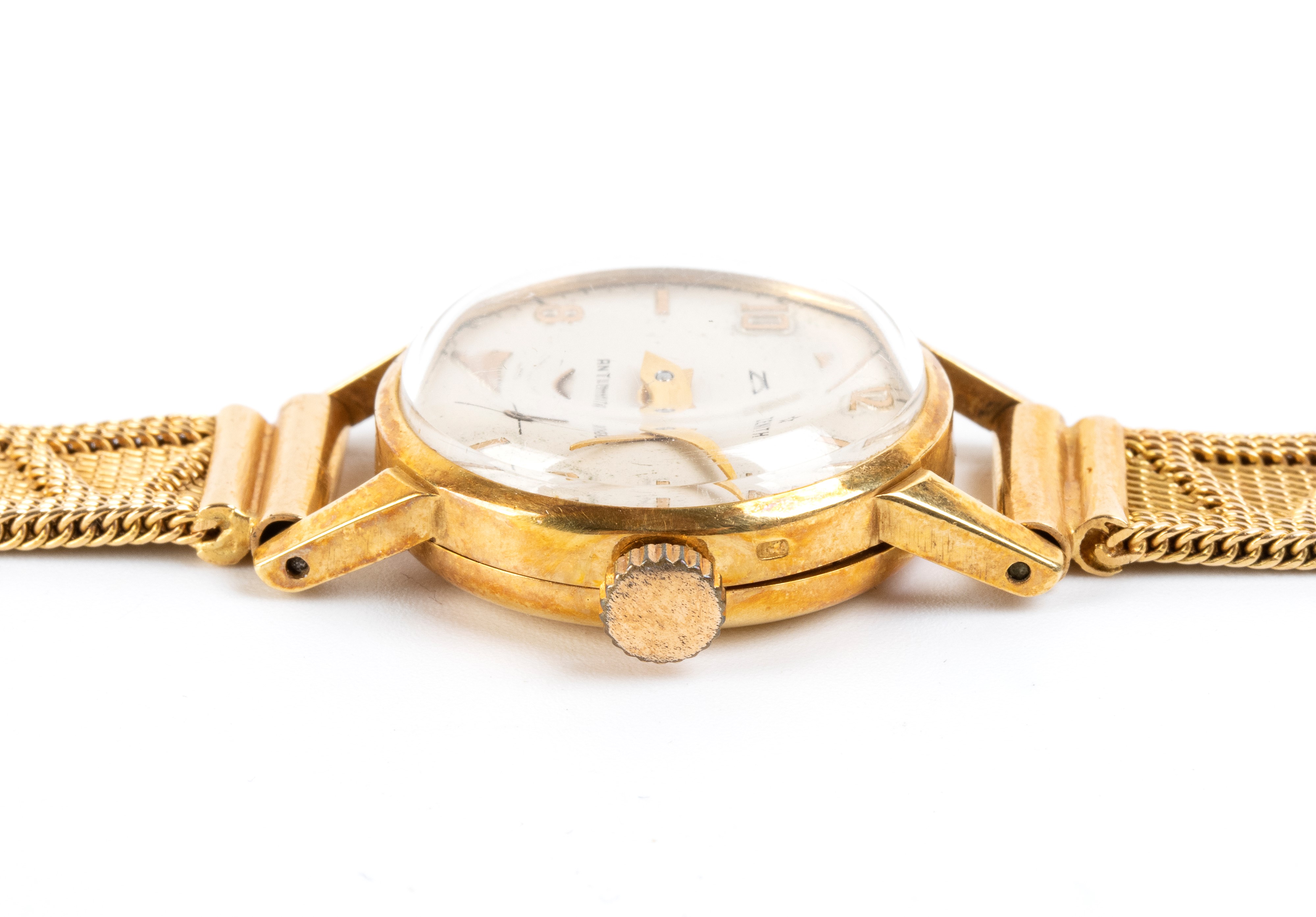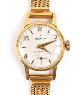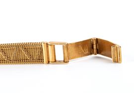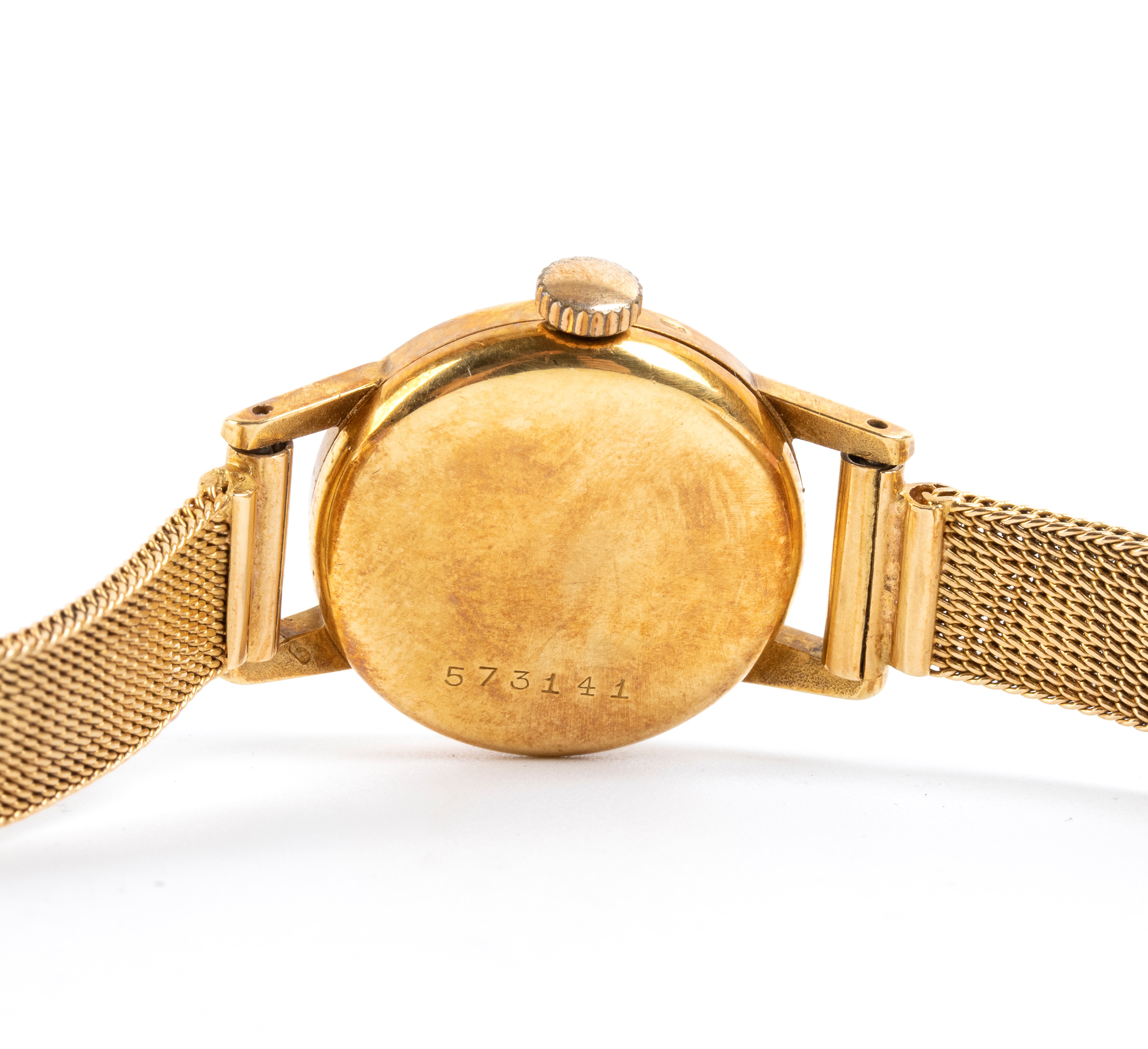 con cassa oro, quadrante bianco crema con secondi a ore 6, indici arabi e sfera a gladio dorata, bracciale a maglia in oro. Movimento meccanico manuale. Matricola 573141.
